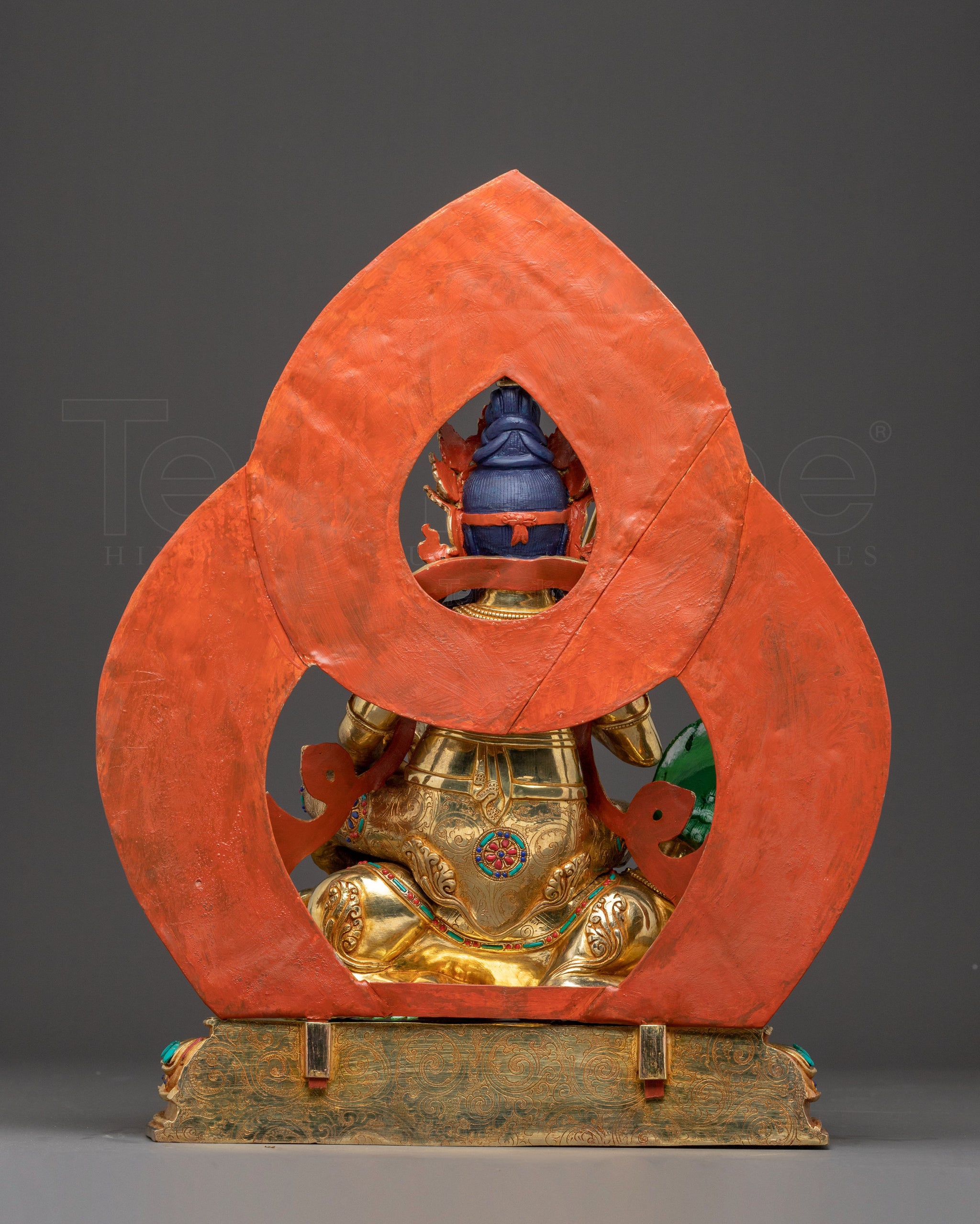 This Radiant Namtoshe Statue, the Divine Protector of the Dharma, stands at 19.3 inches tall and weighs 9.95 kg. Expertly made from copper, covered with a triple layer of 24K gold gilding, and carved with deeply engraved carvings that produce a magnificent 3D-like effect. This sculpture, adorned with gemstones and handcrafted by expert Nepalese artisans, elegantly symbolizes Himalayan Buddhism's sacred traditions, making it an appropriate addition to altars, meditation places, or sacred collections.