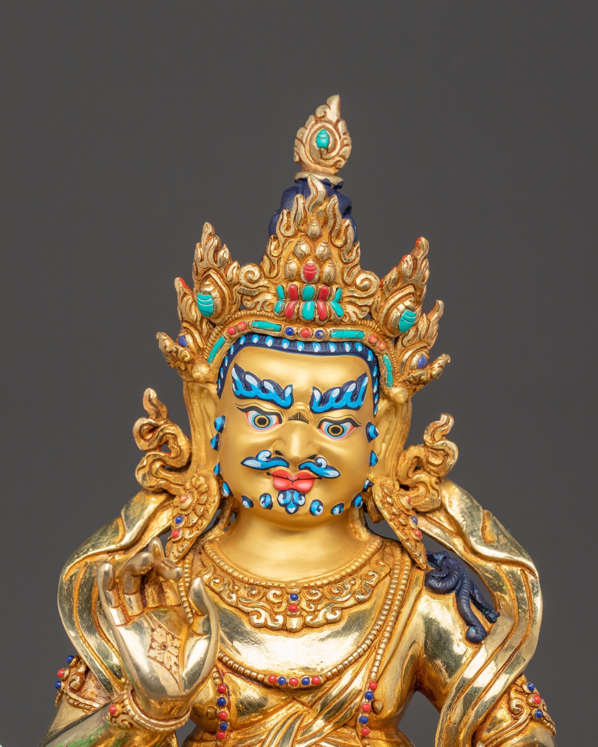 Namtoshe is shown sitting on a roaring lion resting on a lotus. He is depicted holding a triumph banner in his right hand and a wish-granting jewel for a mongoose in his left, establishing him as the wealthy deity. In honor of the Five Transcendental Buddhas, he is donning a crown with five prongs. In addition to sporting jewelry, he is dressed in a long, flowing scarf. For individuals pursuing both material and spiritual wealth, this exquisitely sculpted statue is not only a magnificent work of art but also a potent sign of spiritual protection and development.
