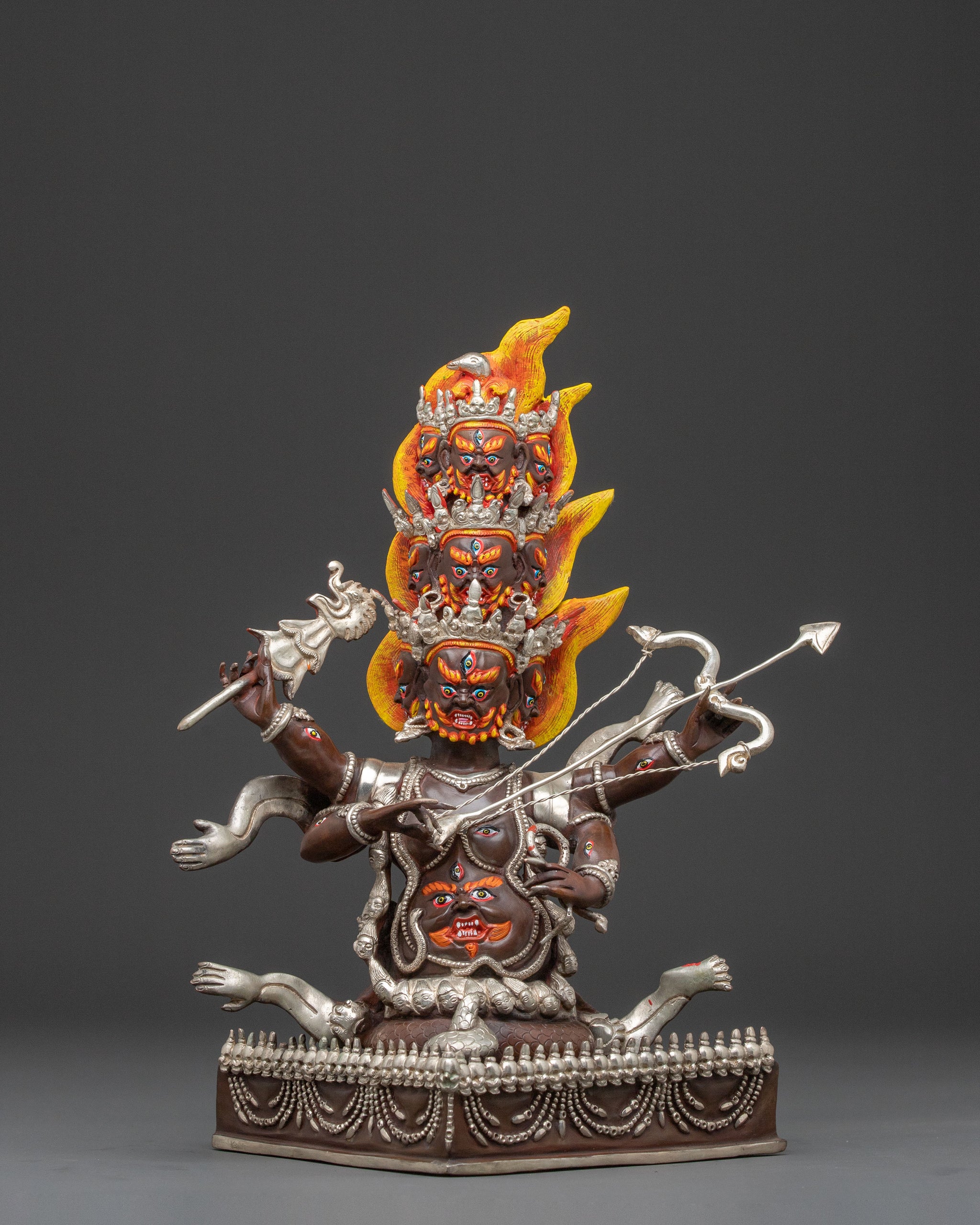 Rahula, often depicted with nine heads and numerous arms, is a significant Dharmapala (Dharma protector) in Tibetan Buddhism. Originally a naga king and later subdued by Padmasambhava, he swore an oath to protect the Buddhist doctrine. His fearsome appearance is not meant to instill fear in practitioners but to symbolize his resolute power in overcoming obstacles and opposing forces.