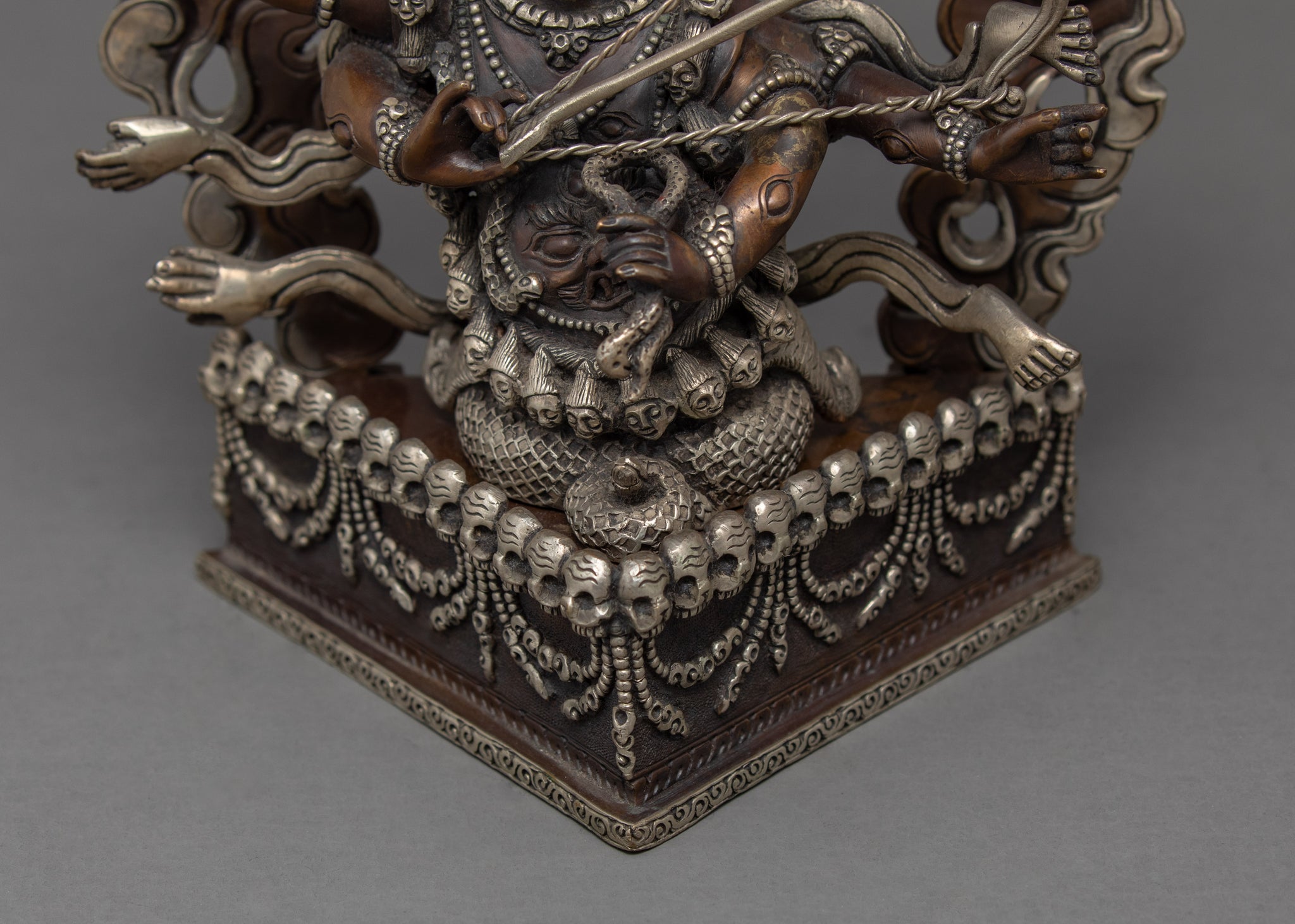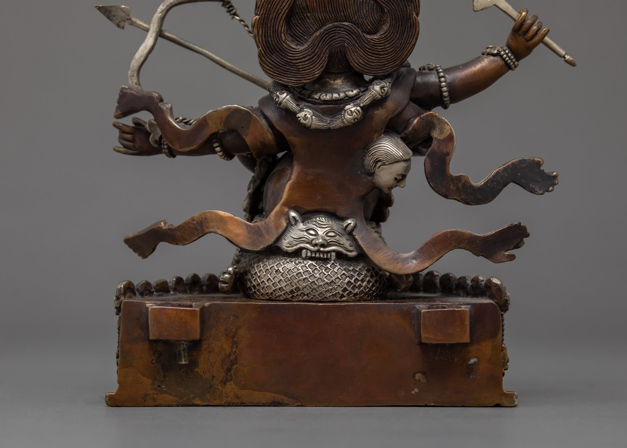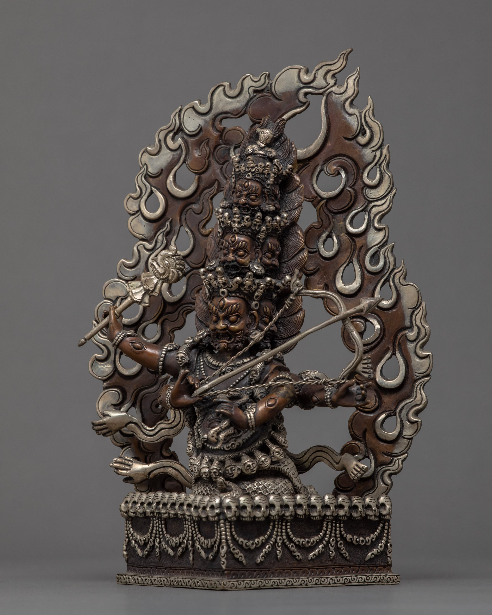 We have exquisitely hand-carved the statue of Rahula in a pure oxidized copper body and plated it with silver. You can use the sculpture for many aspects like meditation, yoga, and home decor. We have depicted a deity encircled with fire flame, holding a bow and arrow in his hands. The materials used to sculpt the statue are of high quality and will last many years without damage and scratches. We are the artist of Kathmandu valley whose artisan has passed from generation to generation, reflecting Buddhism. This statue will be a tremendous gift from Nepal to a practitioner like you.