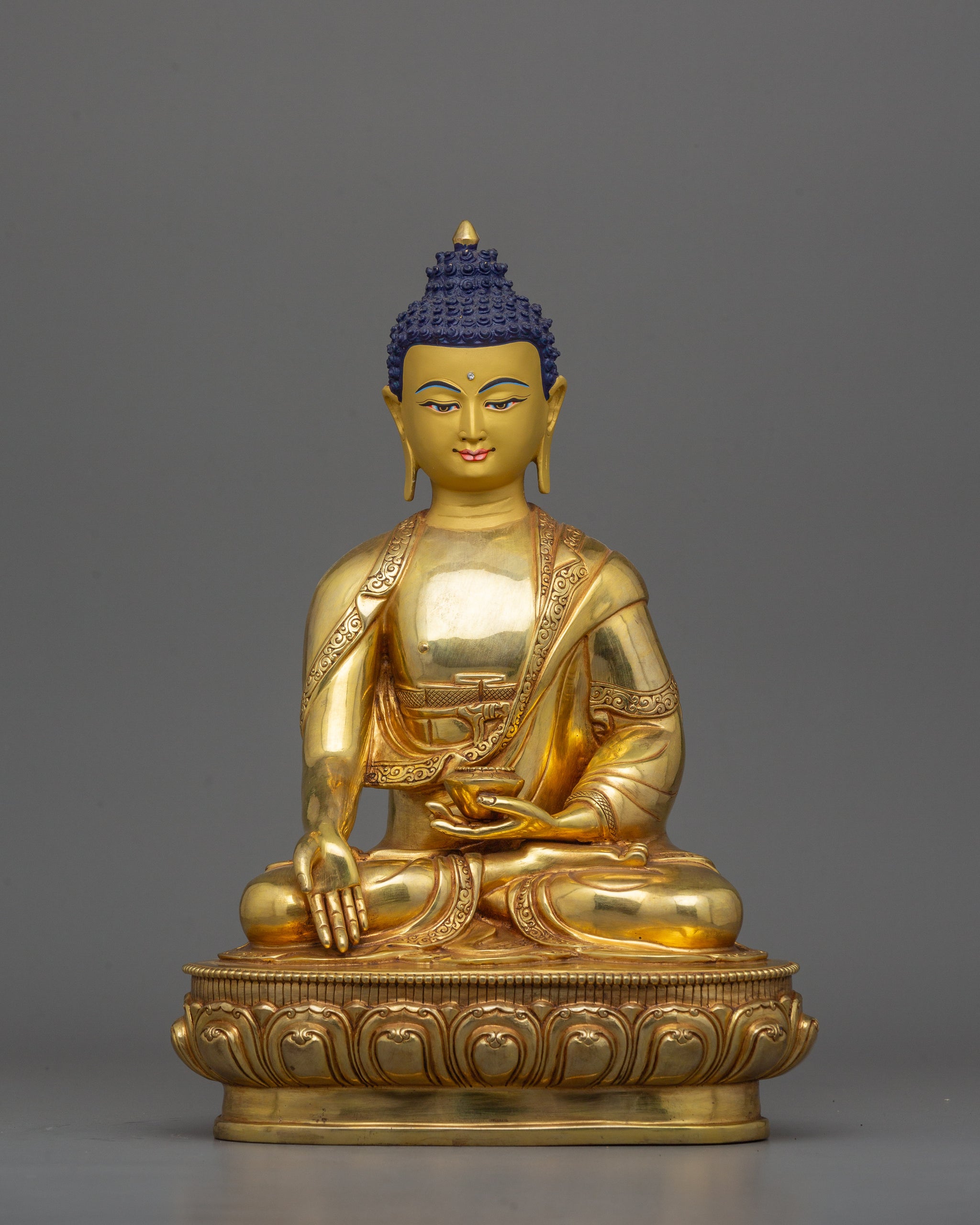The Ratnasambhava Buddha statue, a symbol of infinite generosity and the wisdom of equality will take you on a spiritual journey of prosperity and equality. It is made of copper covered with triple layer 24K gold gilding and carved with deeply engraved carvings that produce a magnificent 3D-like effect. This sculpture, adorned with hand-carved gemstones, represents the spiritual creativity of Himalayan Buddhism, making it a powerful addition to altars, meditation places, or sacred collections.