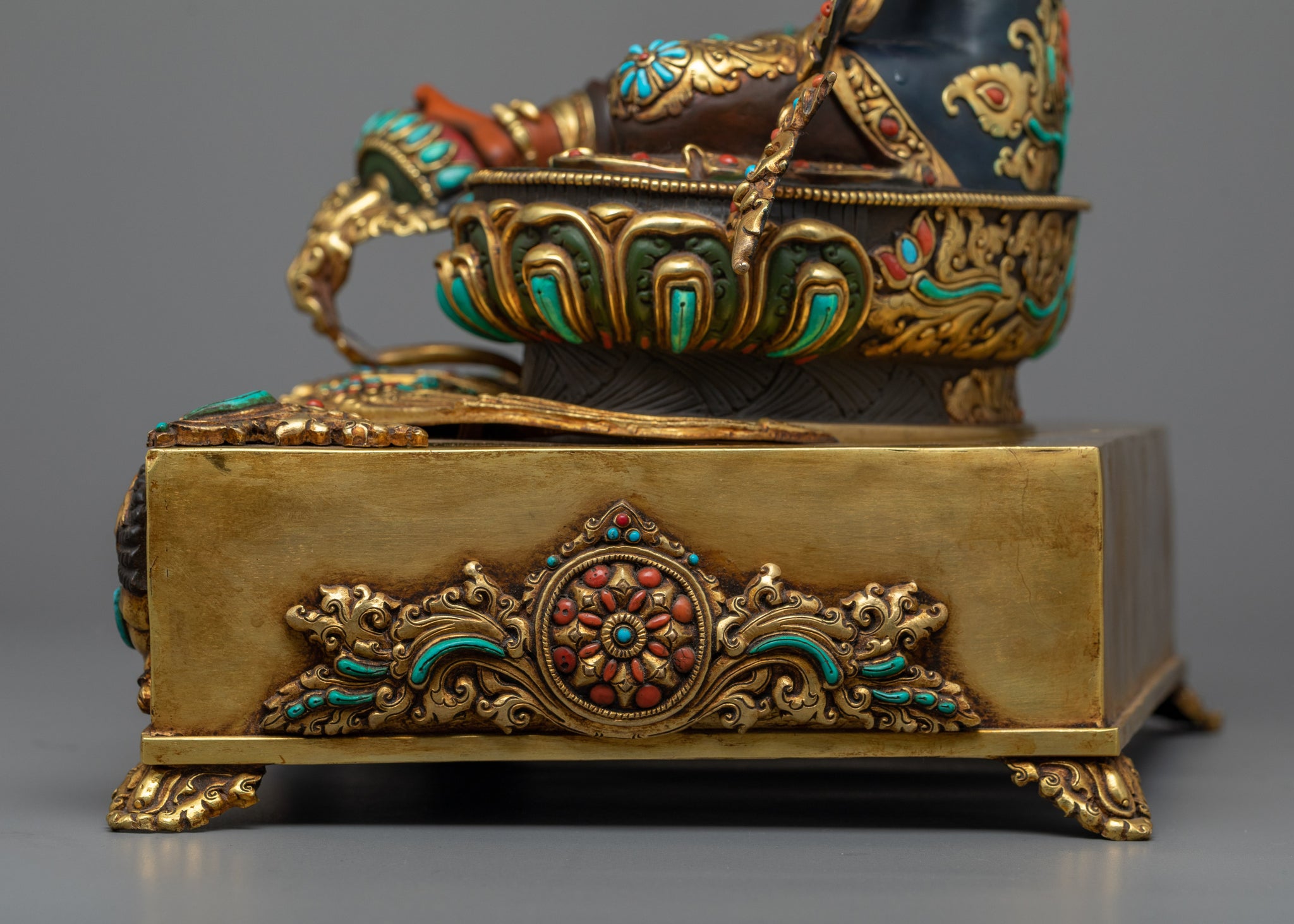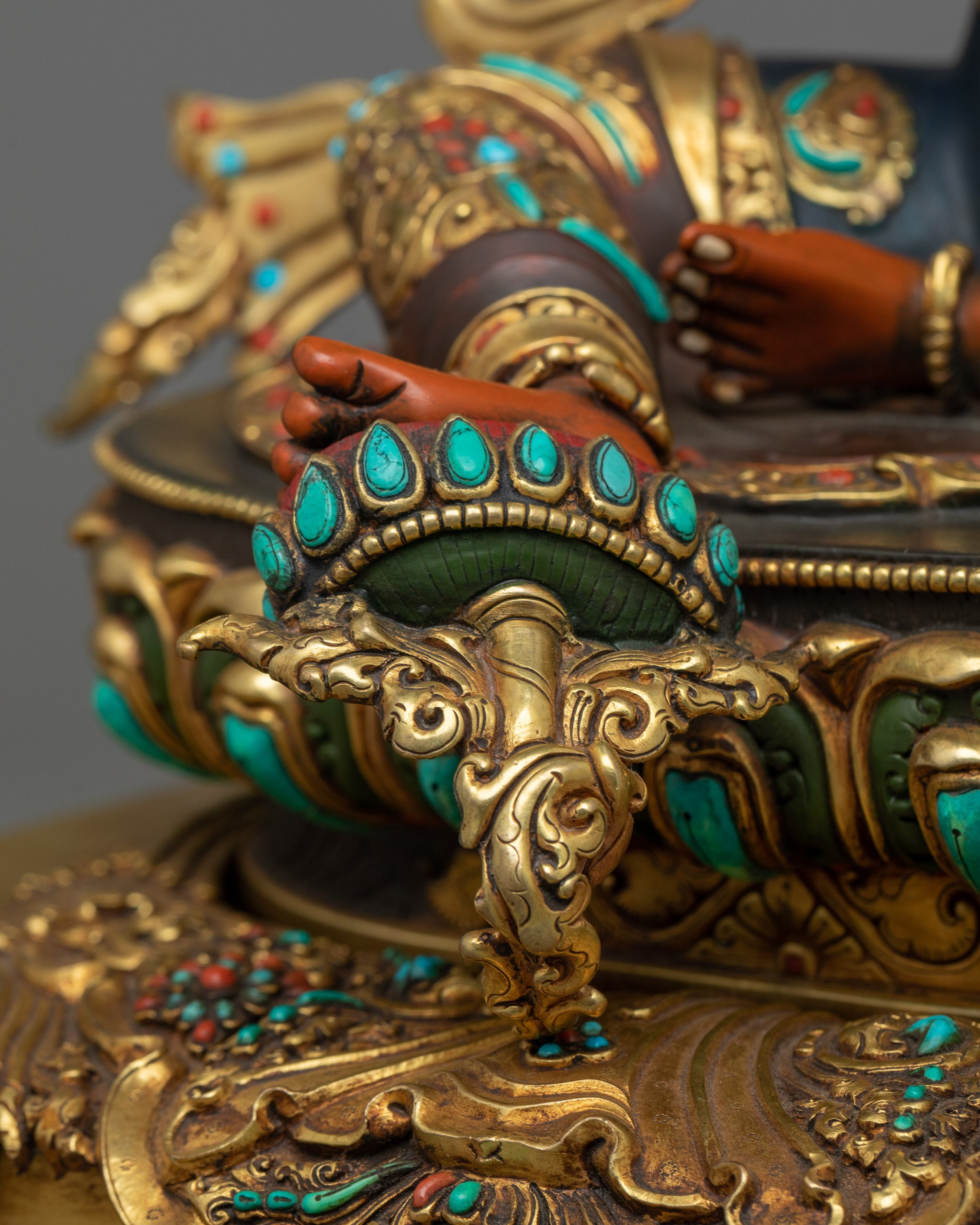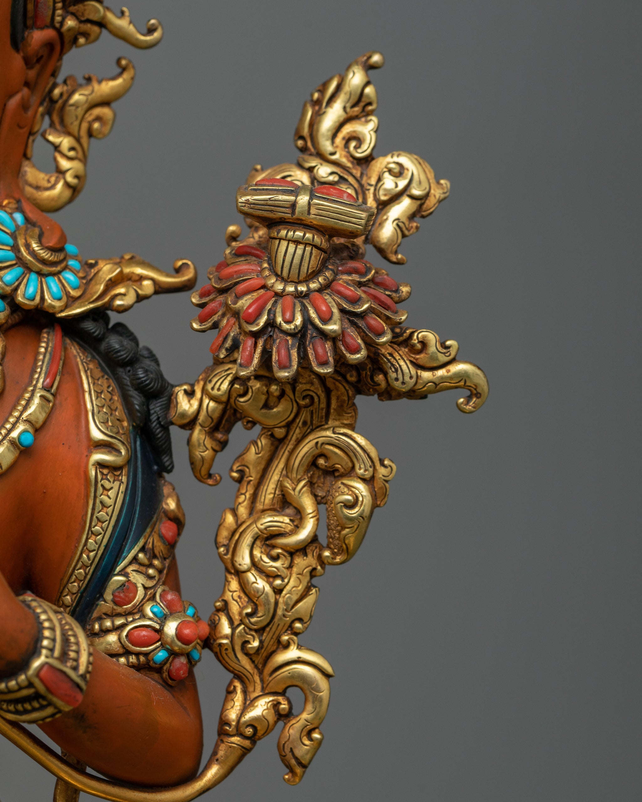 With our Red Manjushri Tikshna statue, you can bring the premium manifestation of spiritual wisdom and insight into your area. This sculpture combines profound spirituality with unmatched craftsmanship in every delicate detail. This high-end piece is meticulously crafted—24k gold gilded, accented with bright gold and acrylic paints, and embellished with hand-carved gemstones. The technique used to put color in this statue is also not revealed by the master artisan, as it has been secret from the time 1st discovered.