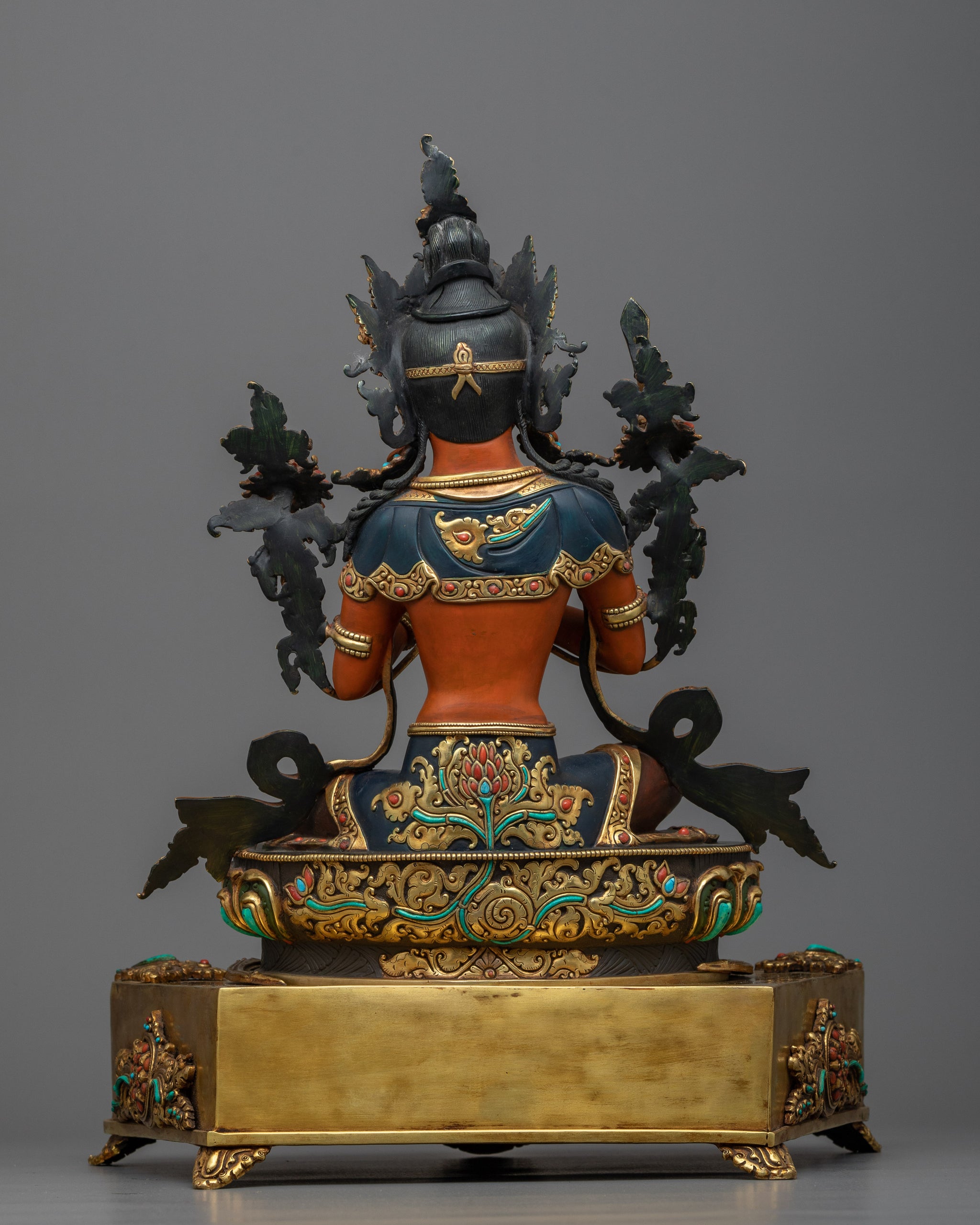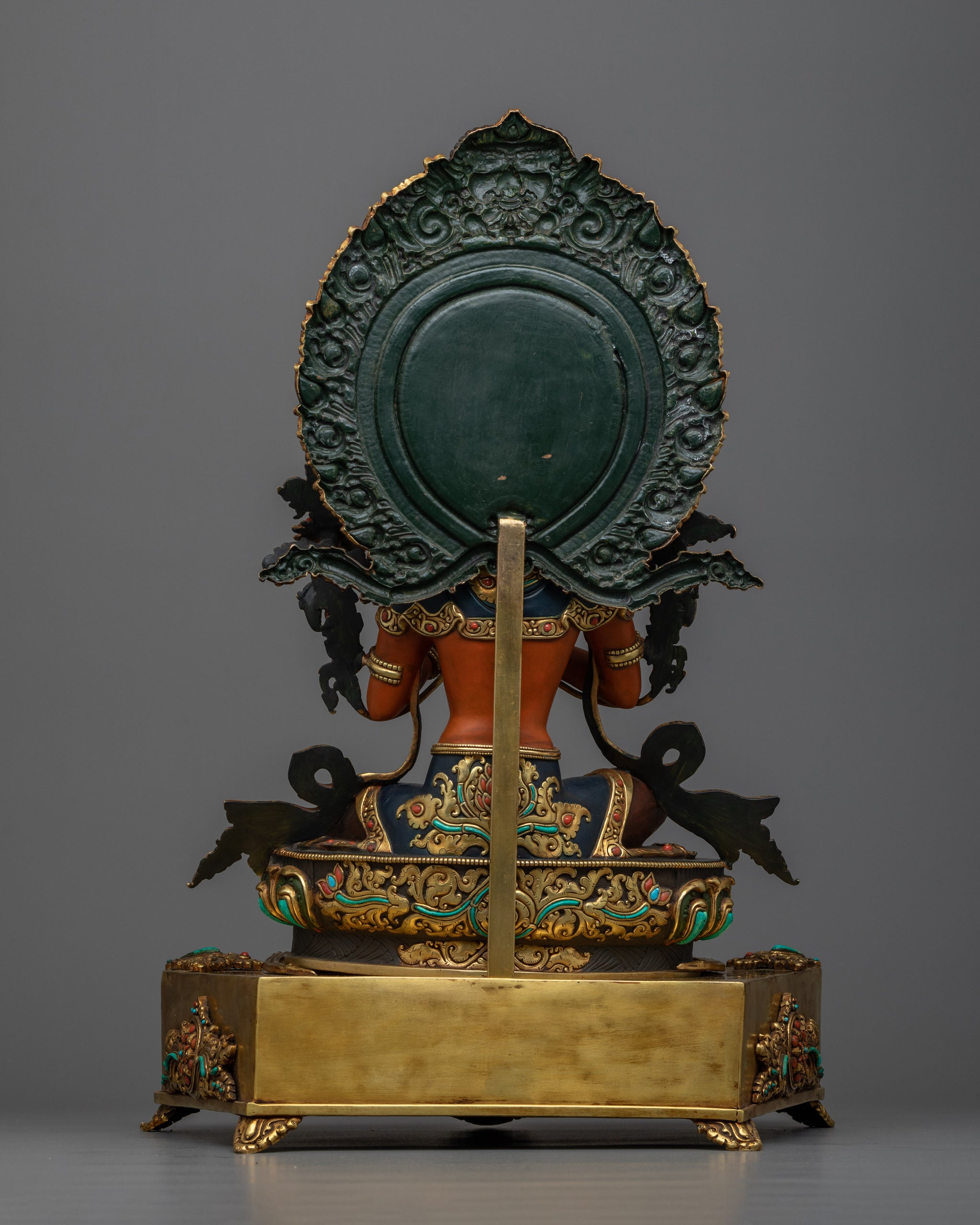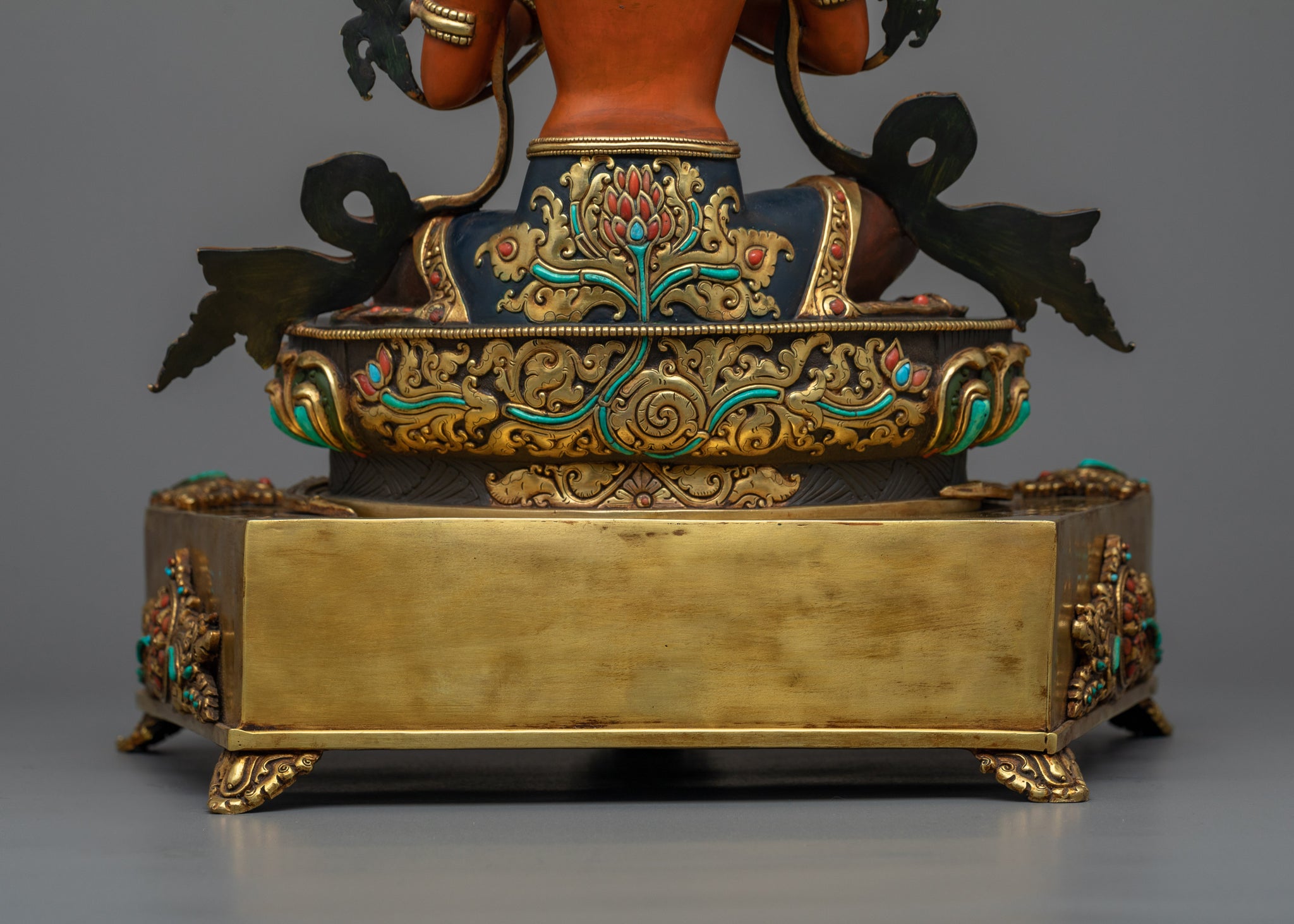 The statue's antique finish emphasizes its regality and ancient grandeur, providing a hint of timelessness, and the throne is grandly decorated with snow lions, mystical creatures, and precious gemstones that symbolize heavenly authority and enlightenment. This sculpture is more than just a symbol of divine wisdom; it is a conduit via which one can connect with Red Manjushri's cosmic intelligence and transcendental knowledge, boosting one's spiritual journey and infusing one's environment with sacred, enlightened energies.