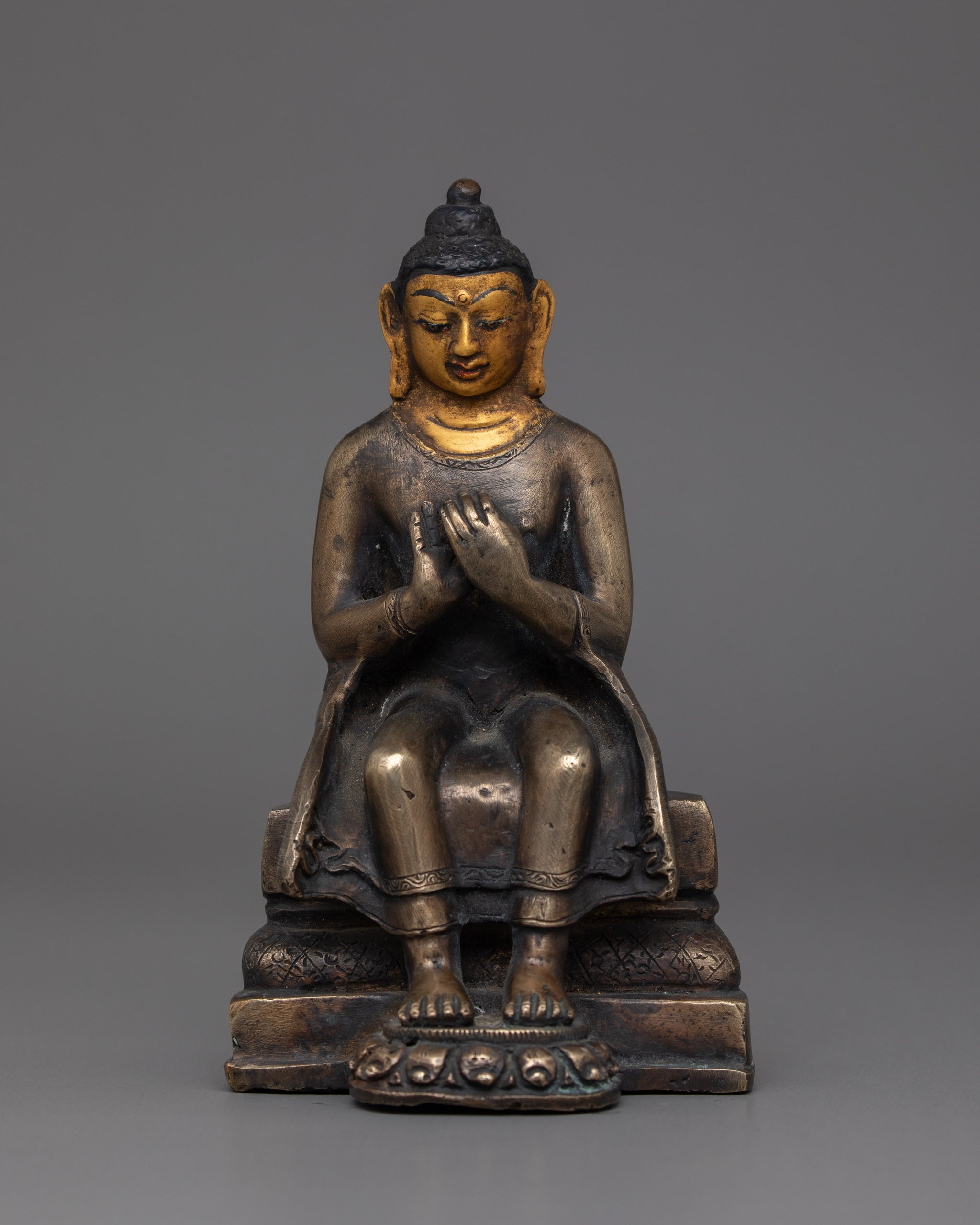 This Religious Figurine of Maitreya Buddha, symbolizes boundless hope, compassion, and the promise of enlightenment for all beings. It measures 6.1" (Height) x 3.3" (Base) and weighs 0.74 kg. It is skillfully constructed from copper and adorned with gold and acrylic paints. Also antique finish, these statues are highly valued for their timeless aesthetic, evoking a sense of history and tradition. This statue of Nepalese artistry, represents the Himalayan Buddhism's sacred traditions, making it an excellent addition to altars, meditation rooms, or spiritual collections.