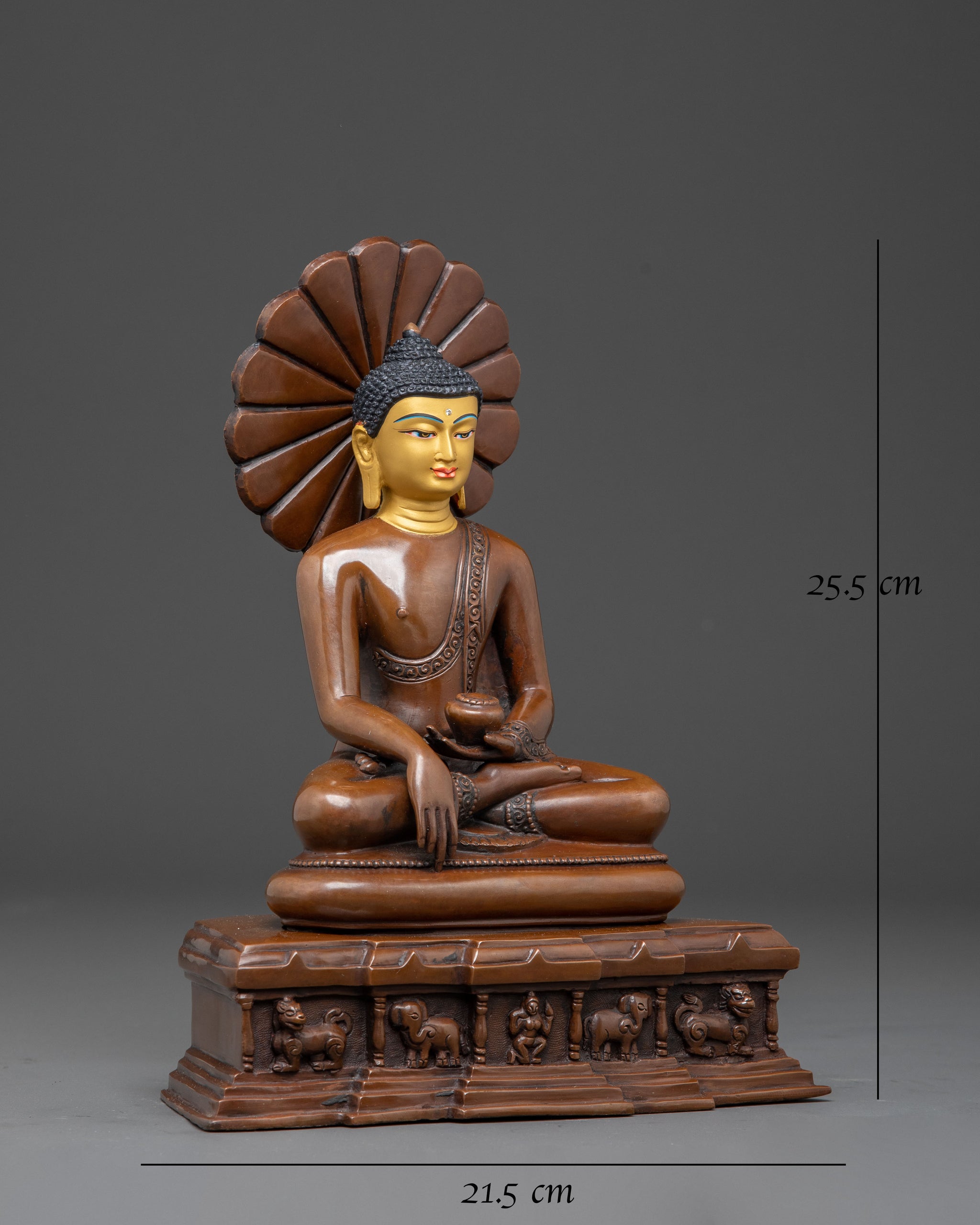 The Sacred Copper Statue of Gautama Buddha stands at 10 inches (25.5 cm) in height with a base width of 8.5 inches (21.5 cm), weighing 2.54 kg. Expertly handcrafted from an oxidized copper body, it is adorned with 24K gold gilding and delicate acrylic paintings. Radiating a serene and meditative presence, this statue captures the peaceful essence of the historical Buddha, making it a powerful centerpiece for any altar, meditation room, or spiritual space. Its rich texture and fine detailing reflect traditional craftsmanship, while the combination of gold and copper adds depth and a sense of reverence.