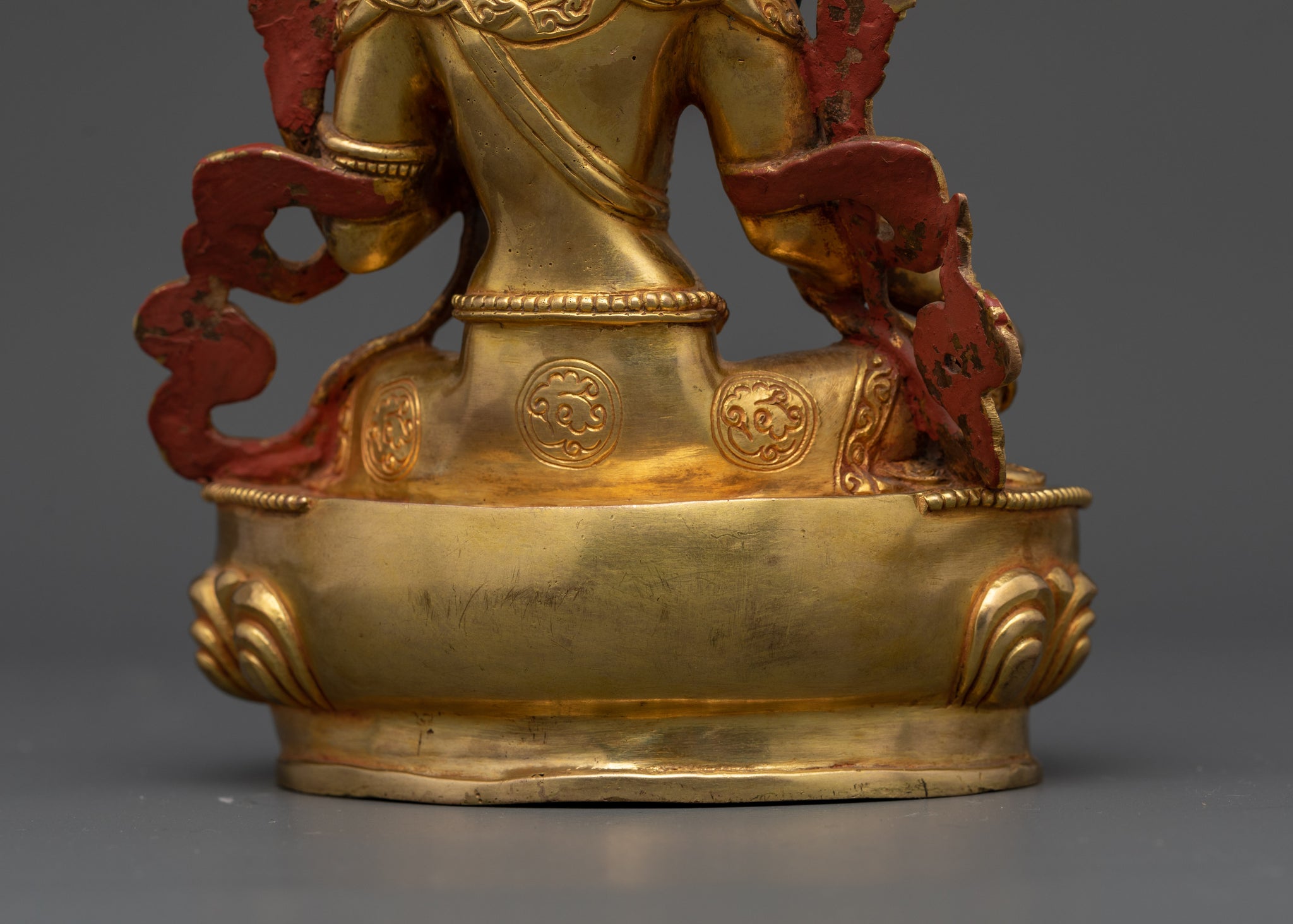 Vajrayogini is stunning. The details are amazing. It's easy to make out her facial expressions, skulls, feet, and the ring of fire around her. You can tell she's handmade. There is a consecration hole in her back.