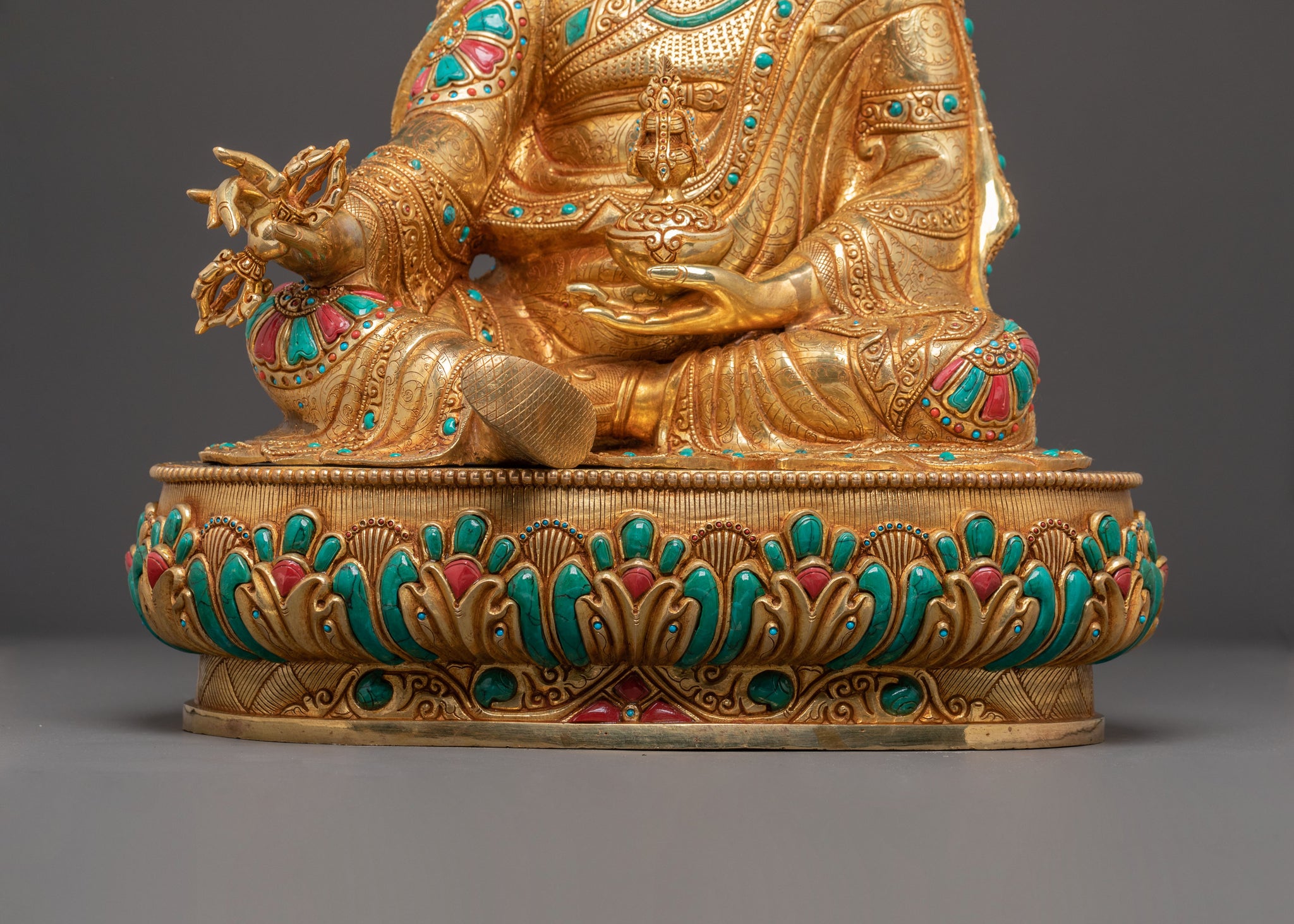 Guru Rinpoche Statue: Revered Vajrayana Master, stands 22 inches (56 cm) tall with a broad base of 15 inches (38 cm) and weighs 16.65 kilograms. Expertly crafted from a solid copper body, it is lavishly adorned with 24K gold gilding, intricate gold and acrylic paintings, and hand-set gemstones that enhance its divine presence. The statue radiates sacred elegance, making it a powerful centerpiece for large altars, temples, or meditation halls. Its rich symbolism and fine craftsmanship reflect the mastery of Nepali artisans and embody the spiritual essence of Padmasambhava. Ideal for serious practitioners, temple sanctuaries, or collectors of Himalayan sacred art.