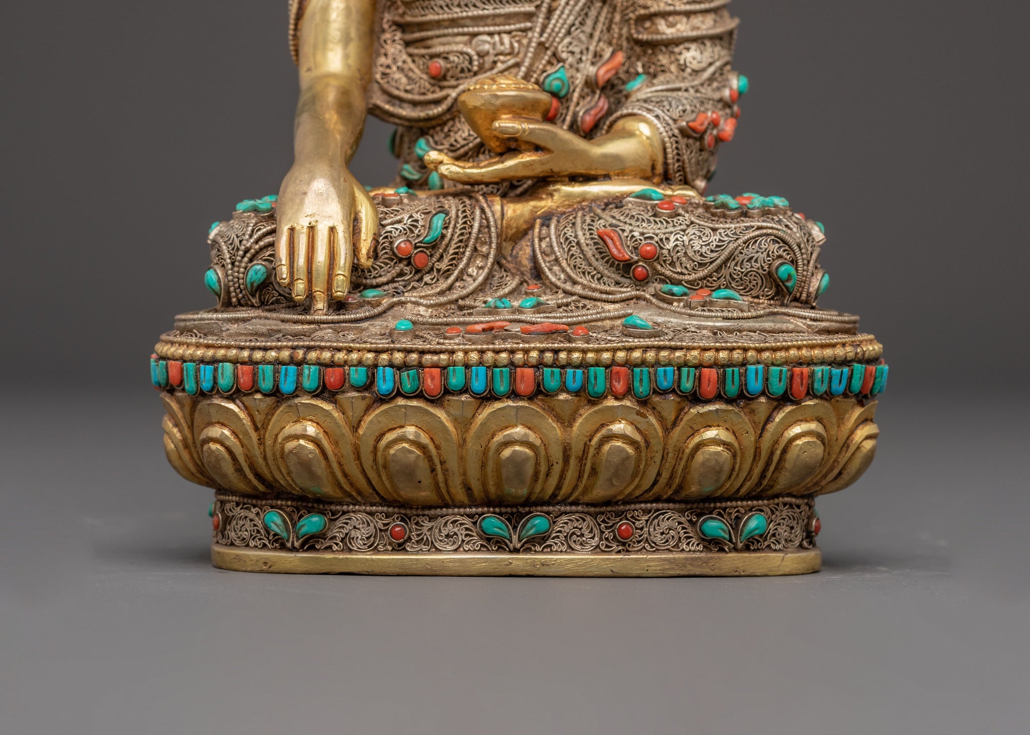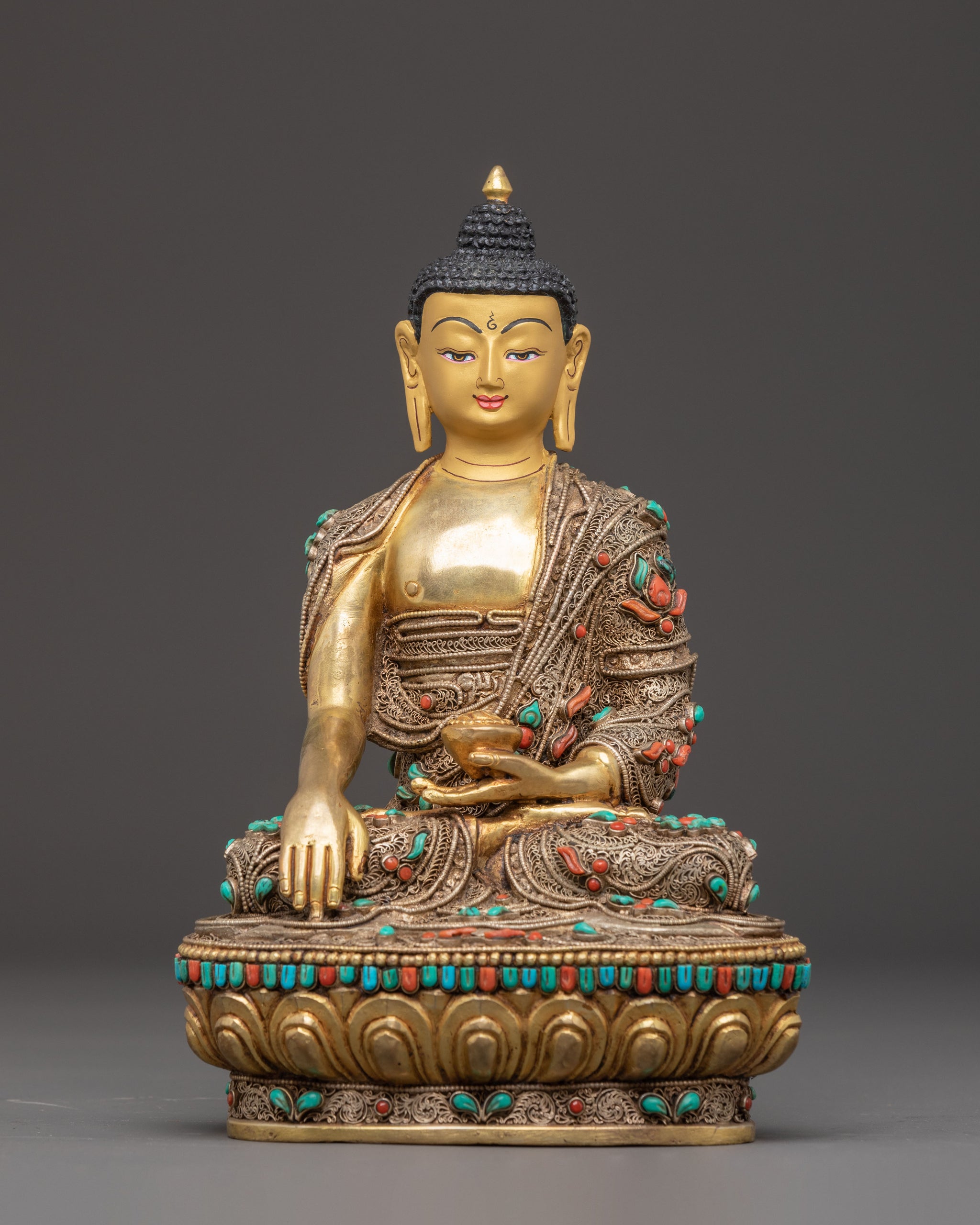 Shakyamuni Buddha Statue: The Awakened One stands 8.3” (21 cm) tall, with a 5.5” (14 cm) base, and weighs 1.57 kg. Expertly crafted from a copper body, it is adorned with radiant 24K gold gilding, detailed gold and acrylic paintings, and hand-set gemstones that enhance its sacred presence. This finely detailed piece reflects traditional Nepalese craftsmanship, making it a meaningful addition to any altar, meditation area, or spiritual art collection.