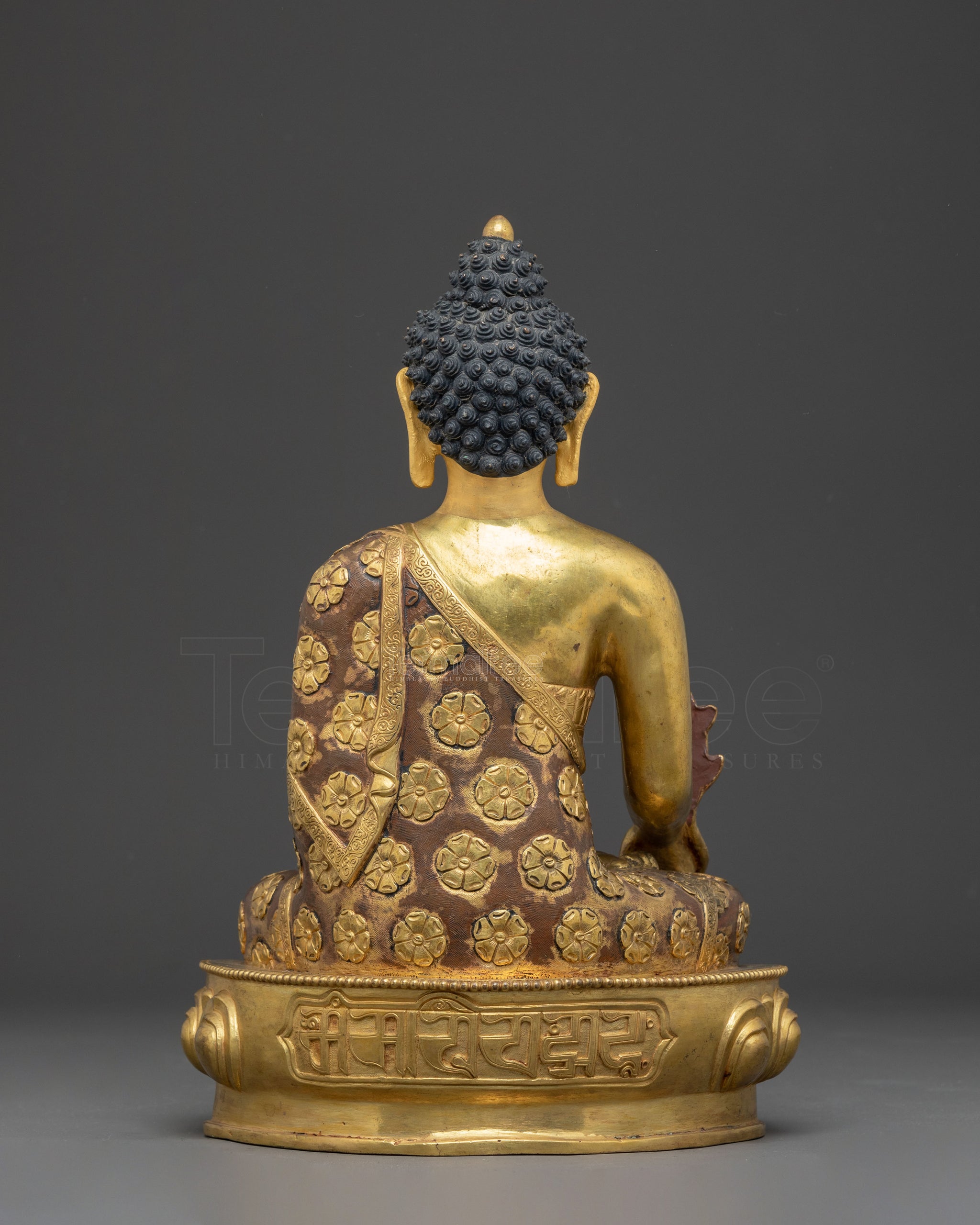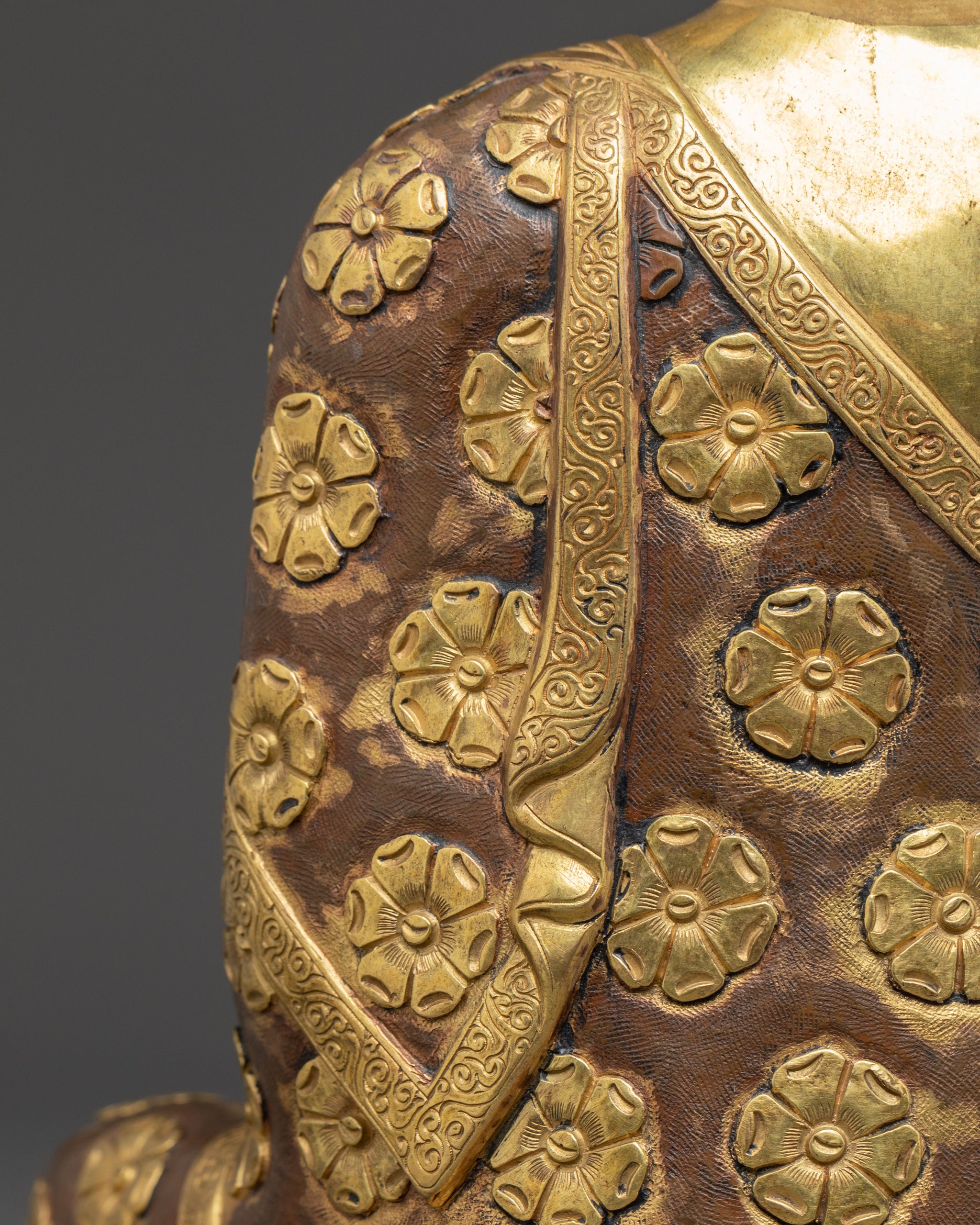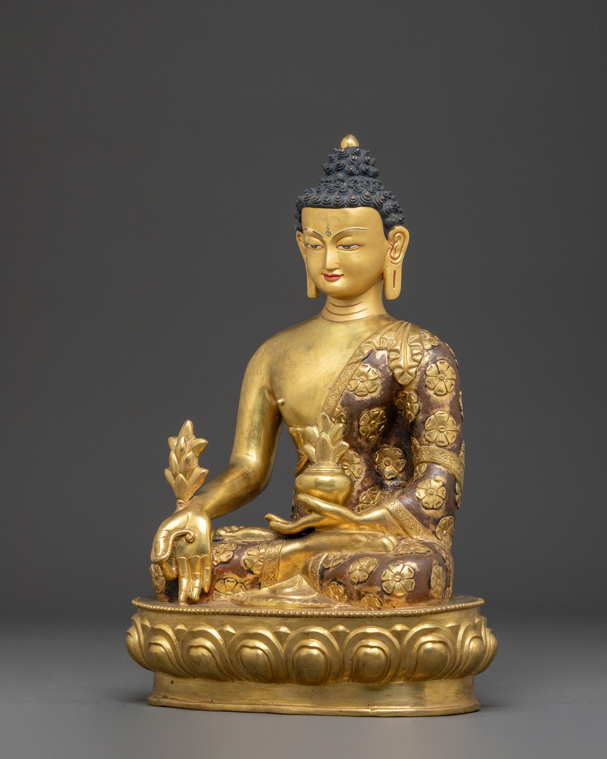 The Sacred Statue of Bhaisajyaguru stands at 12.4” (31.5 cm) in height with a base width of 8.5” (21.5 cm), weighing 3.75 kg. It is made of oxidized copper and adorned with 24K gold gilding, reflecting a rich, luminous presence. The surface is intricately decorated with deeply engraved patterns that produce a striking three-dimensional effect, enhancing its depth and visual richness. Ideal for altars, meditation spaces, or as a centerpiece of spiritual artistry, this statue embodies both devotional reverence and refined craftsmanship.