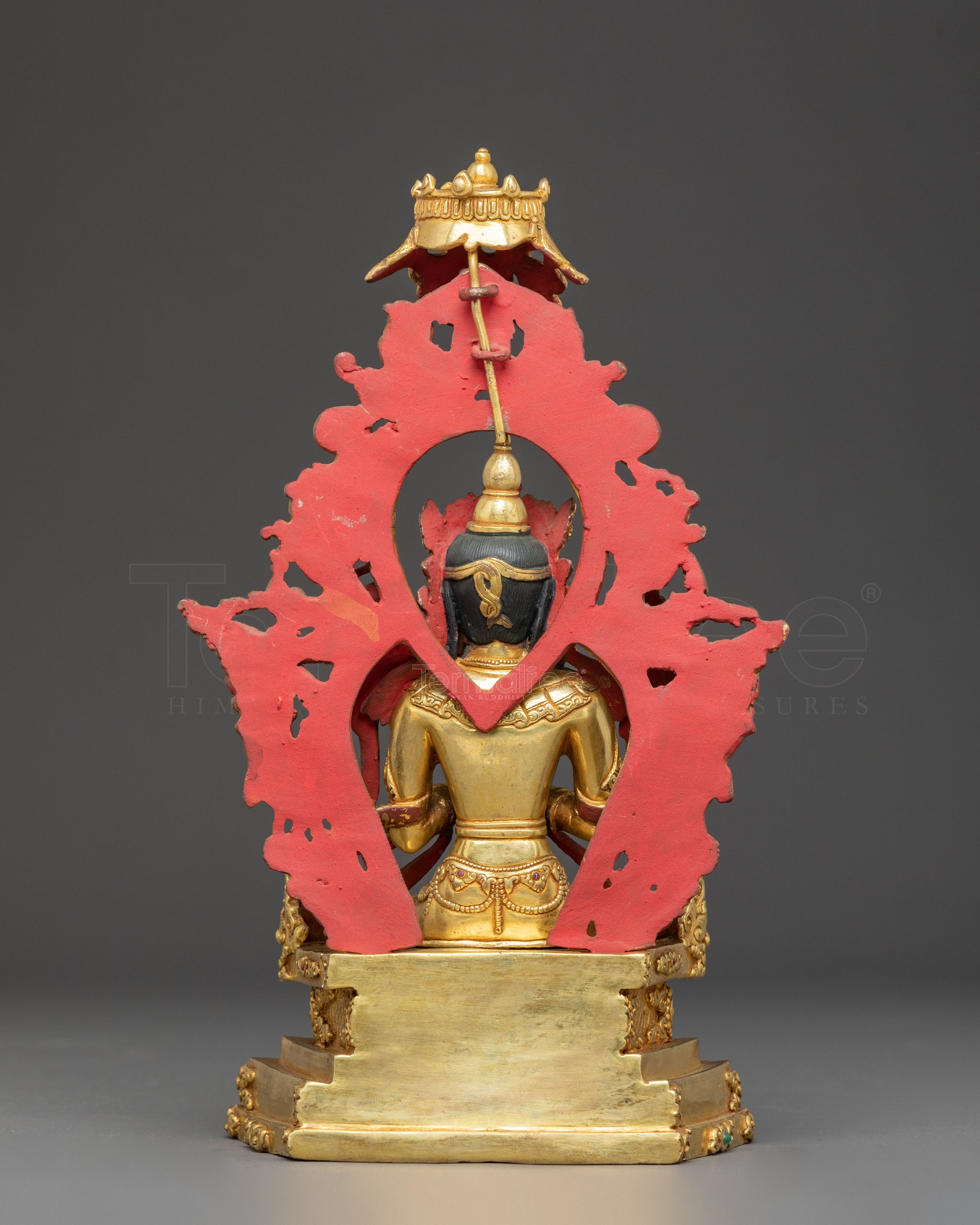 In terms of iconography, Maitreya is depicted seated upon a magnificent throne. His principal hands form the Dharmachakra mudra, holding lotus flowers that rise gracefully by his shoulders. The right lotus cradles a Dharma wheel, while the left has a kalasha (vase), signifying wisdom, purity, and the continuity of the teachings. He wears a five-pointed crown, representing the Five Dhyani Buddhas. The throne itself is elaborately adorned, with a Cheppu at its apex and Garuda carvings, and is surrounded by multiple intricate animal motifs that highlight both protection and auspiciousness.