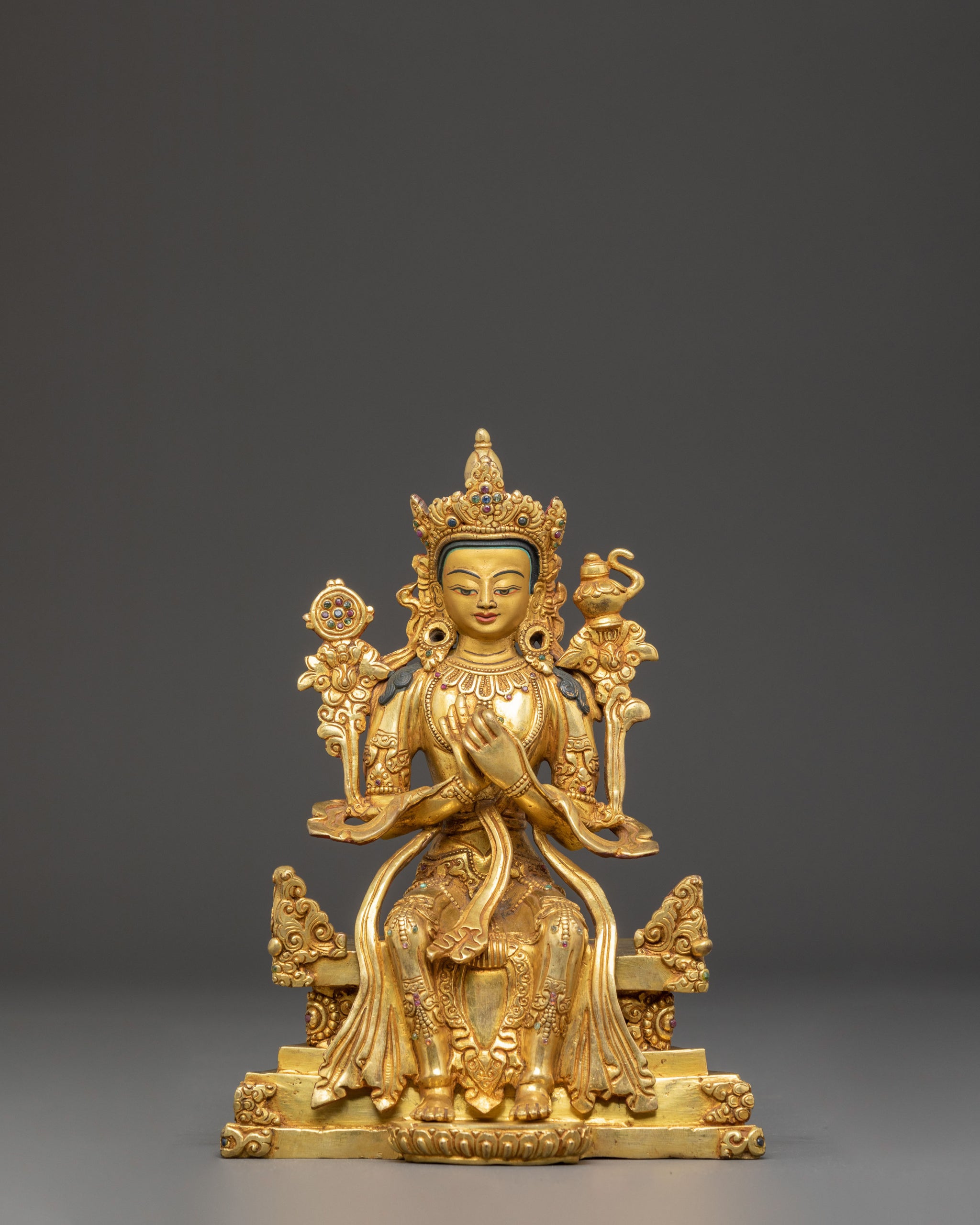This statue of future buddha Maitreya stands at 11.0 inches (28 cm) in height and 6.5 inches (16.5 cm) at the base, with a weight of 2.13 kg. It is made of copper, covered with a triple layer of 24K gold gilding, and carved with deeply engraved carvings that produce a magnificent 3D-like effect. This sculpture, adorned with hand-carved gemstones, handcrafted by expert Nepalese artisans, elegantly symbolizes Himalayan Buddhism's sacred traditions, making it an appropriate addition to altars, meditation places, or sacred collections.