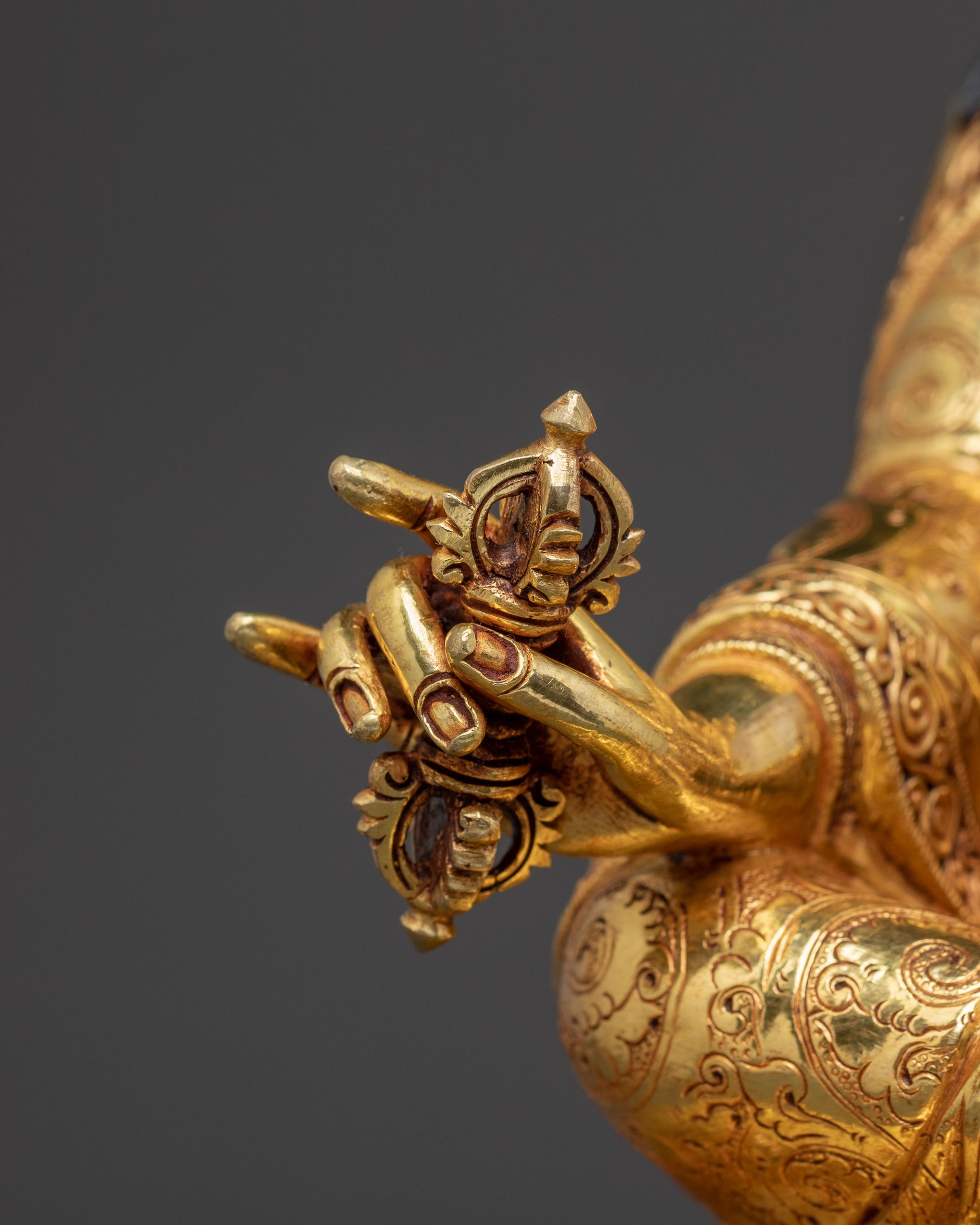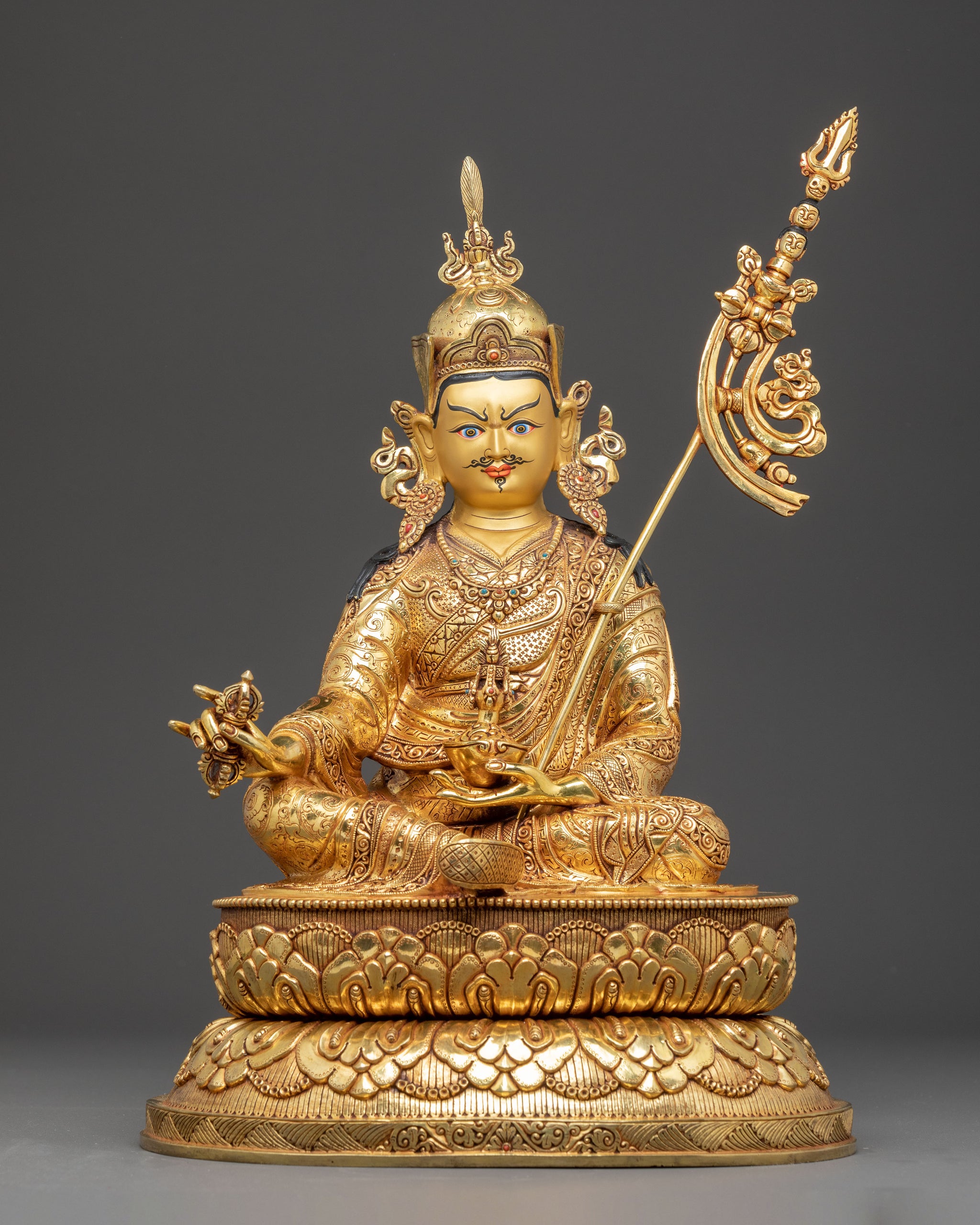 This Sacred Statue of Guru Padmasambhava, also known as the Founder of Tibetan Buddhism, stands at 15.9”/40.5cm in height and 11”/28cm at the base, weighing 5.23 kg. Expertly crafted from a copper body with 24K gold gilding and acrylic paintings, it reflects the refined skill of Nepali artisans. Representing the founder of Vajrayana Buddhism, this statue embodies profound spiritual mastery, making it a powerful centerpiece for altars, meditation spaces, or sacred collections.