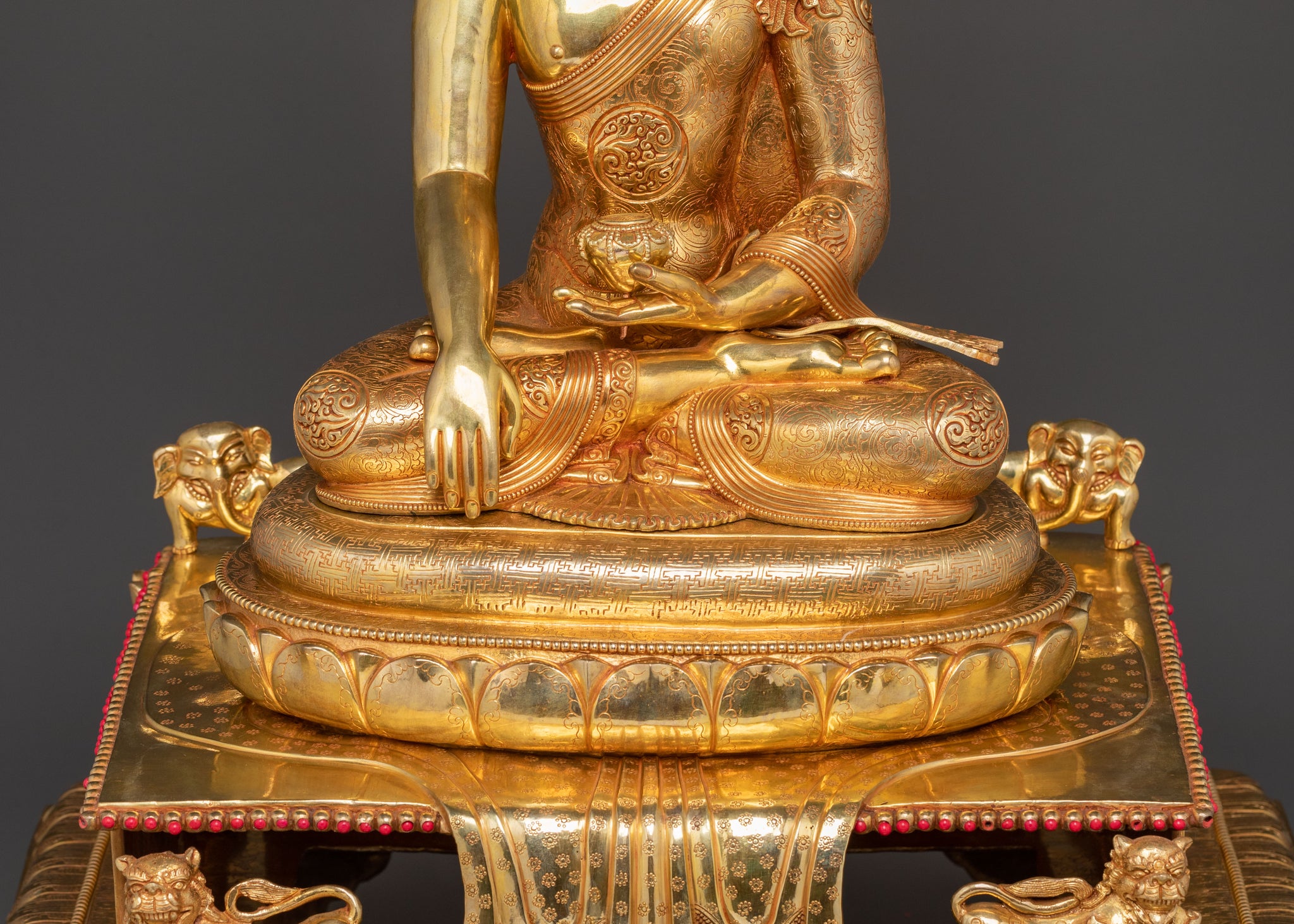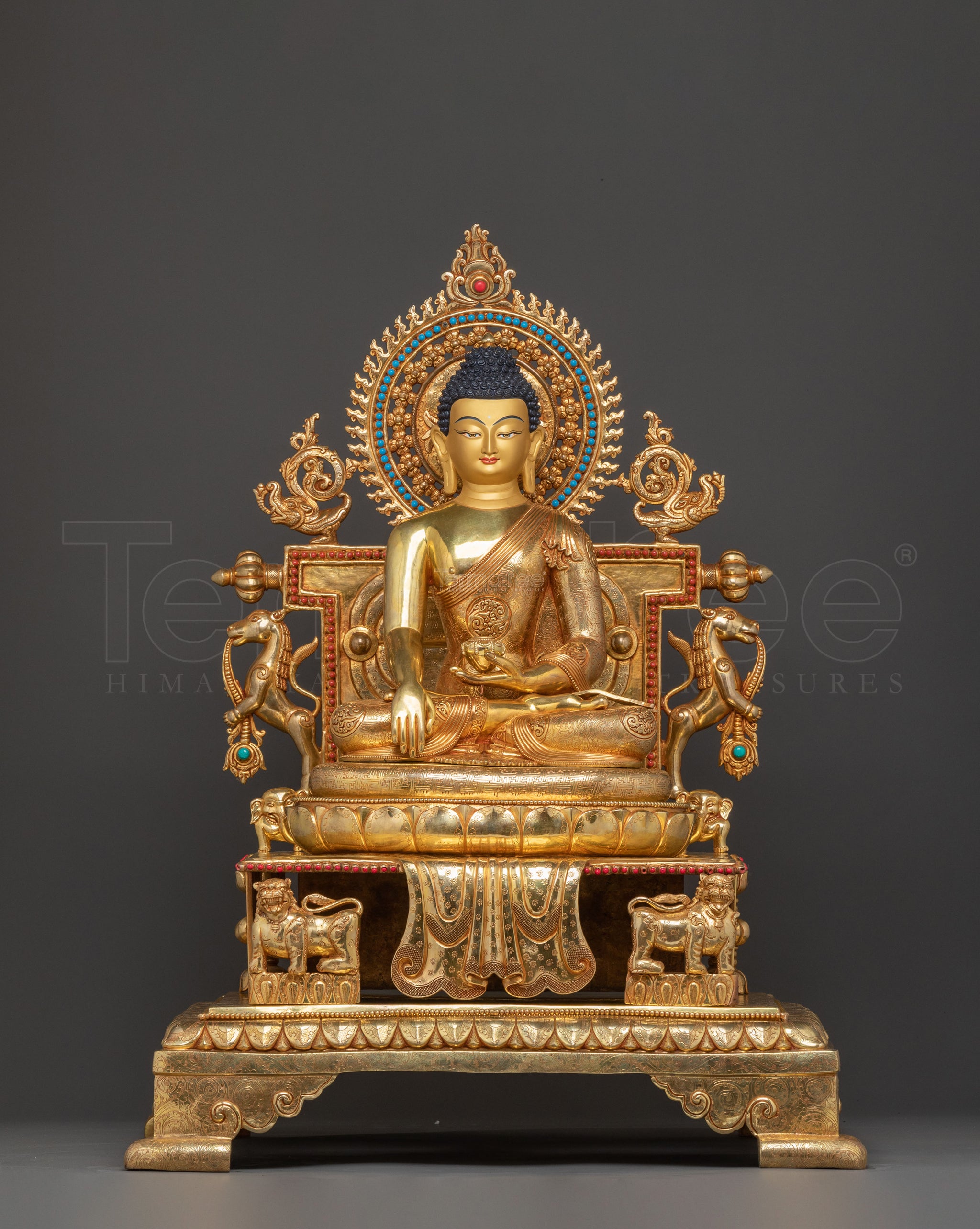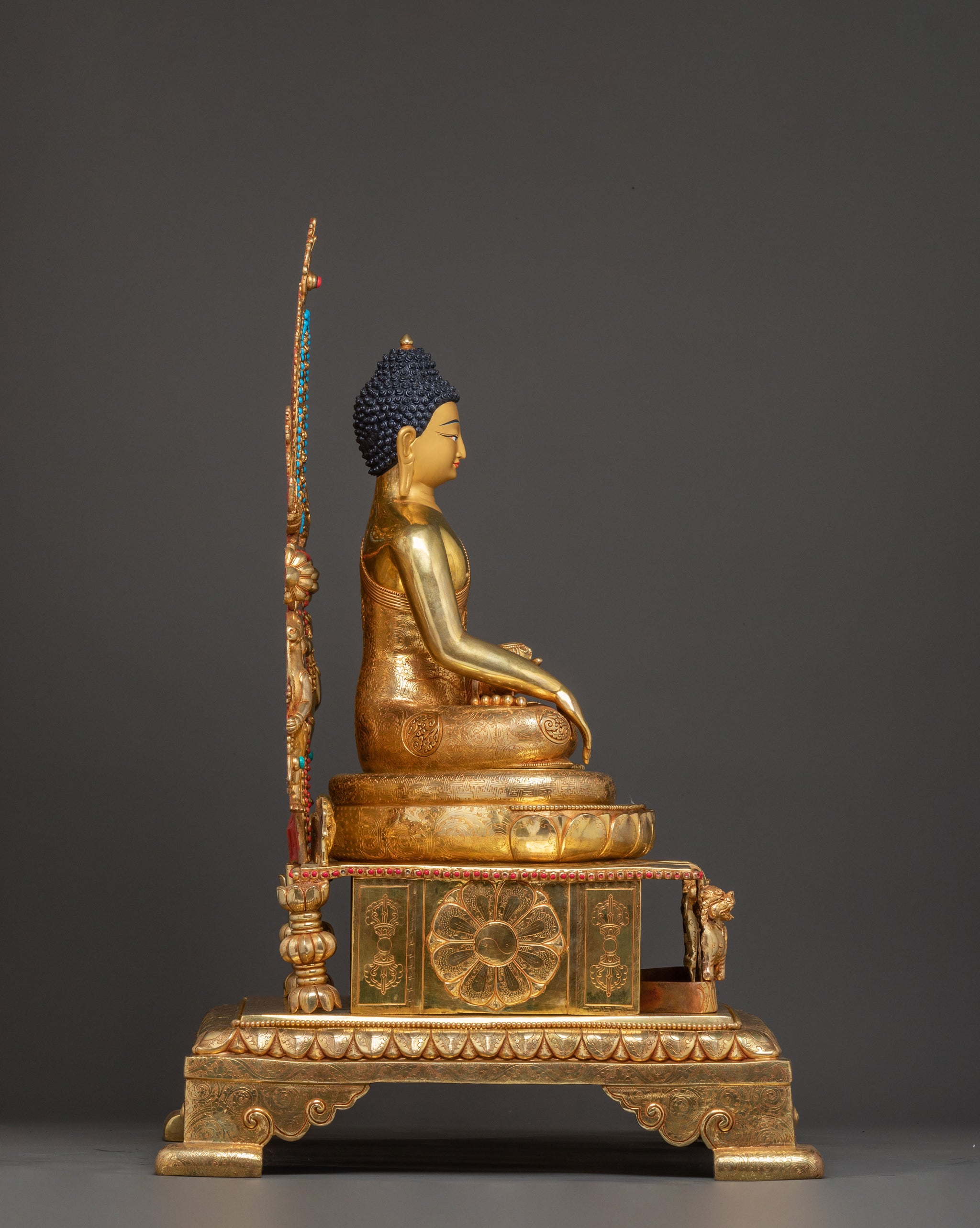 Sacred Statue of Shakyamuni Buddha in Throne – 24K Gold Gilded Artistry