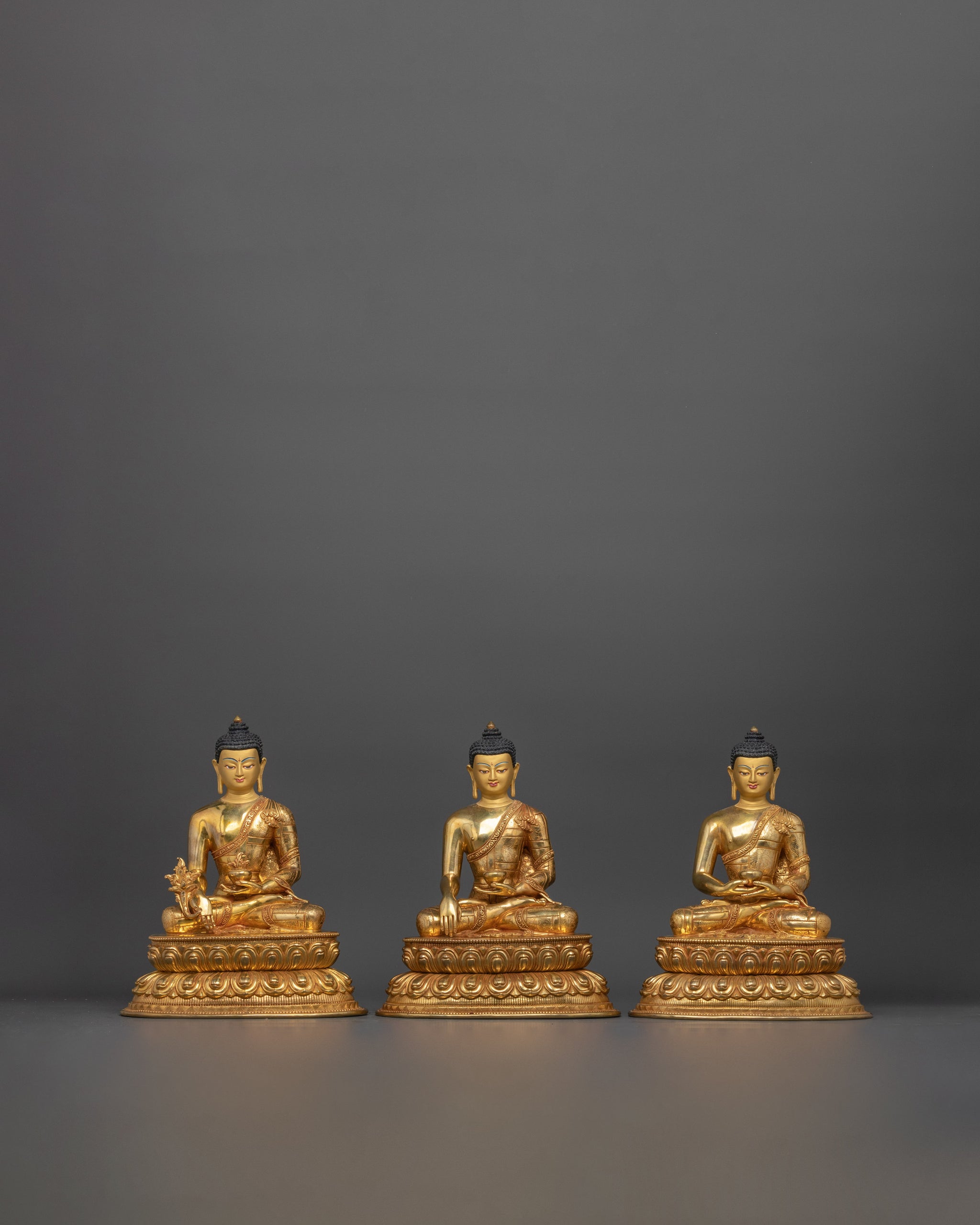 Sacred Three Buddha Set | Handcrafted 24K Gold Gilded Copper Sculptures