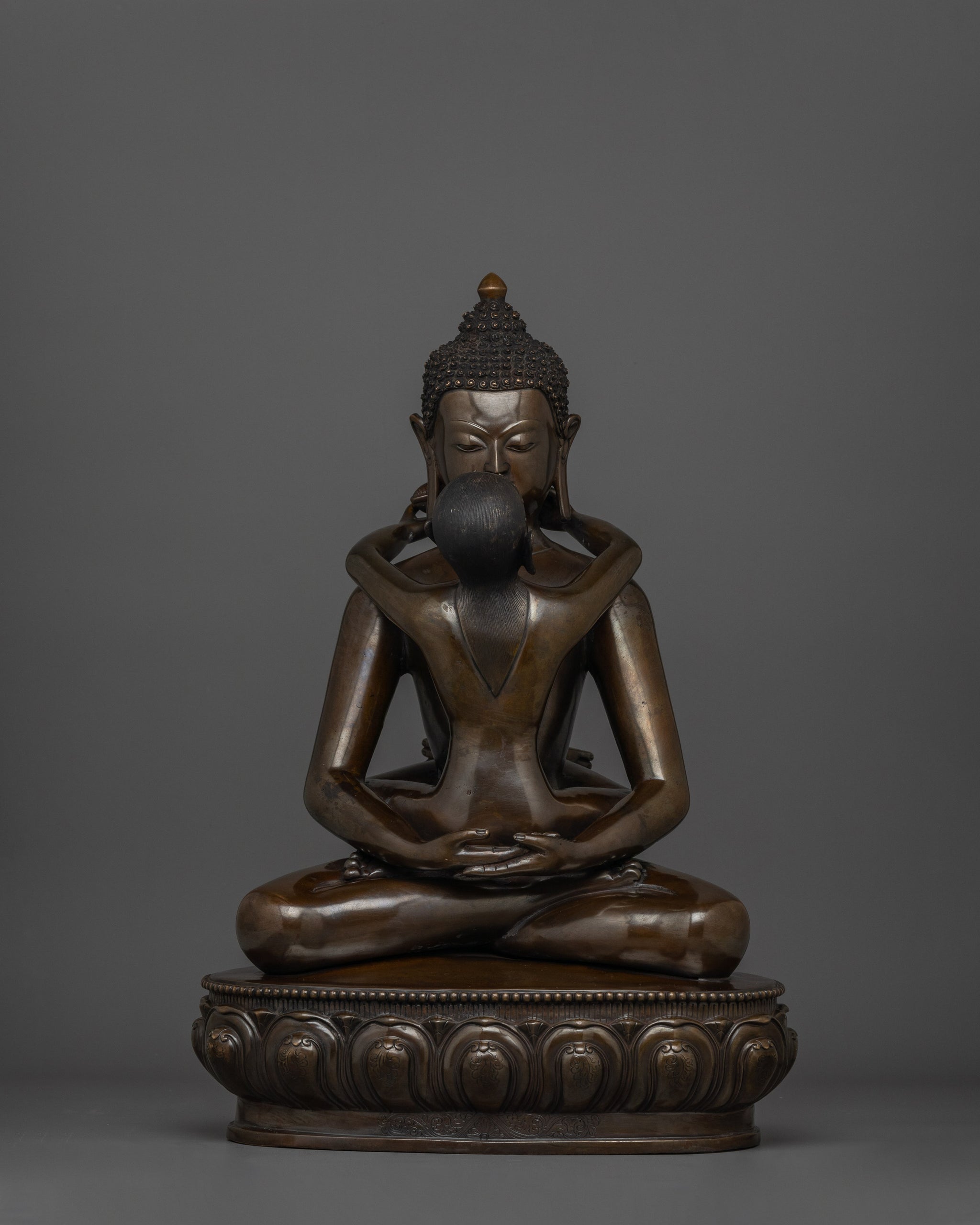 This handmade statue of Samanthabhadra with Consort is standing at 17.7”/45cm (Height) and 12.6”/32cm (Base). this statue is made up of an oxidized copper body. this piece depicts the sacred union between Samantabhadra, the Bodhisattva of Universal Goodness, who represents the embodiment of perfect virtue, compassion, and wisdom in Mahayana Buddhism, and Samantabhadri, Samantabhadra's consort, who is depicted as an ethereal and graceful figure. Together, they represent the complete harmony of the enlightened mind and the liberation of all beings from suffering.
