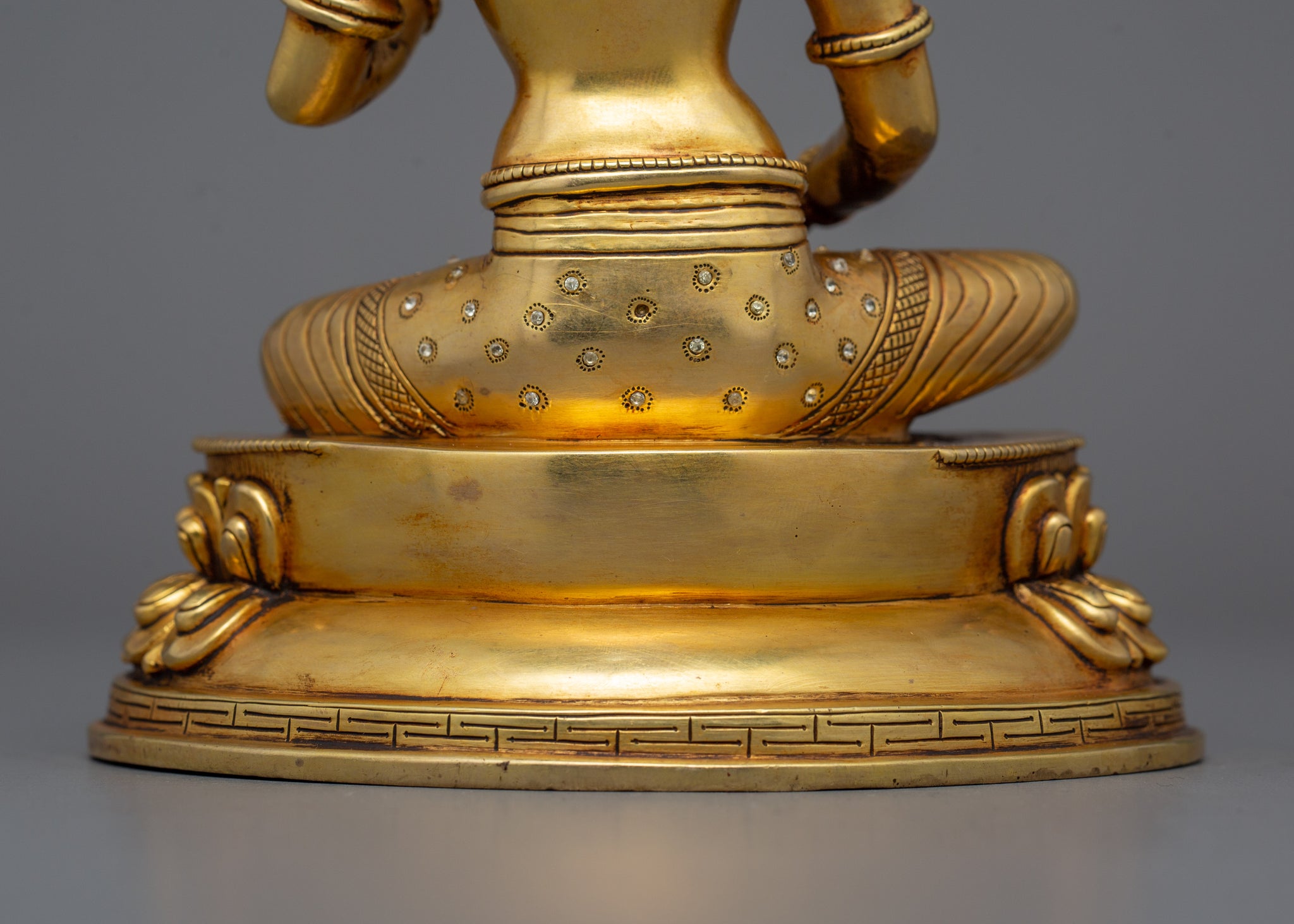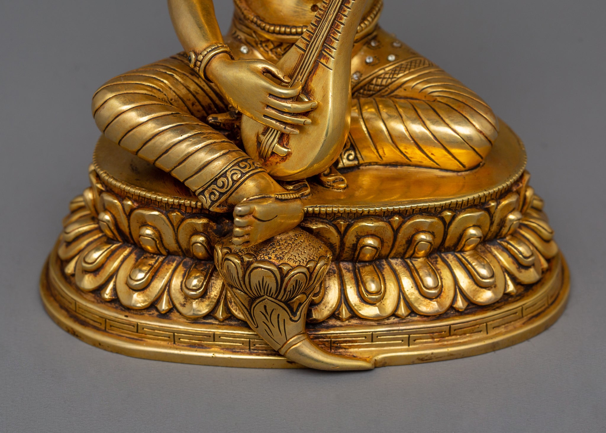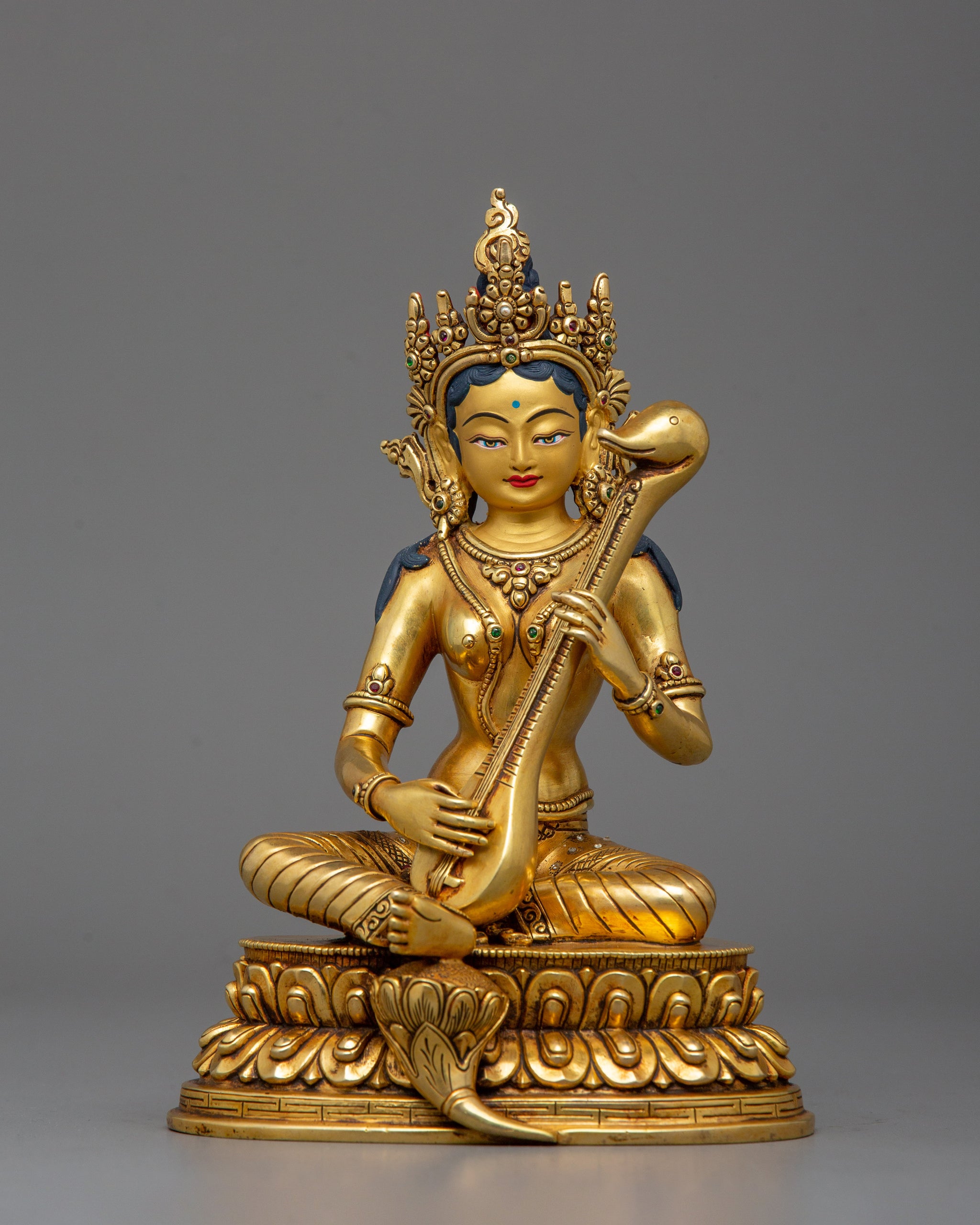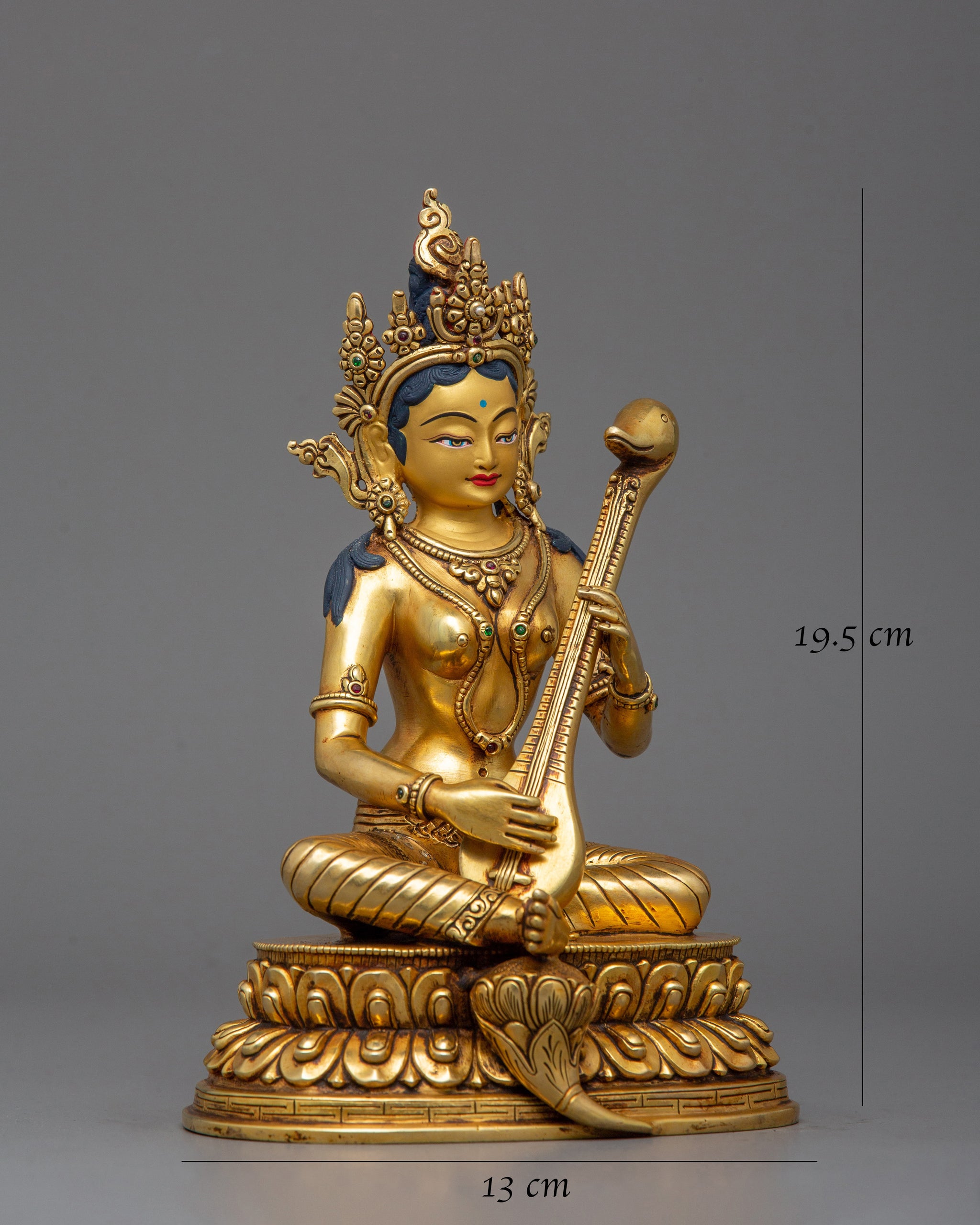 Goddess Saraswati Figurine, the harmonious symphony of knowledge, music, and arts. This statue gleams with a bright sheen of 24k gold gilding after being crafted from the finest copper and delicate by acrylic paintwork. More than just a work of art, it is a symbol of Saraswati's graces, granting wisdom, creativity, and enlightenment. It's an excellent pick for individuals who appreciate spiritual profundity interwoven with great creativity. Crafted by expert Nepalese artisans, this sacred item embodies the rich traditions of Himalayan Buddhism, making it an important addition to altars, meditation areas, or sacred collections.