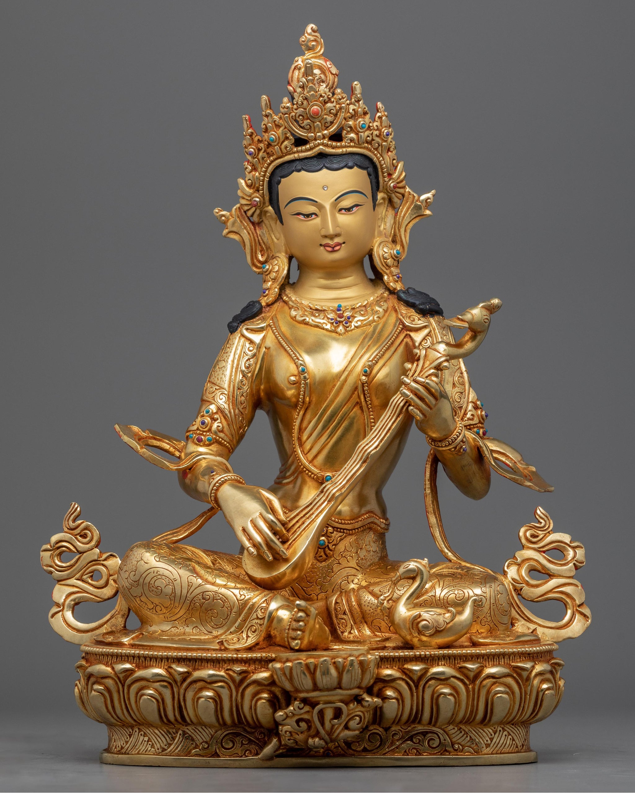 We have meticulously hand-carved this gold gilded copper statue of Saraswati Hindu goddess in our studio. She is pictured sitting on a lotus with a vina in her hand with a serene appearance. She has long, flowing hair that falls to her shoulders that is covered in a beautiful scarf with intricate patterns that flows across it. She wears an elaborately carved headpiece with precious gems placed artistically by our artists.