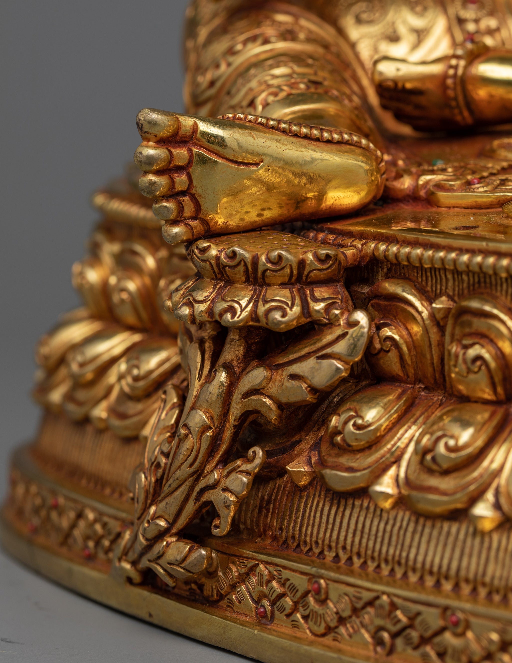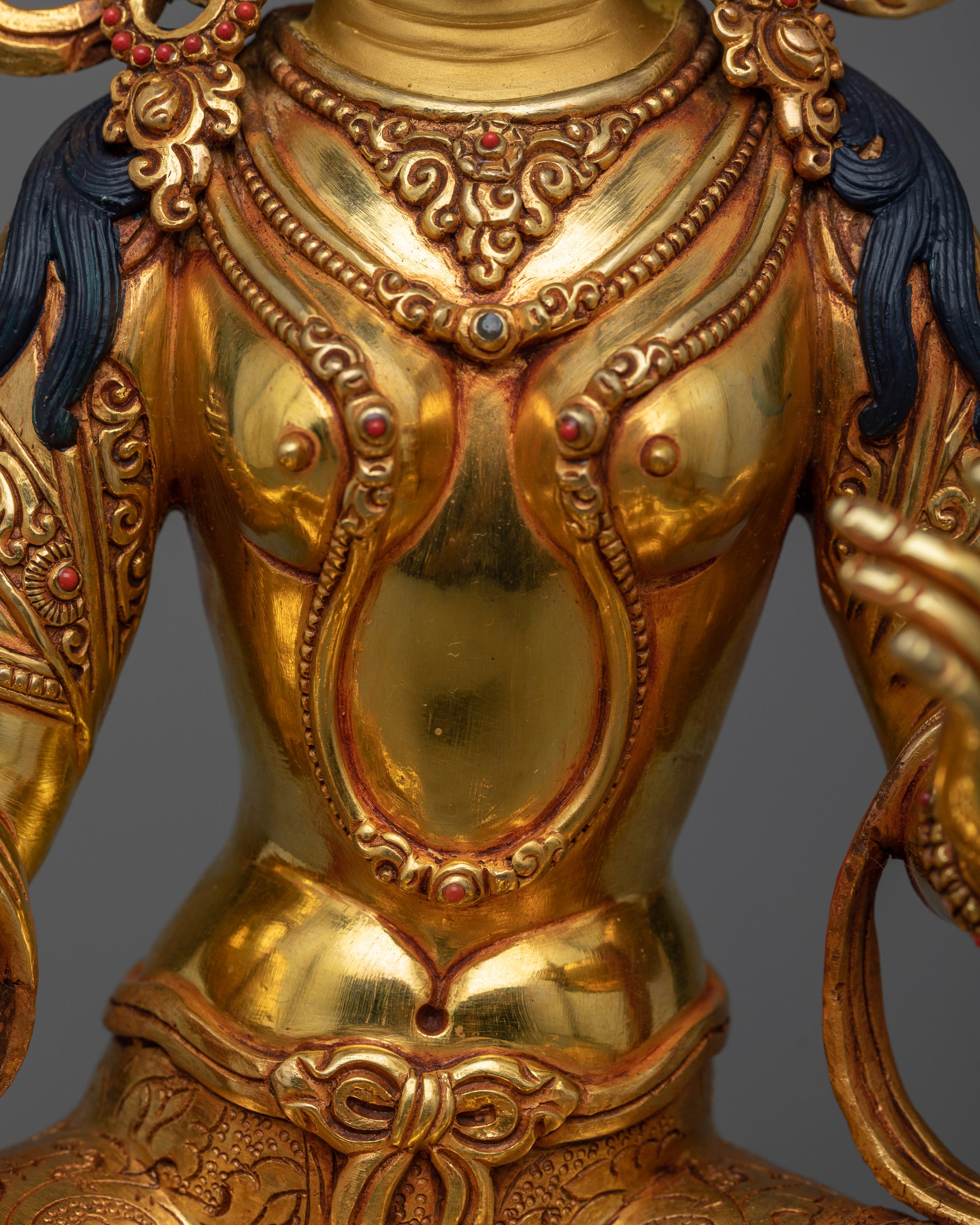 We sculpted the statue out of copper and gilded it with genuine triple layers of 24K gold. Precious gemstones are used to adorn the crown and body ornamentation. The hand-carving is magnificent, with a deep 3D effect. It took us months and months of hard effort in our studio, from molding to hand-craving intricate design patterns and gliding with gold.