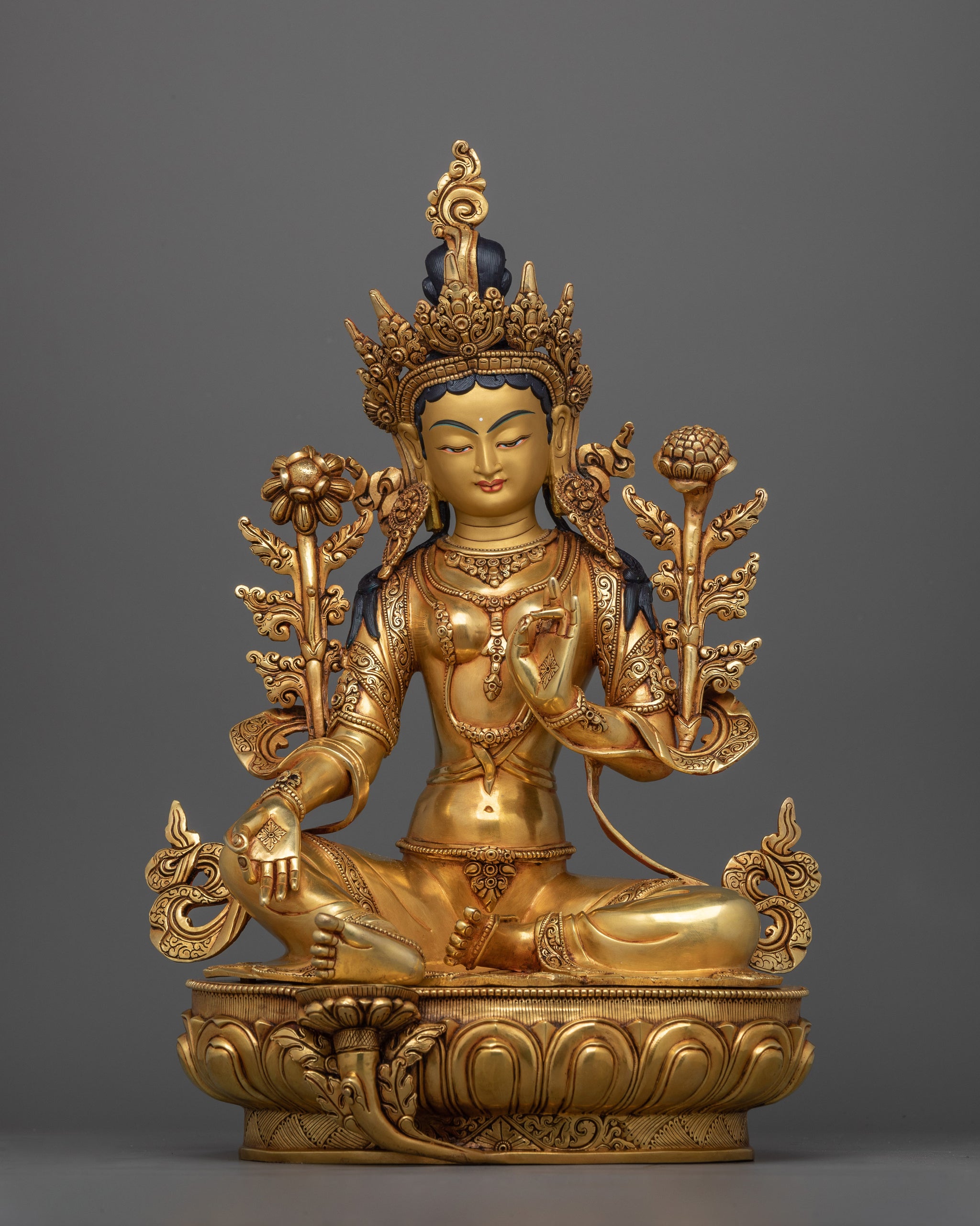 Green Tara, also known as Syamatara, is a highly adored deity in Tibetan Buddhism who represents active compassion and prompt help. She is referred to as the "Mother of Liberation" and is invoked to remove impediments, protect from harm, and soothe anxiety and pain. Green Tara is generally represented as a lovely young woman with a calm smile, seated with one leg outstretched and poised to spring into action, holding a blue lotus, which represents purity and compassion. Her methods are centered on developing compassion, obtaining protection, and conquering personal and external challenges.