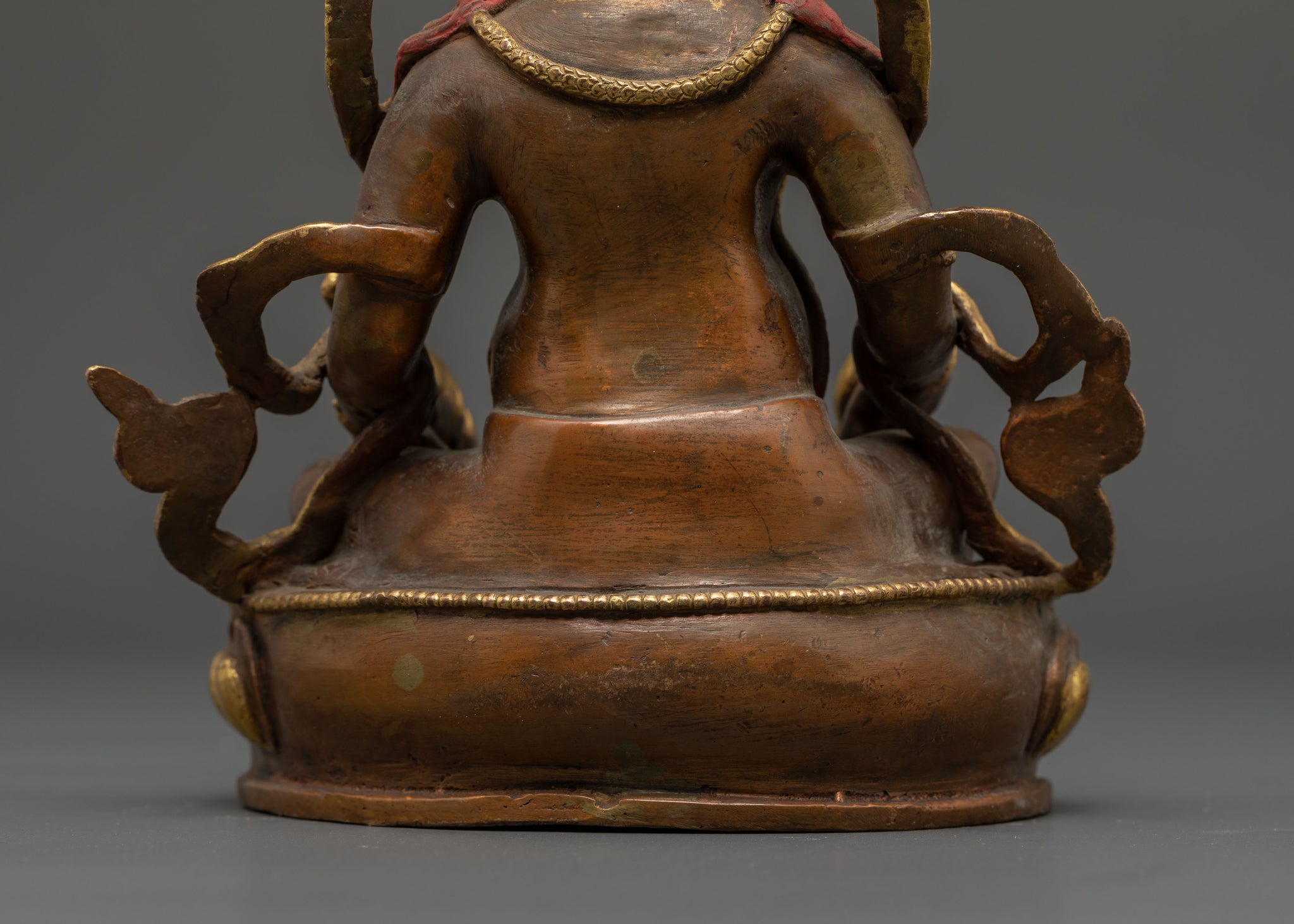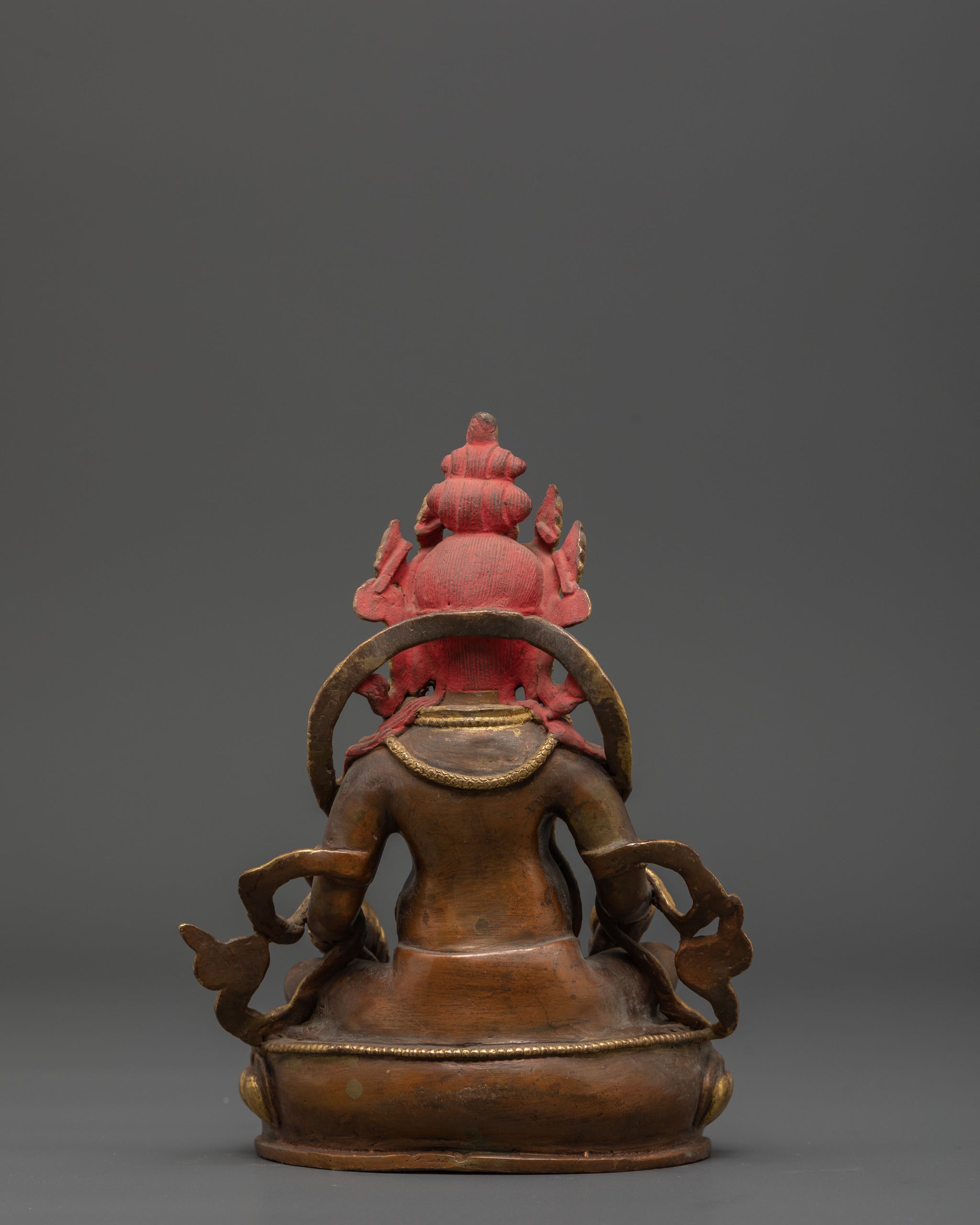 Dzambhala is shown sitting, holding a mongoose in his left hand to represent the removal of material and spiritual impediments, while his right hand holds a precious "mani" citron fruit. Dzambhala's strong yet sympathetic visage reminds practitioners of his protective nature and capacity to alleviate poverty by providing spiritual and practical gifts. The intricate engravings on his flowing robes, ornaments, and religious symbols demonstrate amazing craftsmanship, making this statue a reminder of the blessings of abundance and generosity.
