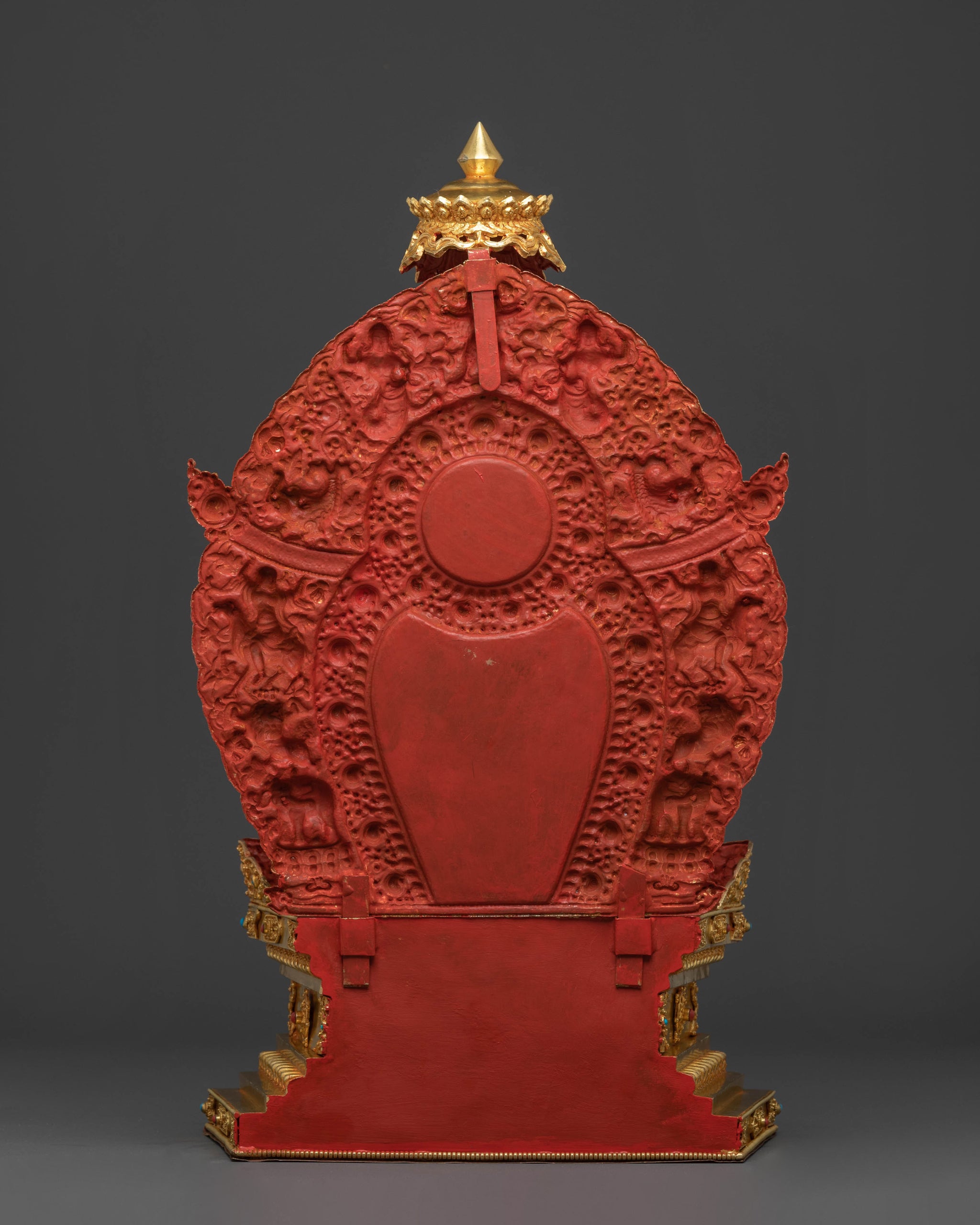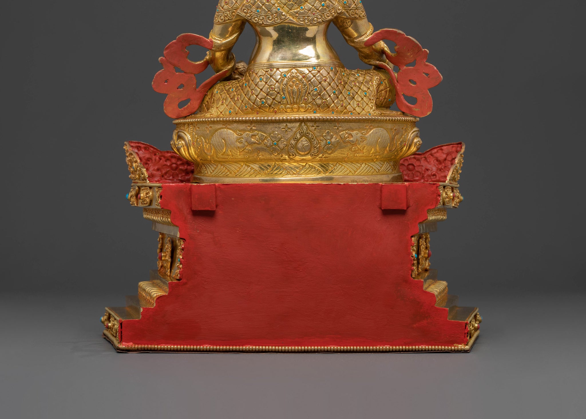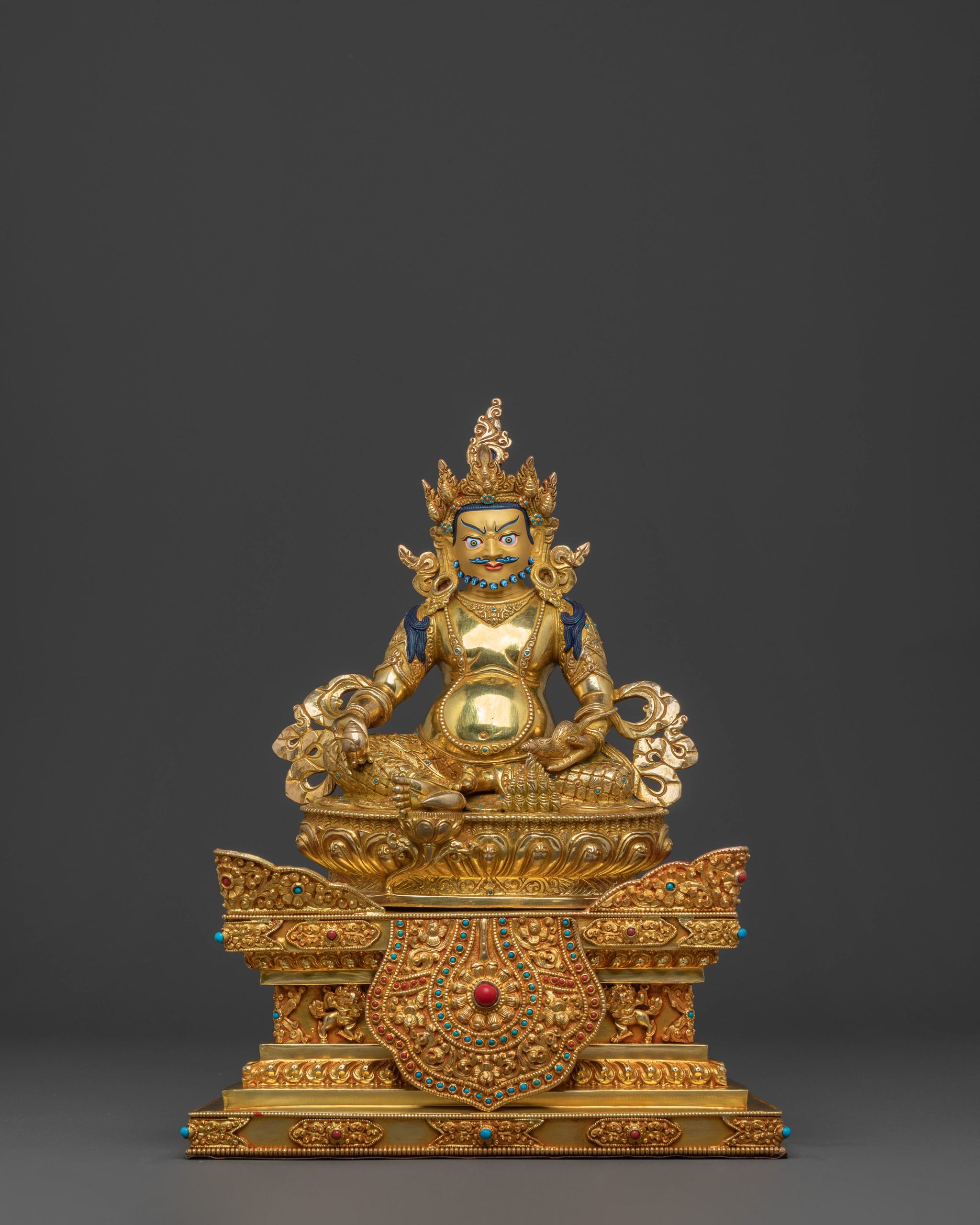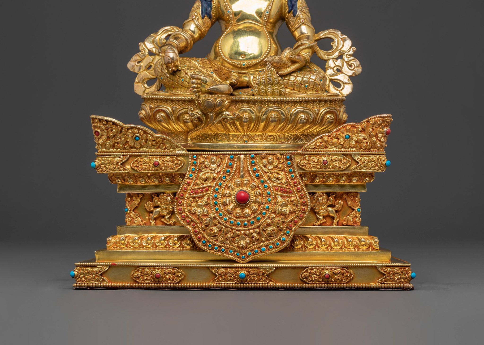 Radiating generous benevolence, this magnificent sculpture of Dzambhala on a throne embodies the spirit of boundless prosperity. Standing 47 cm (18.5”) tall on a 27 cm (10.6”) base and weighing 3.8 kg, this 24K gold-gilded copper statue, enhanced with acrylic paintings and gemstone accents, exudes abundant grace, protective energy, and spiritual wealth, bringing auspiciousness to any sacred space. Covered with a triple layer of 24K gold gilding, it is meticulously carved with deeply engraved carvings, creating a magnificent 3D-like effect that further elevates its divine presence.