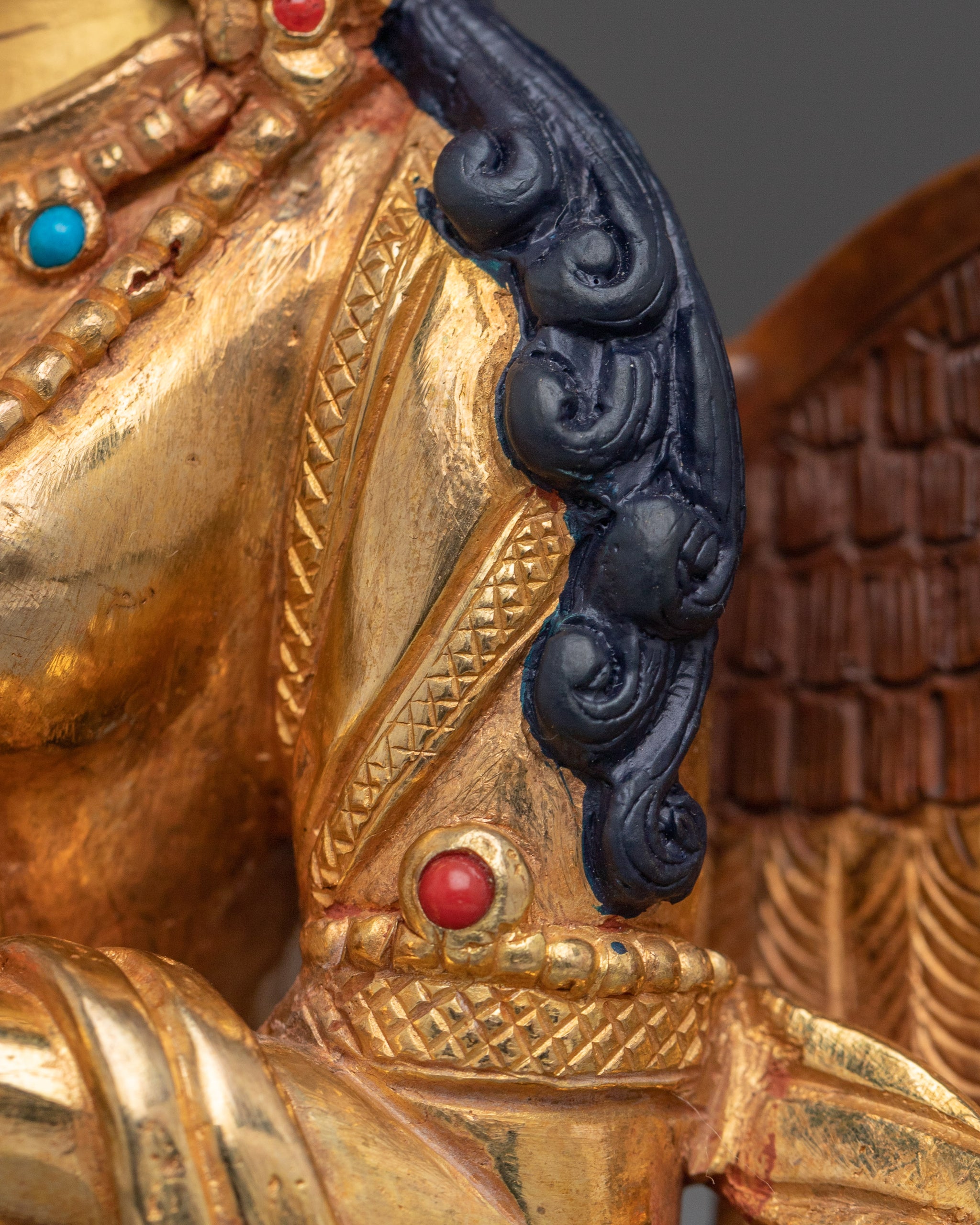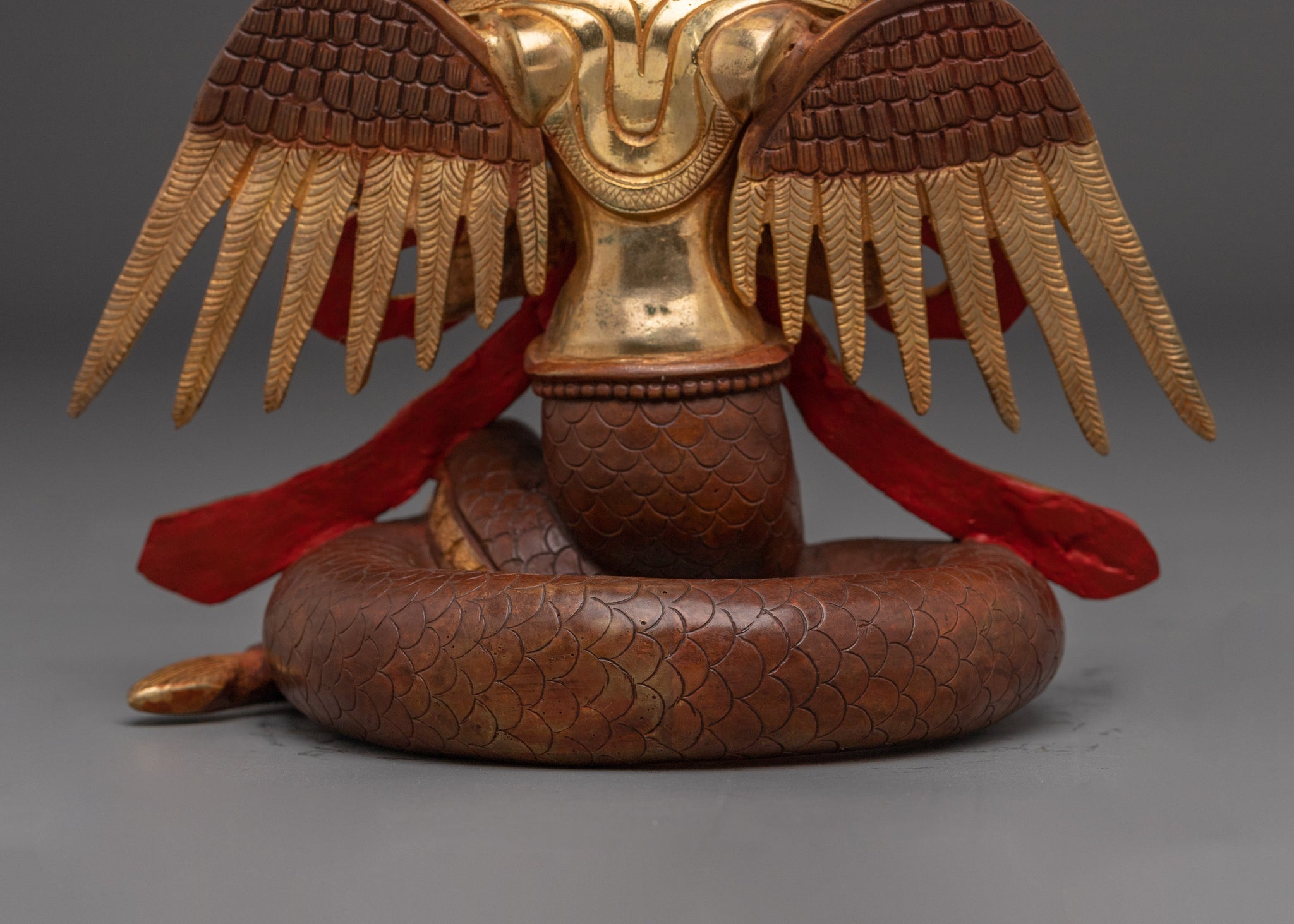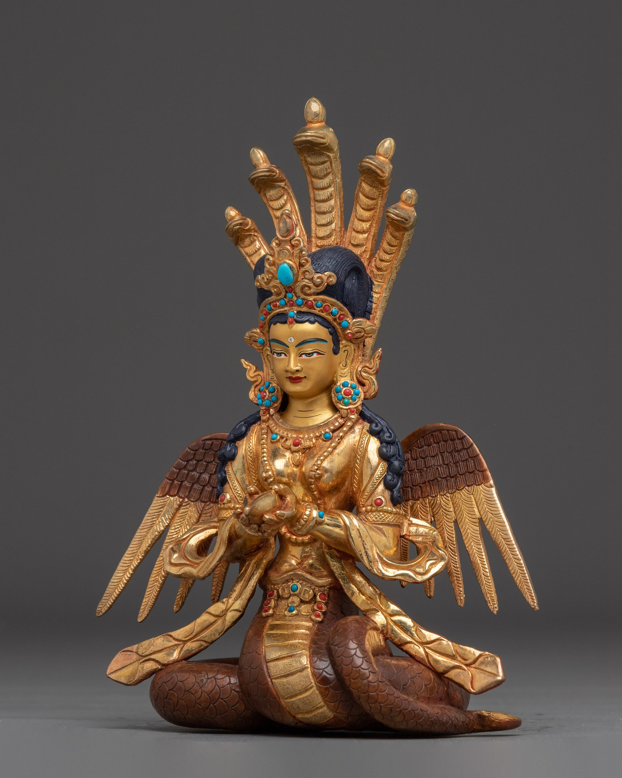 The Tibetan Nagakanya captivates with her striking fusion of human and serpent traits. Her upper body, elegantly human, holds a precious jewel symbolizing spiritual riches and blessings. Below, her form coils into a serpent, linking her to the mighty naga spirits of water and guardianship. Rising behind her head, multiple nagas fan out like a protective hood, enveloping her in divine shelter. Delicate wings surround her, lending an otherworldly grace that highlights her role as a sacred guardian and messenger between realms. This sculpture beautifully embodies her power, protection, and the flow of spiritual energy.