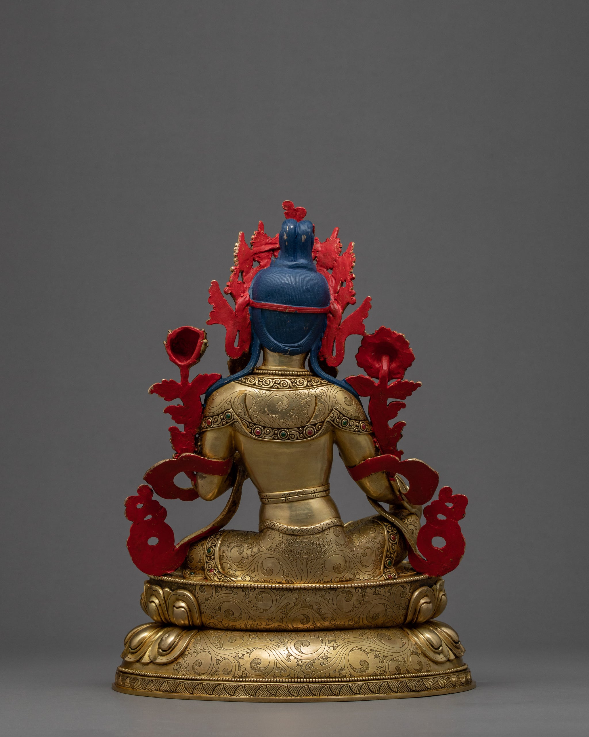 Seated Green Tara Statue is hand-carved and plated with pure 24K gold. Tara's enlightened action can safeguard those who connect with her practice from all anxieties and their sources. "OM TARE TUTTARE TURE SOHA" is her mantra.