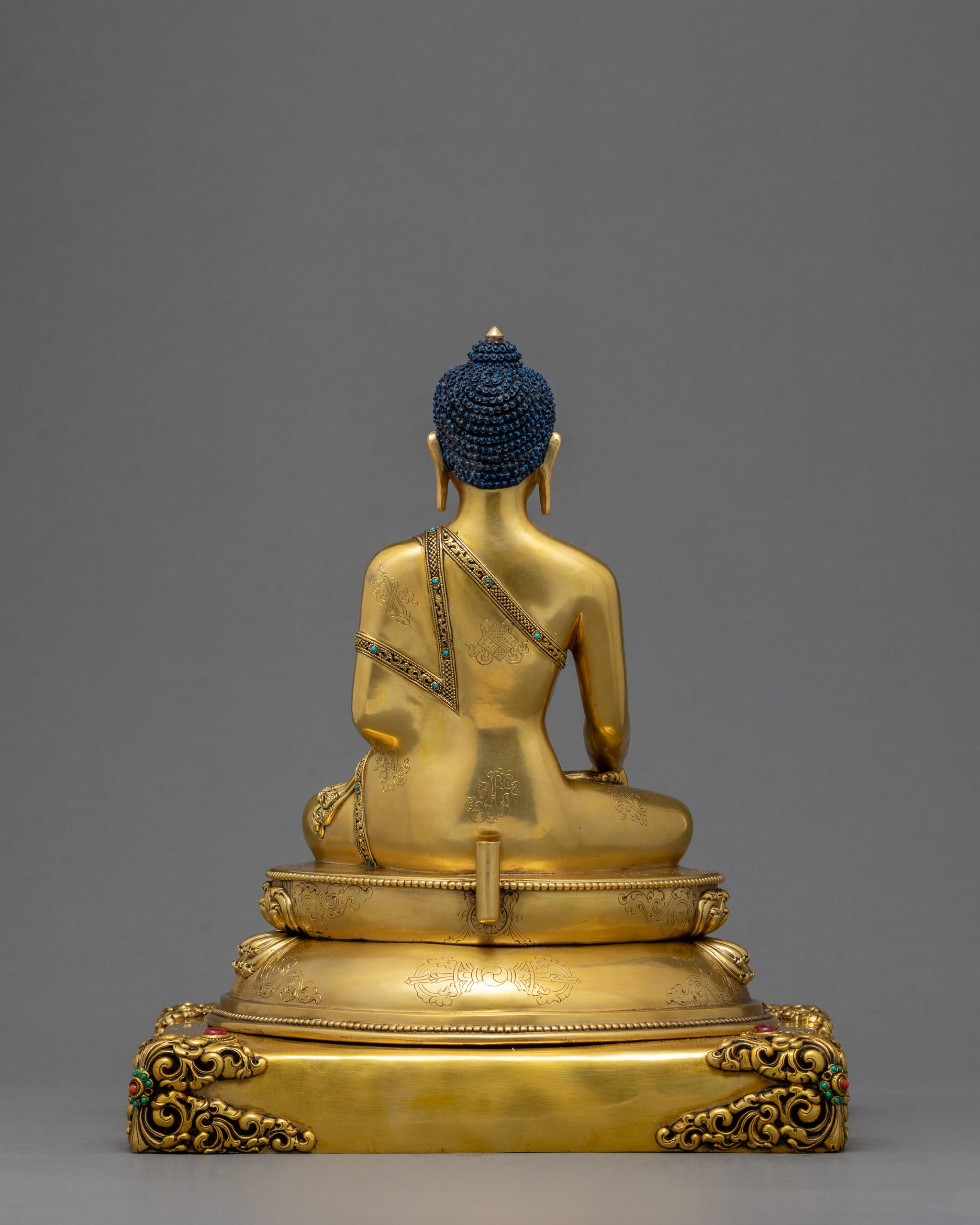 Shakyamuni Buddha is seated with crossed legs atop a moon disc lotus seat traditionally sculpted in Himalayan art. A gold robe embraces the shoulders and extends around the body and legs. The halo behind his serene face is exquisitely handcrafted and embedded with pure 24k gold. We have crafted this exquisite Buddha statue in a pure copper body and gilded it with 24k gold. It took more than a month to complete with more than two artists of Kathmandu valley whose artisan has passed from generation to generation.