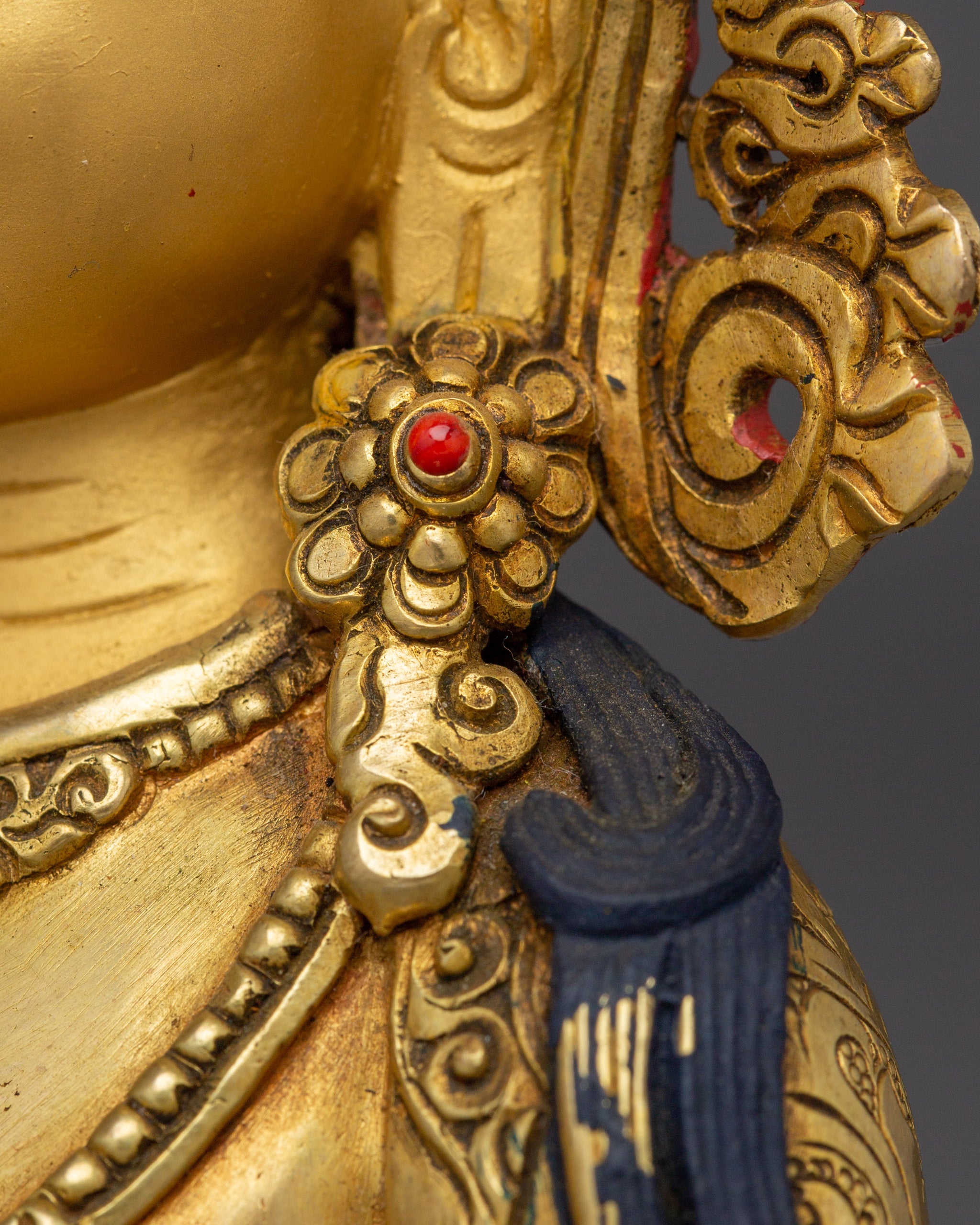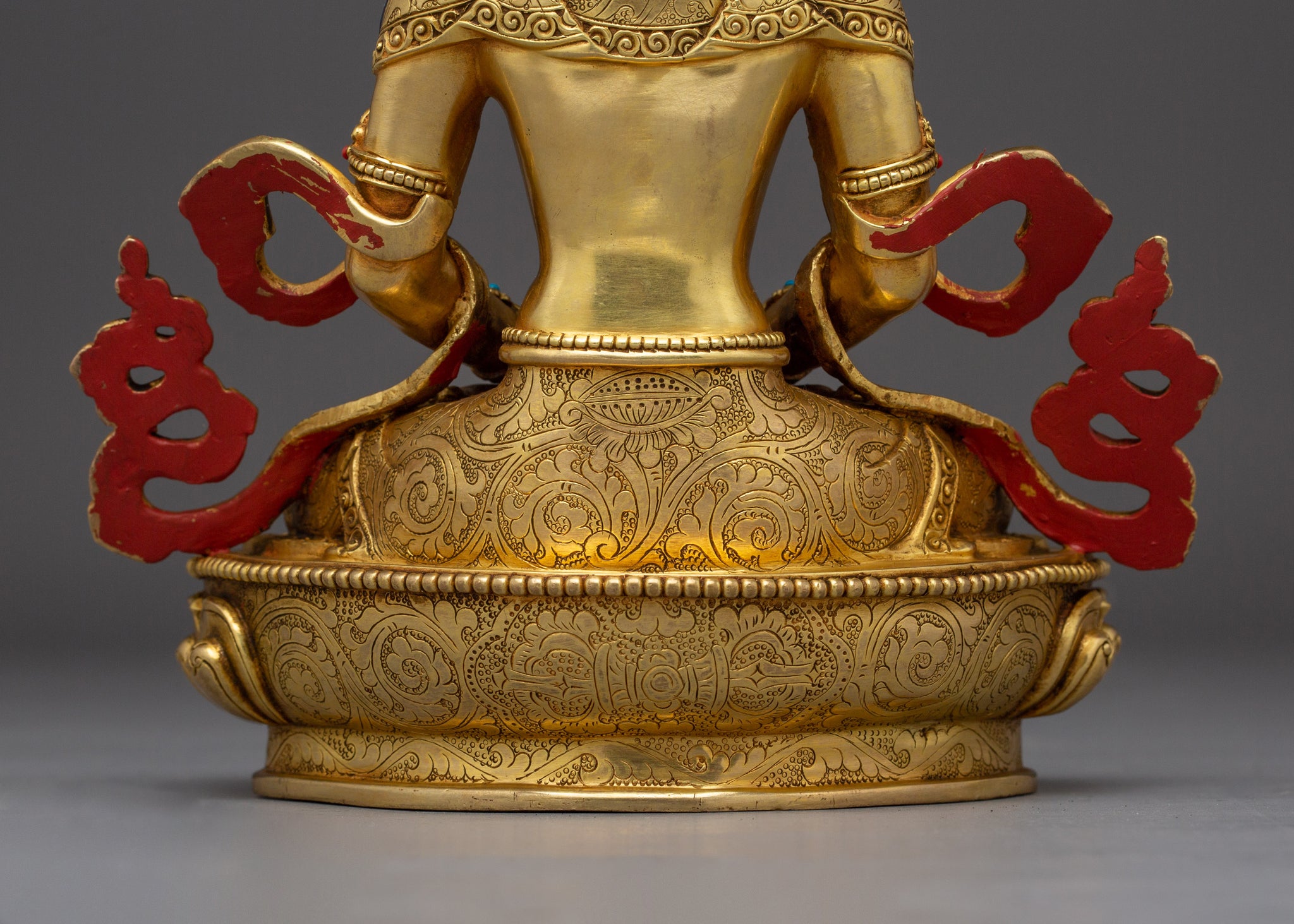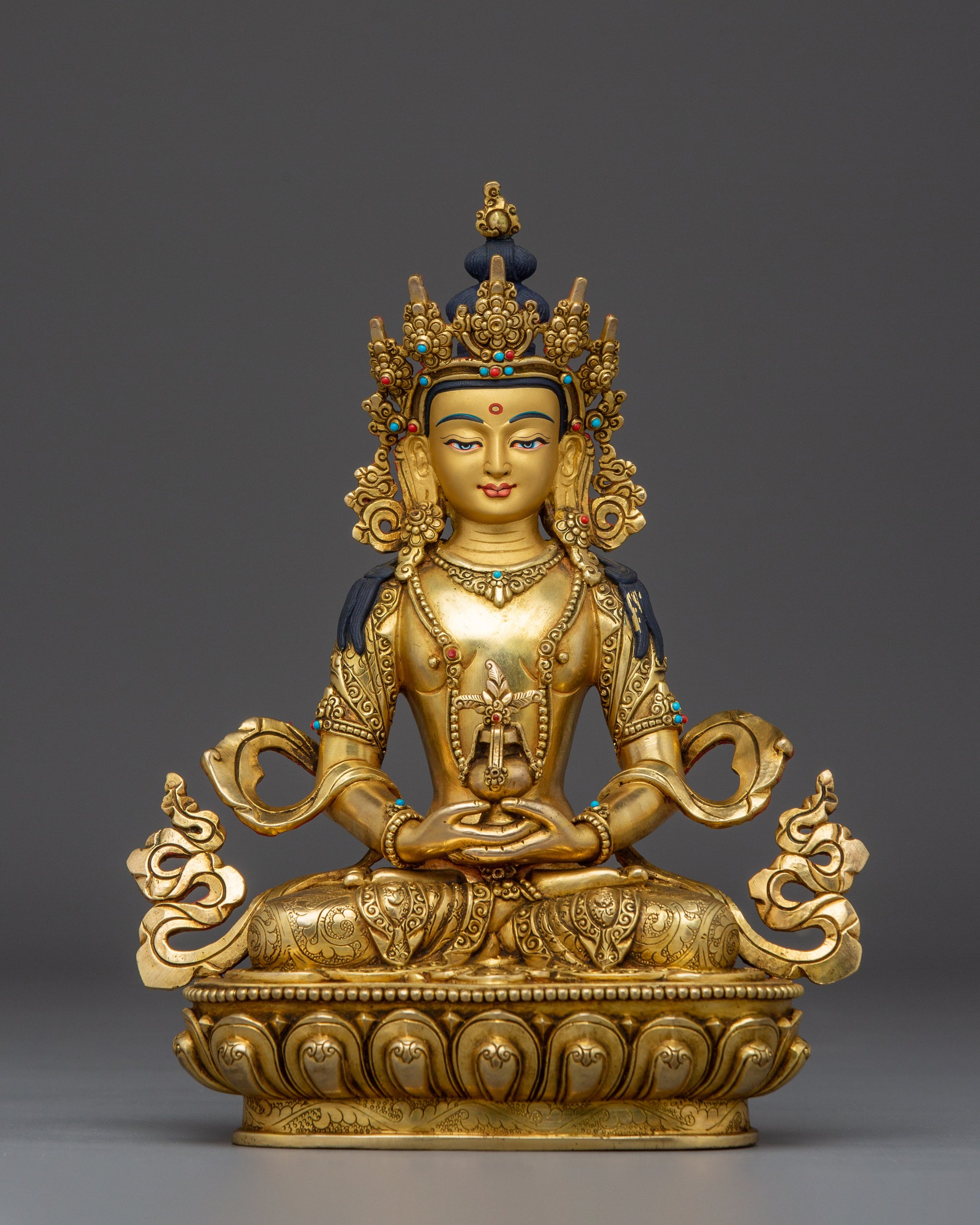 This Serene Amitayus Handmade Statue stands at 8.9”/22.5cm in height and 7.1”/18cm at the base, weighing 1.71 kg. Made from 24K Gold Gilded, Gold & Acrylic Paintings, Copper Body, and adorned with gemstones, this exquisite piece represents Amitayus, the Buddha of Infinite Life. Expertly handcrafted by skilled Nepali artisans, it serves as a refined addition to meditation spaces, altars, or personal spiritual collections.