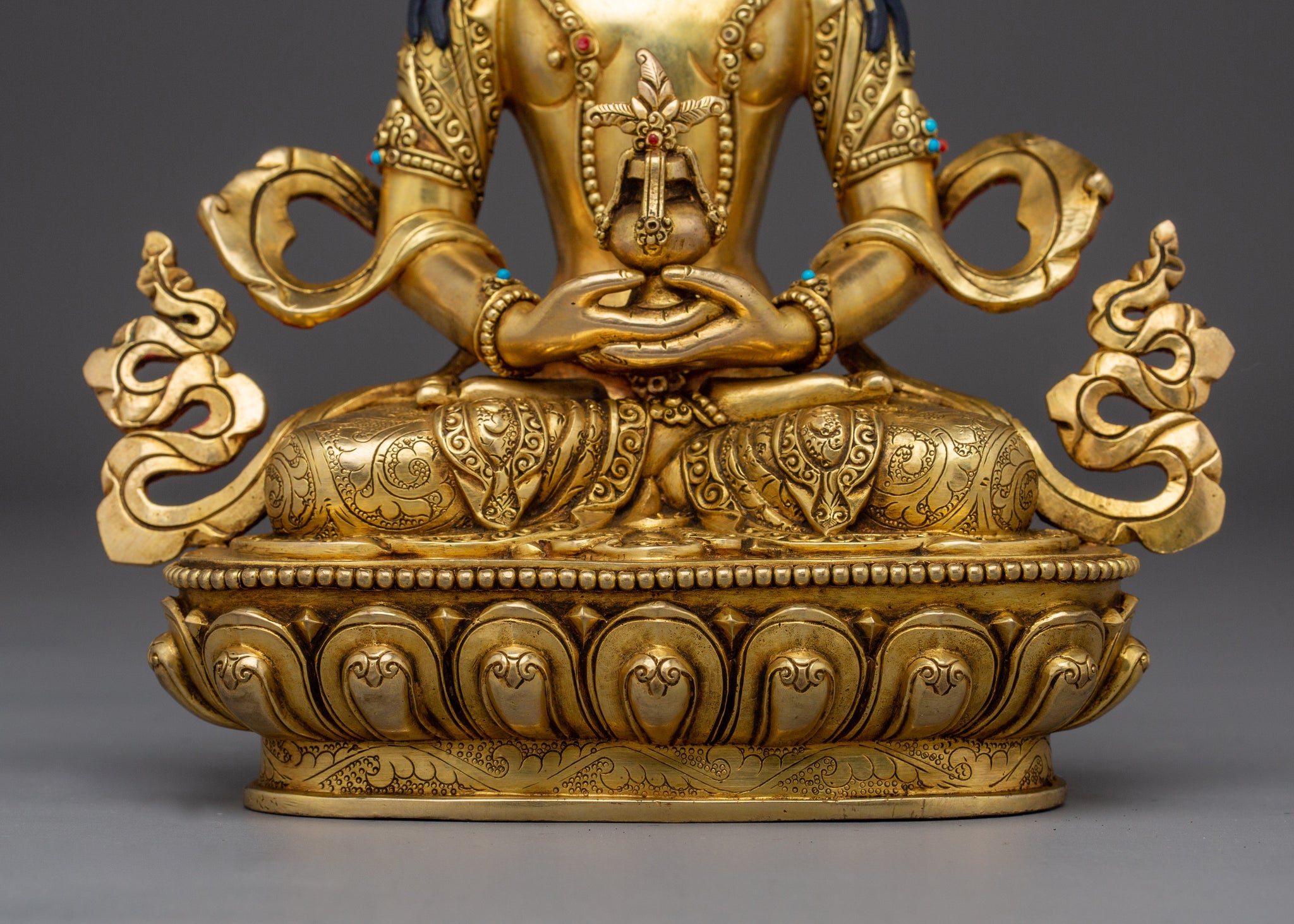 Amitayus Buddha is shown seated in a meditative pose atop a moon disc and lotus base, symbolizing purity and the awakened state. He holds a sacred vessel filled with the nectar of immortality, representing longevity and healing energy. His calm and compassionate expression radiates infinite wisdom and benevolence. With hands in the Dhyana Mudra—the gesture of deep meditation and focus—he embodies inner peace and spiritual clarity. Adorned in celestial robes that reflect his divine nature, Amitayus stands as the embodiment of long life, spiritual abundance, and the realization of heartfelt aspirations.