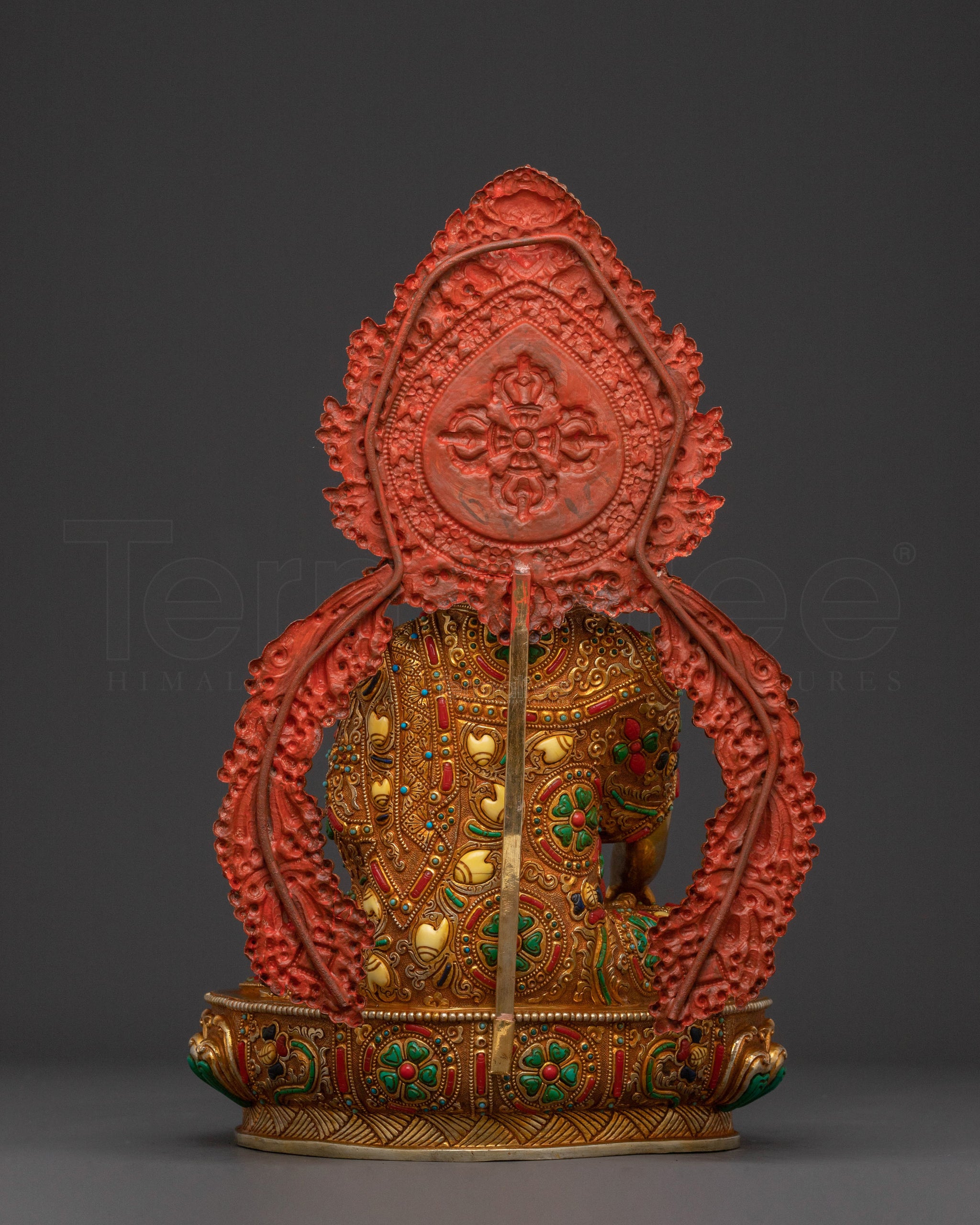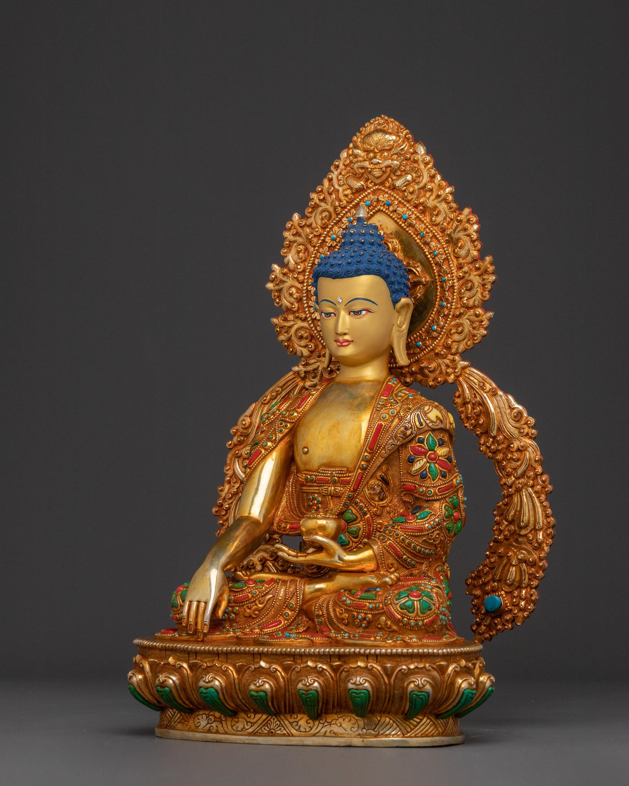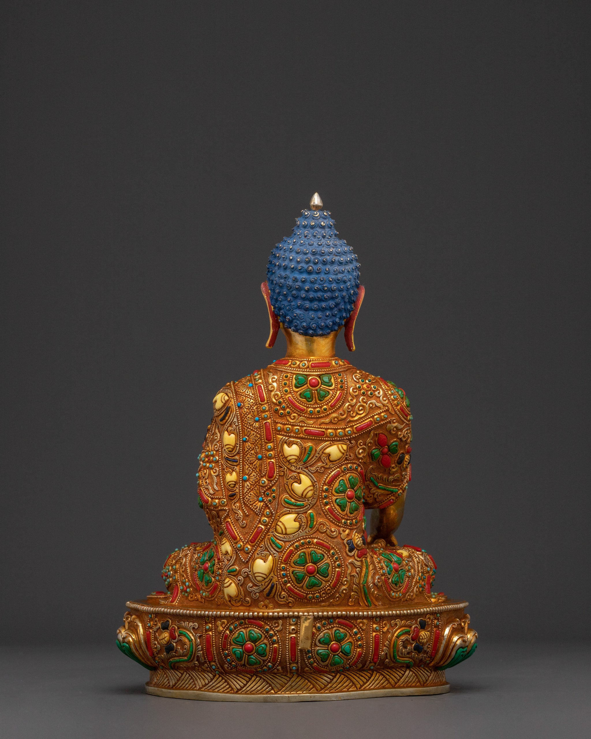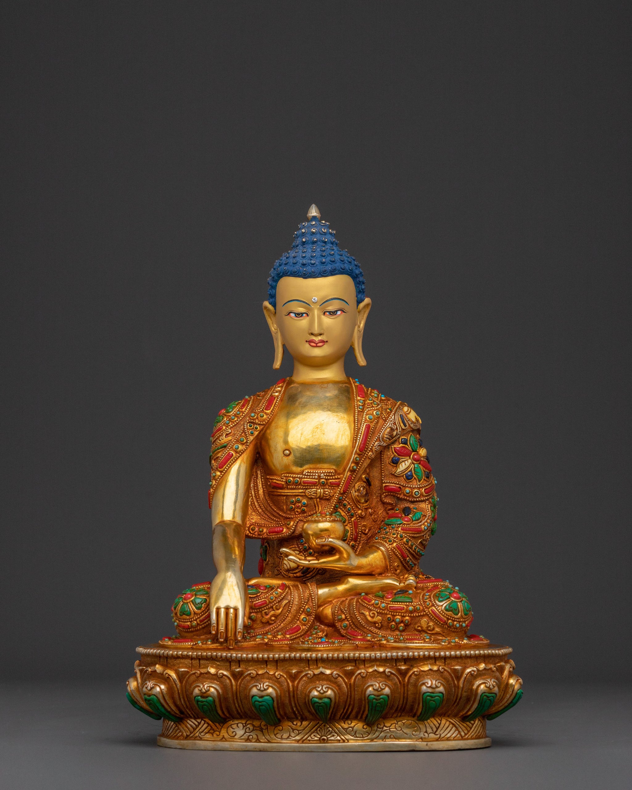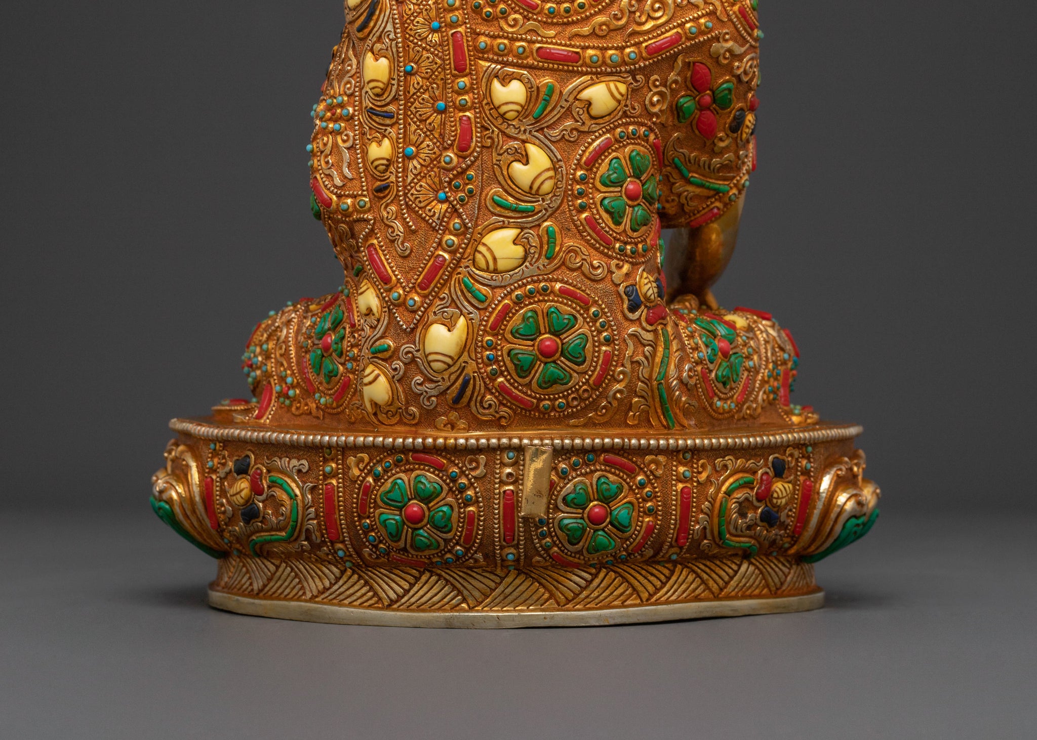 This serene Meditation Shakyamuni statue depicts the Buddha at his moment of enlightenment, embodying complete tranquility. Handcrafted in Nepal, it stands 39.5 cm (15.5”) tall with a base width of 24 cm (9.5”), made from pure copper and decorated with 24K gold gilding, acrylic paintings, and hand-carved gemstones. Weighing 4.89 kg, this beautiful piece exudes a noble presence, serving as a striking focal point for reflection and peace in any space and showcasing exceptional Himalayan craftsmanship.