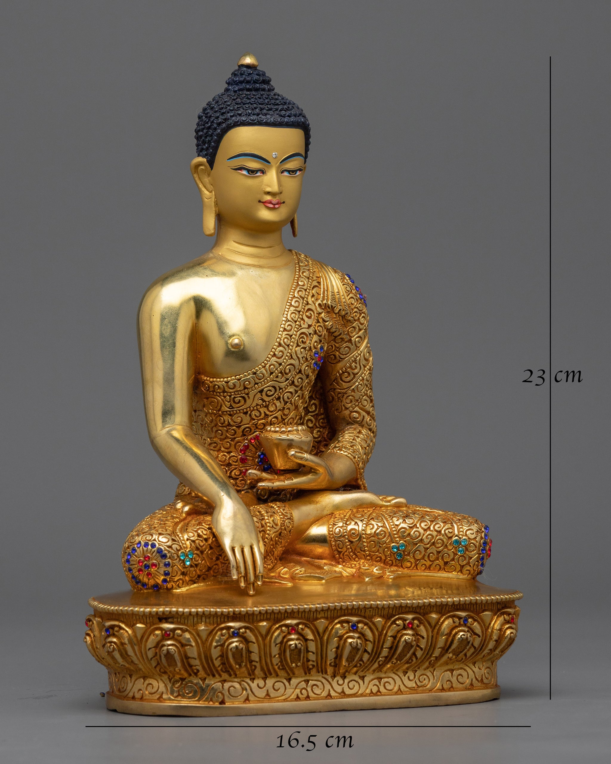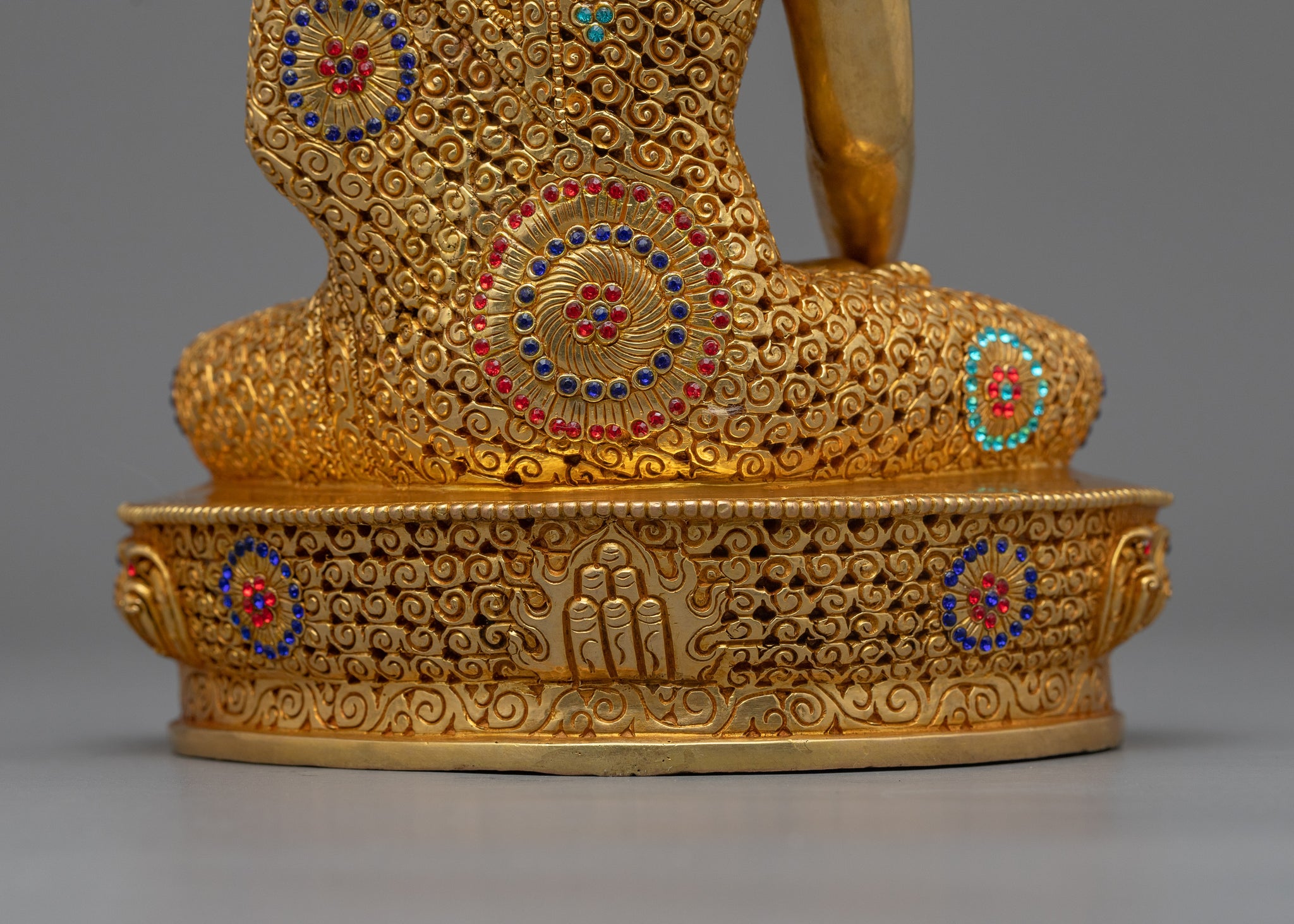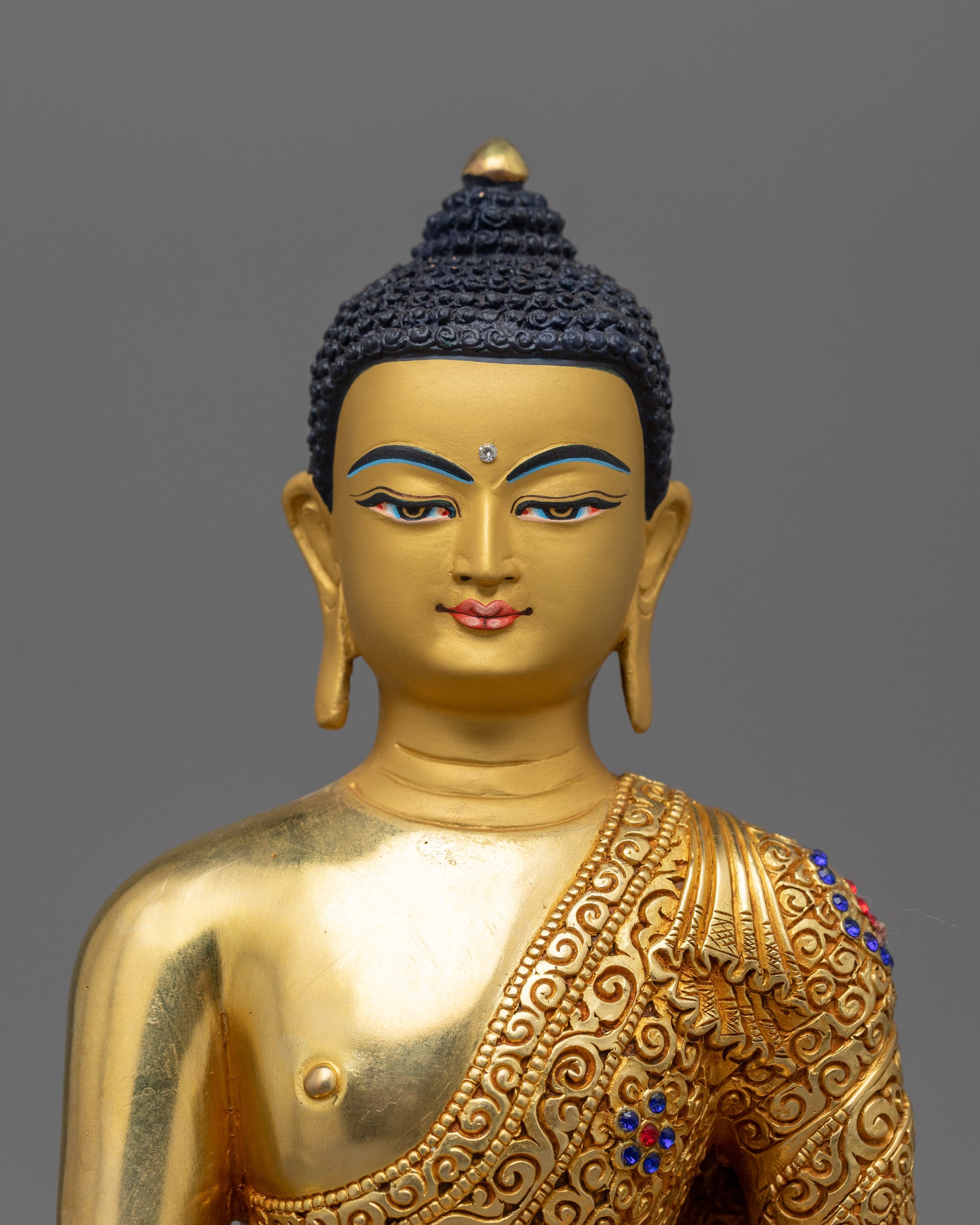 The Serene Shakyamuni Buddhah Statue, which has been expertly made from copper and richly gilded in 24K gold, is a work of fine art. Every small detail, like the calm countenance and the finely crafted attire, captures the inner serenity and enlightenment of Shakyamuni Buddha. The sculpture emanates a sense of peace and spiritual grace, enhanced with detailed paintings in gold and acrylic that evoke contemplation and reverence. The Shakyamuni Buddha Figure, which was carefully constructed with every detail, reflects the ageless lessons of compassion and wisdom, providing comfort and direction to anybody who seeks it.