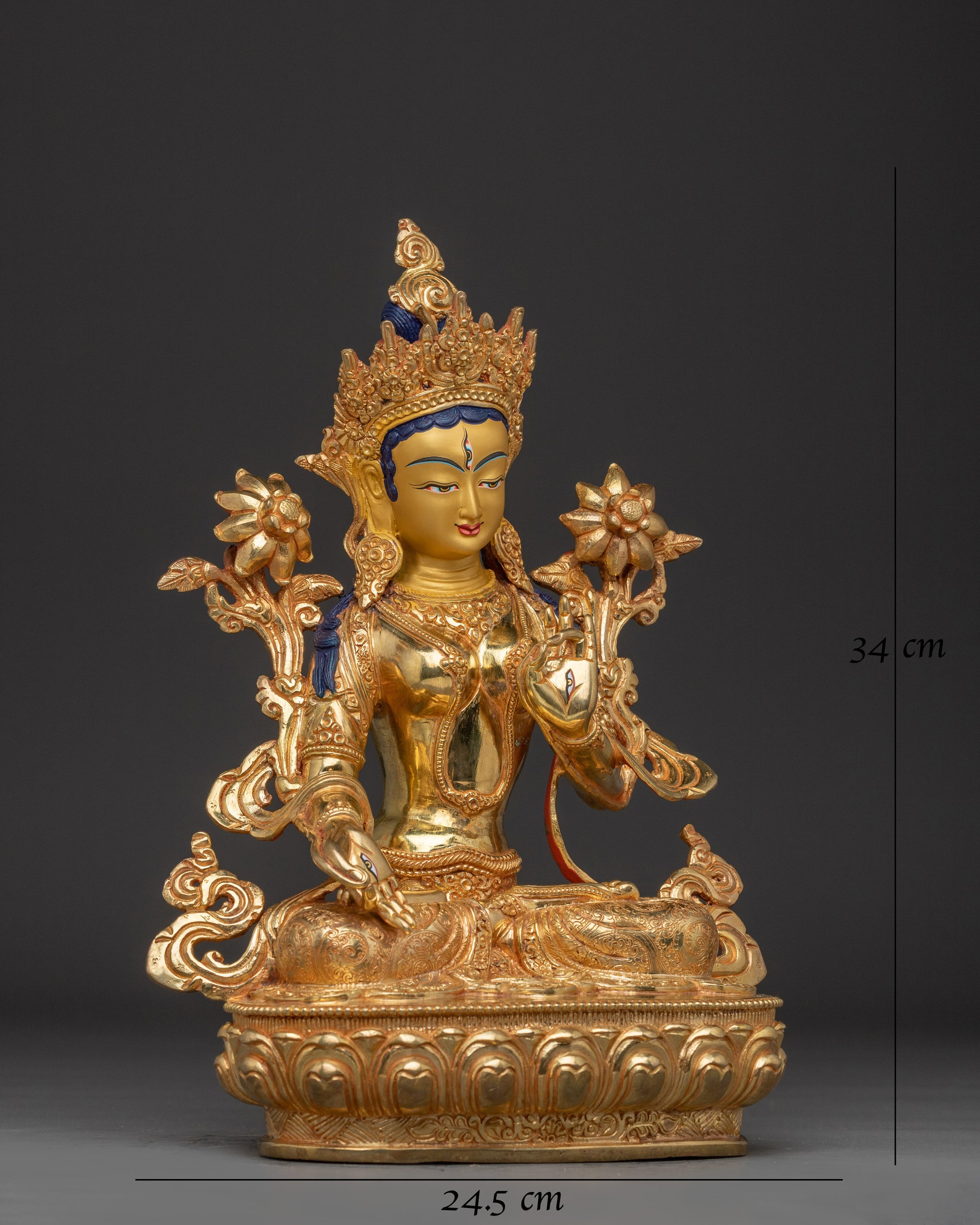 The Serene White Tara Sculpture for Meditation, a symbol of compassion, healing, and longevity, radiates divine grace and spiritual blessings. This wonderfully handcrafted statue, which measures 13.4" (Height) x 9.6" (Base) and weighs 3.94 kg, is made of copper, 24K gold gilding, gold and acrylic paints. This figure, crafted by talented Nepalese artisans, symbolizes the spiritual traditions of Himalayan Buddhism, making it an important addition to altars, meditation places, or sacred collections.