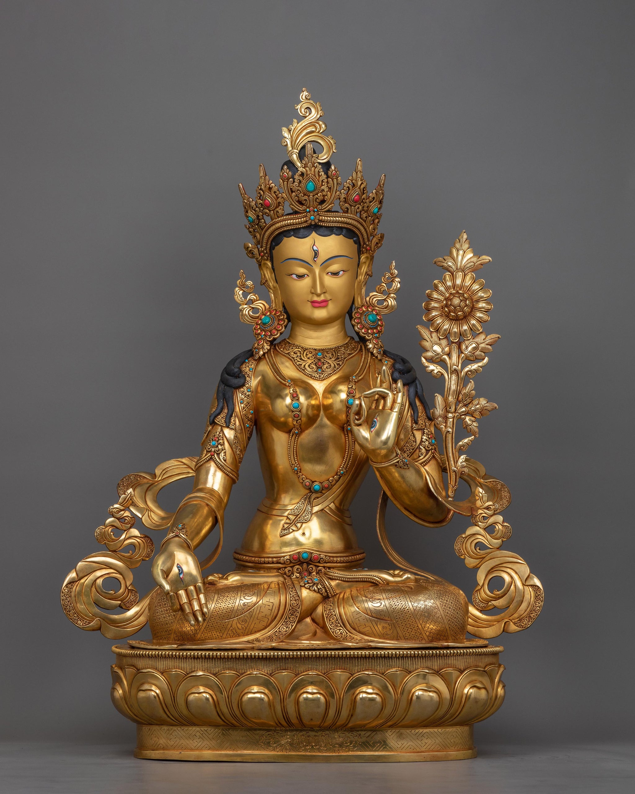 This sculpture, which has a robust copper body and a 24K gold plating, sparkles magnificently, emphasizing Tara's exquisite posture, sympathetic expression, and divine presence. The gold & acrylic paintings add depth and vibrancy to the statue, with each of the seven eyes - on her forehead, palms, and soles - meticulously depicted to symbolize her omniscient awareness of the suffering in the world.