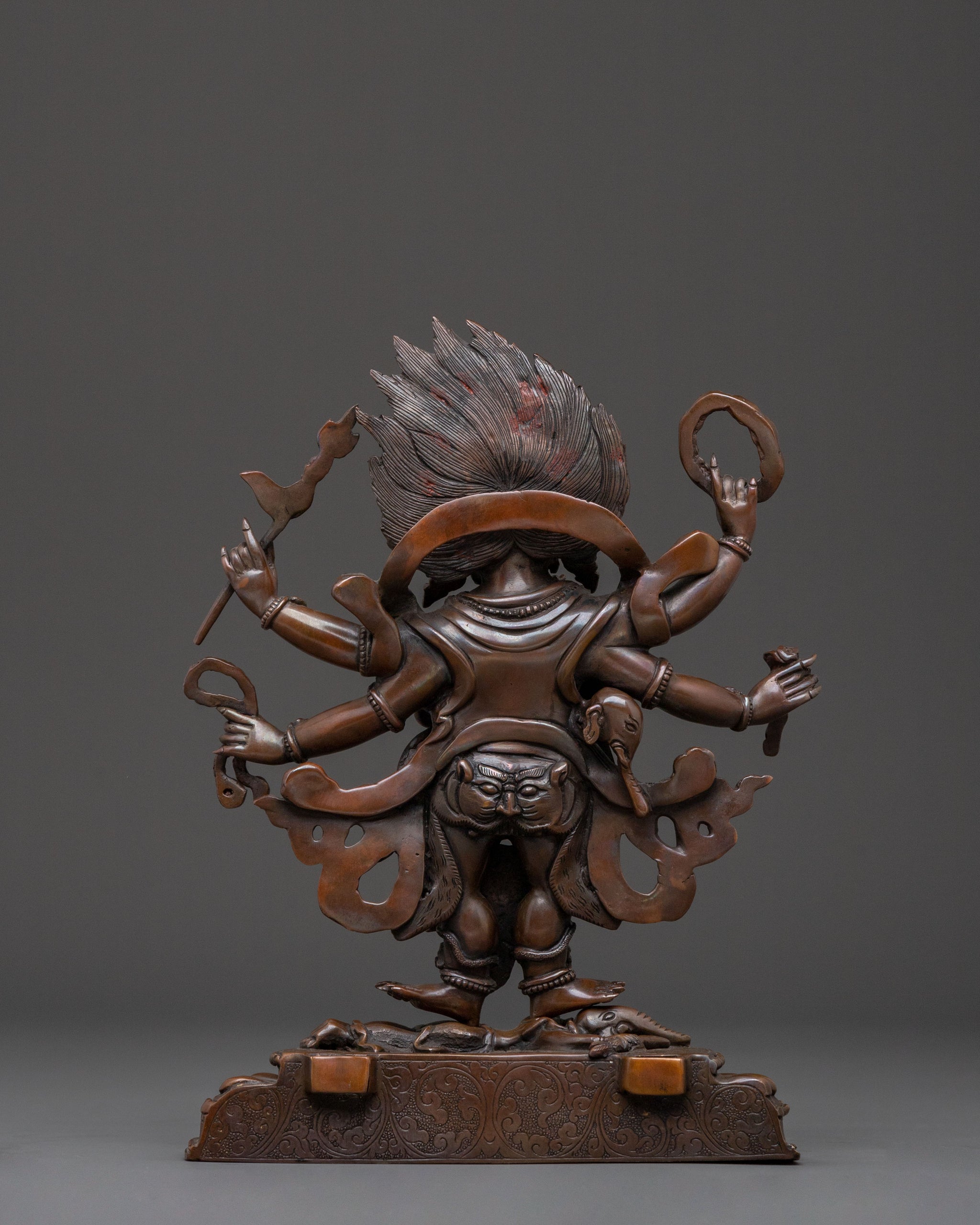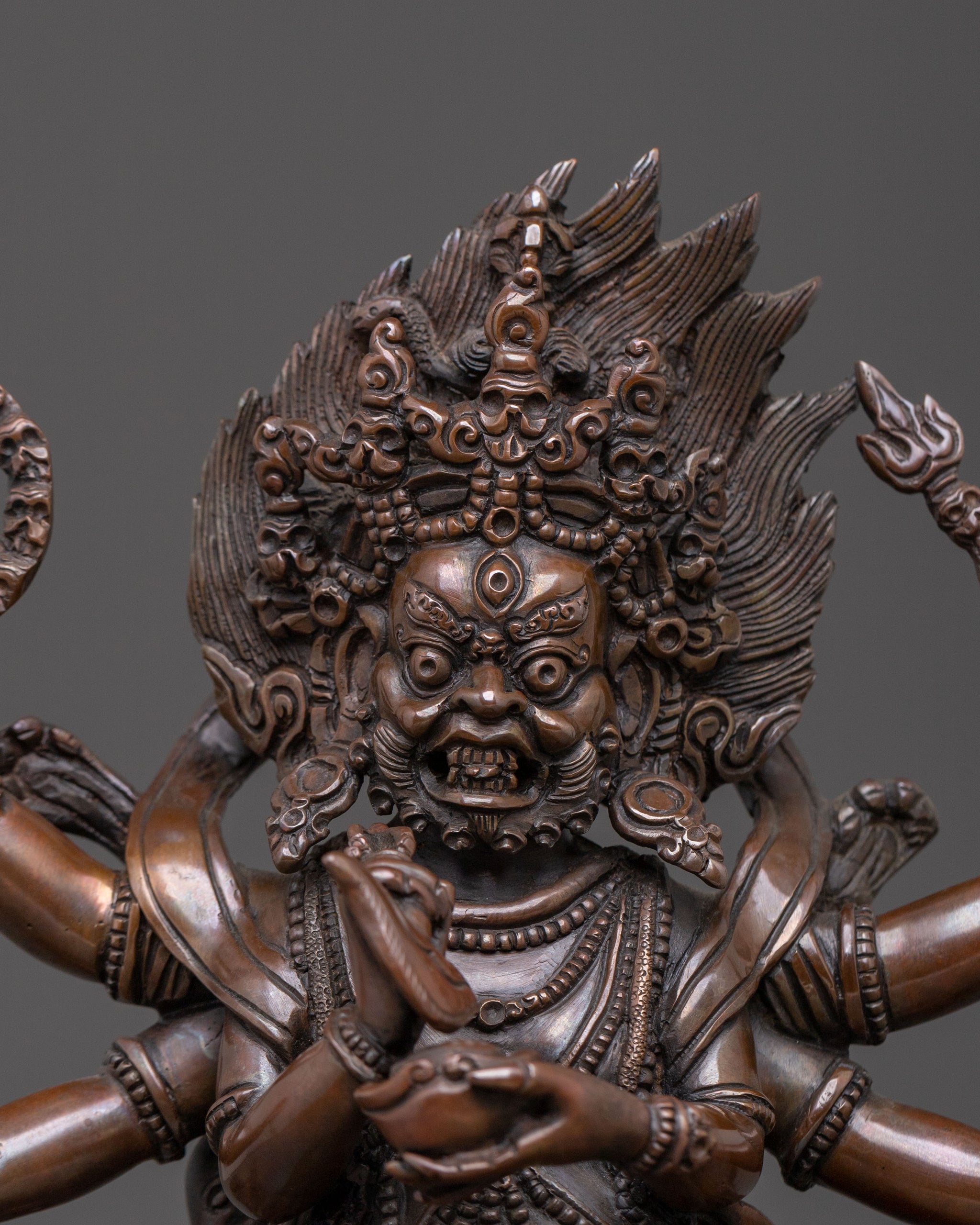 The three-headed Hayagriva is a rare find, especially the one with color. I was actually very glad to see that all the dharma implements are all mounted on hands so they won't fall off.