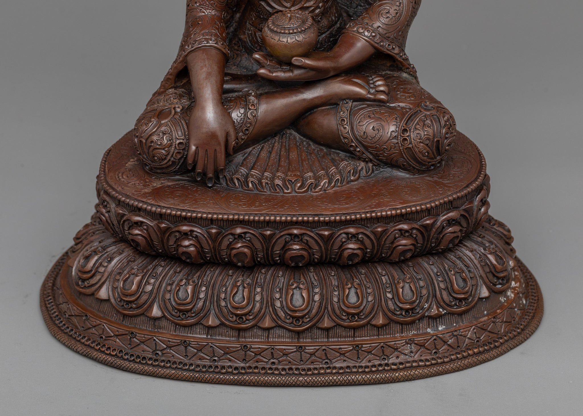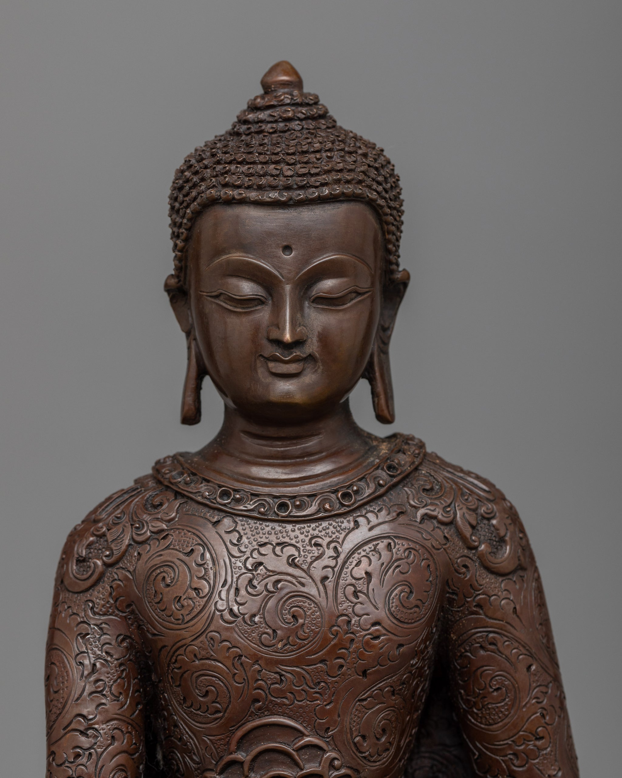 This Shakyamuni Buddha statue was painstakingly constructed by expert artisans, who paid close attention to every detail in order to bring Shakyamuni's enlightened essence to life. The oxidized copper body gives the statue a sense of authenticity and devotion, heightening its visual appeal and spiritual value. Every part of the statue, from the kind expression to the tranquil position, conveys Shakyamuni's enlightened energy and the depth of his teachings.