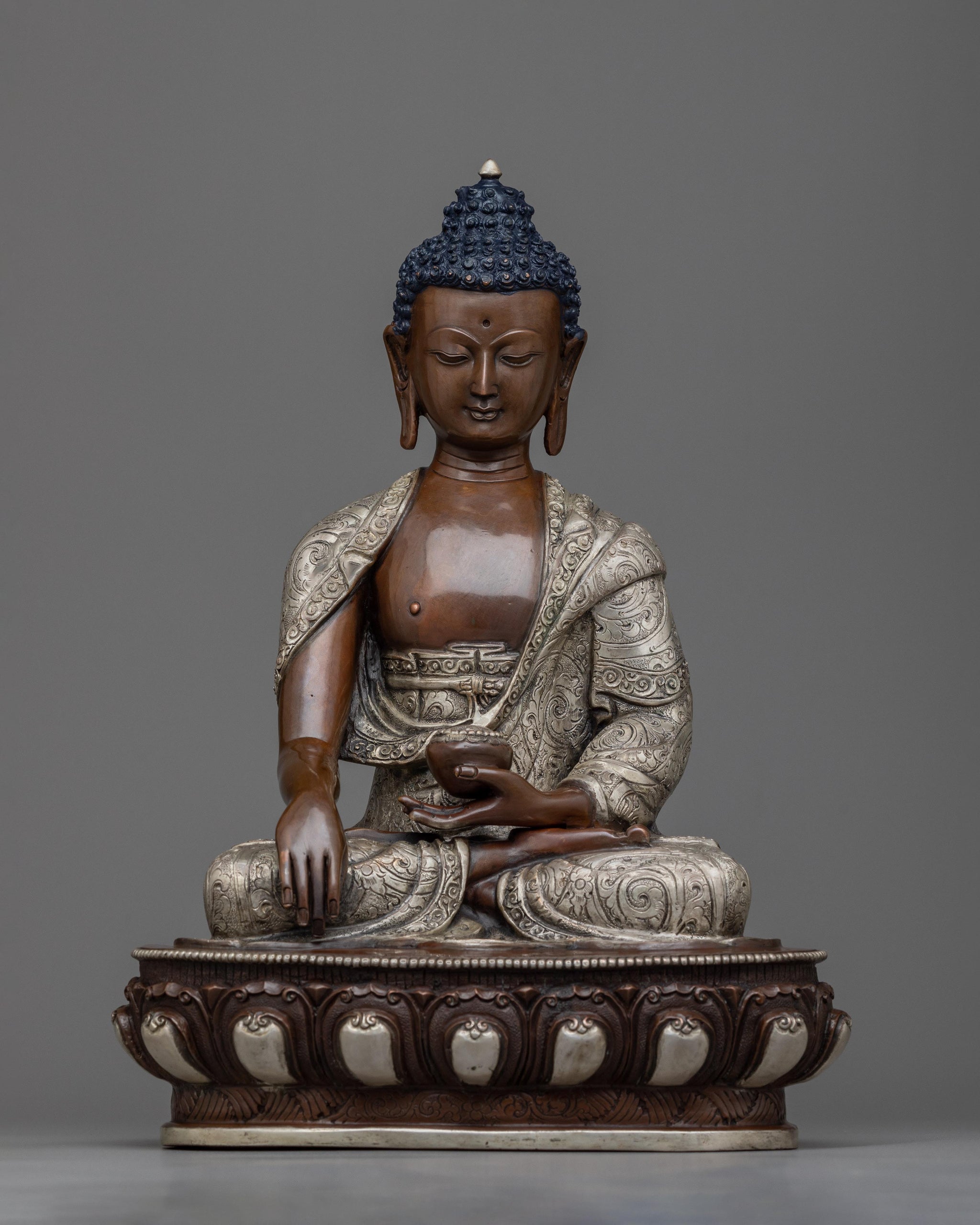 Meticulously hand-carved in Kathmandu, Nepal, by our master artist, The Shakyamuni Buddha is depicted sitting atop of moon disc of a lotus seat. The statue is made of a copper body and plated with silver. He is holding an alms bowl with his left hand, and his right hand is on earth touching mudra.