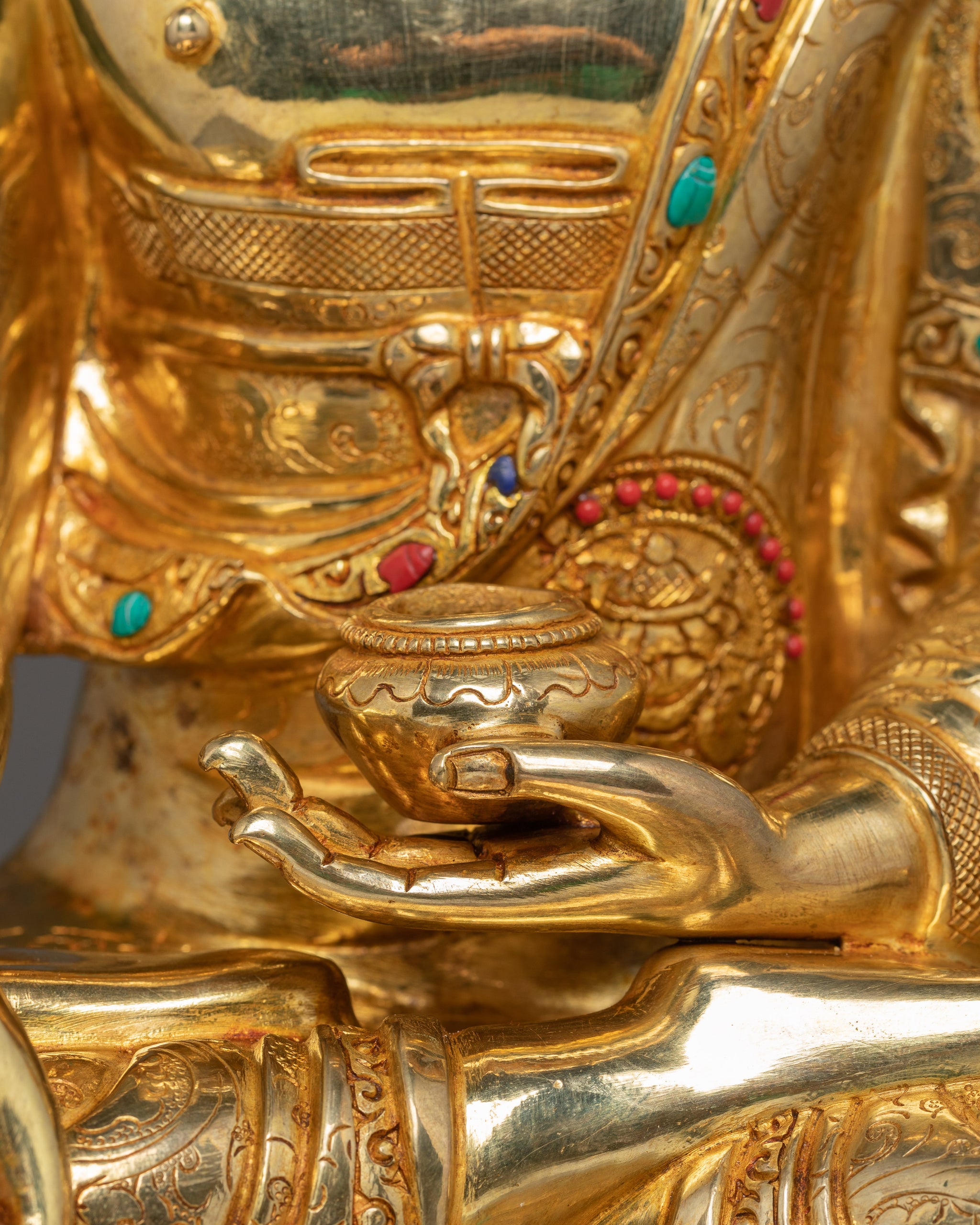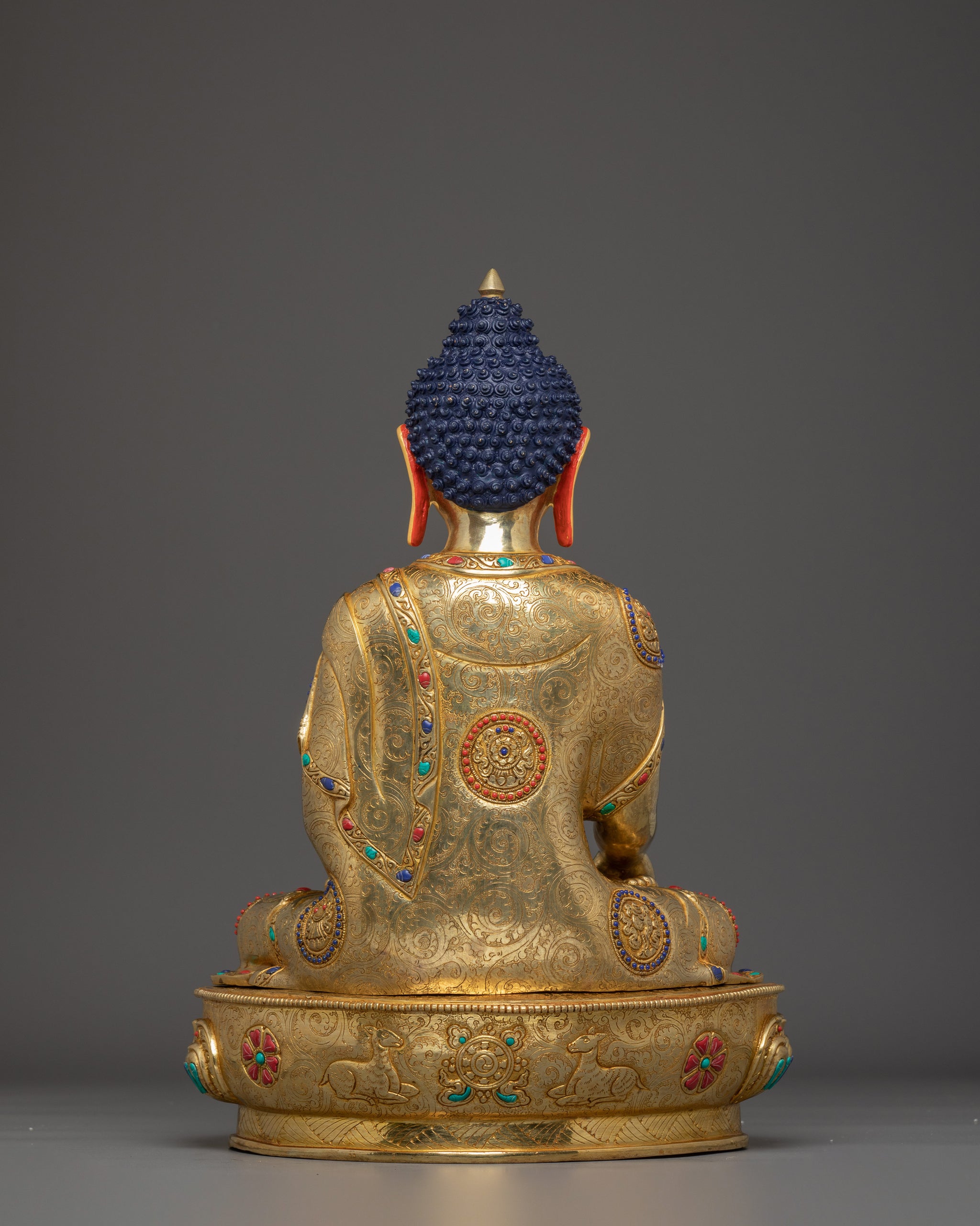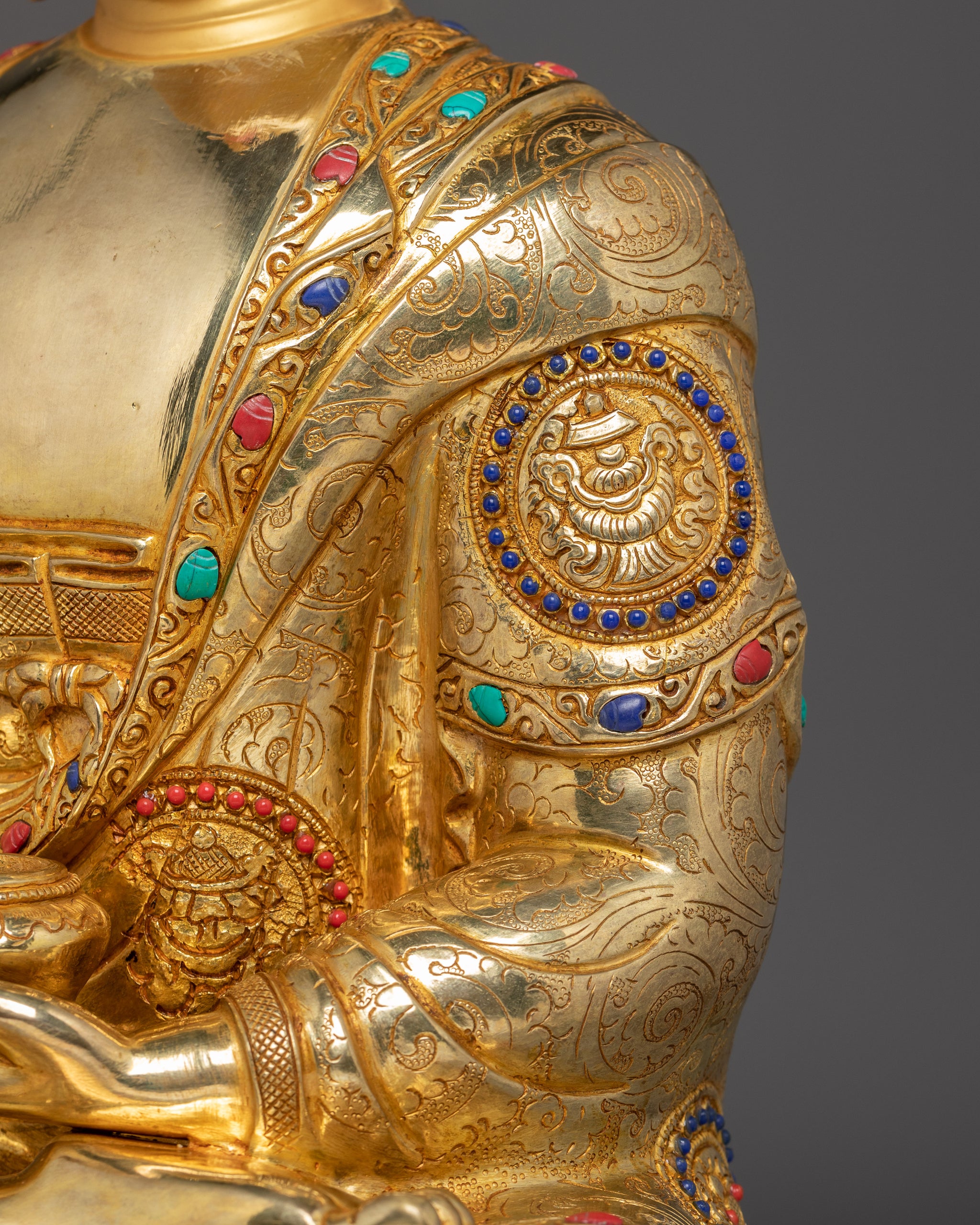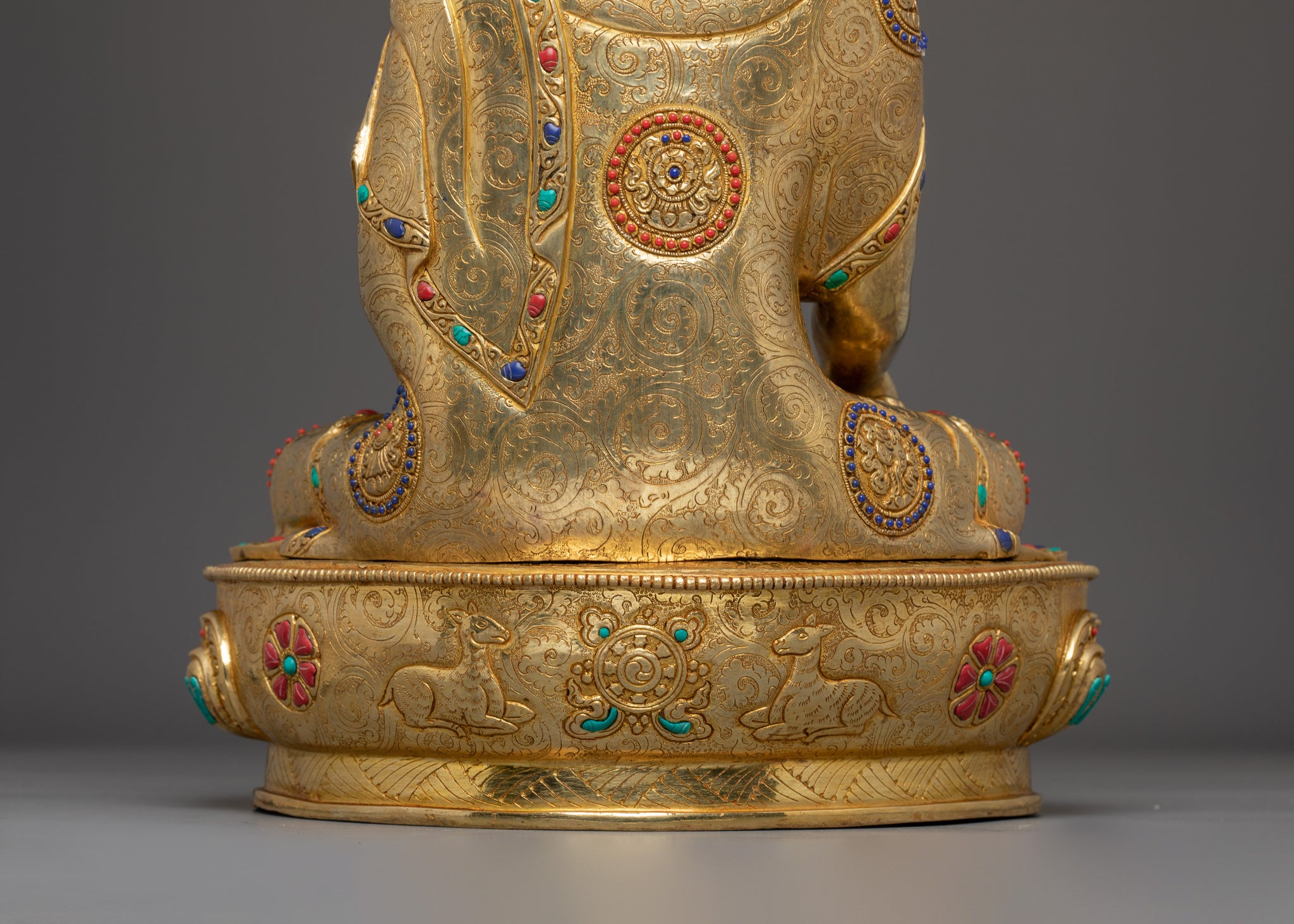 Shakyamuni Buddha, The Teacher of Timeless Wisdom measures 46 cm (18.1 inches) in height and 31 cm (12.2 inches) at the base, with a weight of 8.16 kg. Expertly crafted from a copper body, it is gilded with 24K gold and adorned with intricate gold and acrylic paintings. Ideal for enhancing personal shrines, meditation areas, or as a distinguished decorative piece, this artwork reflects the rich heritage and meticulous artistry of Himalayan masters.
