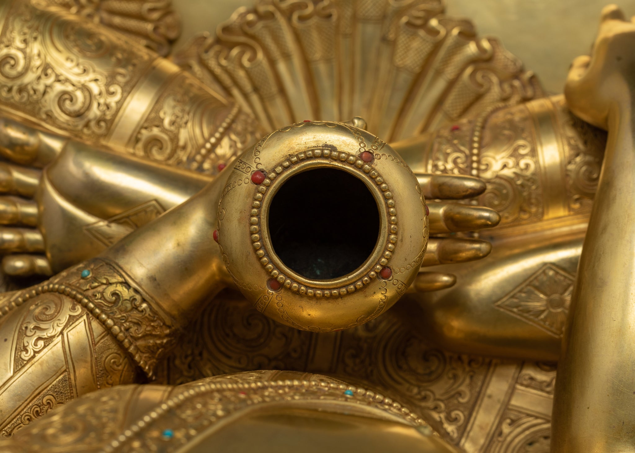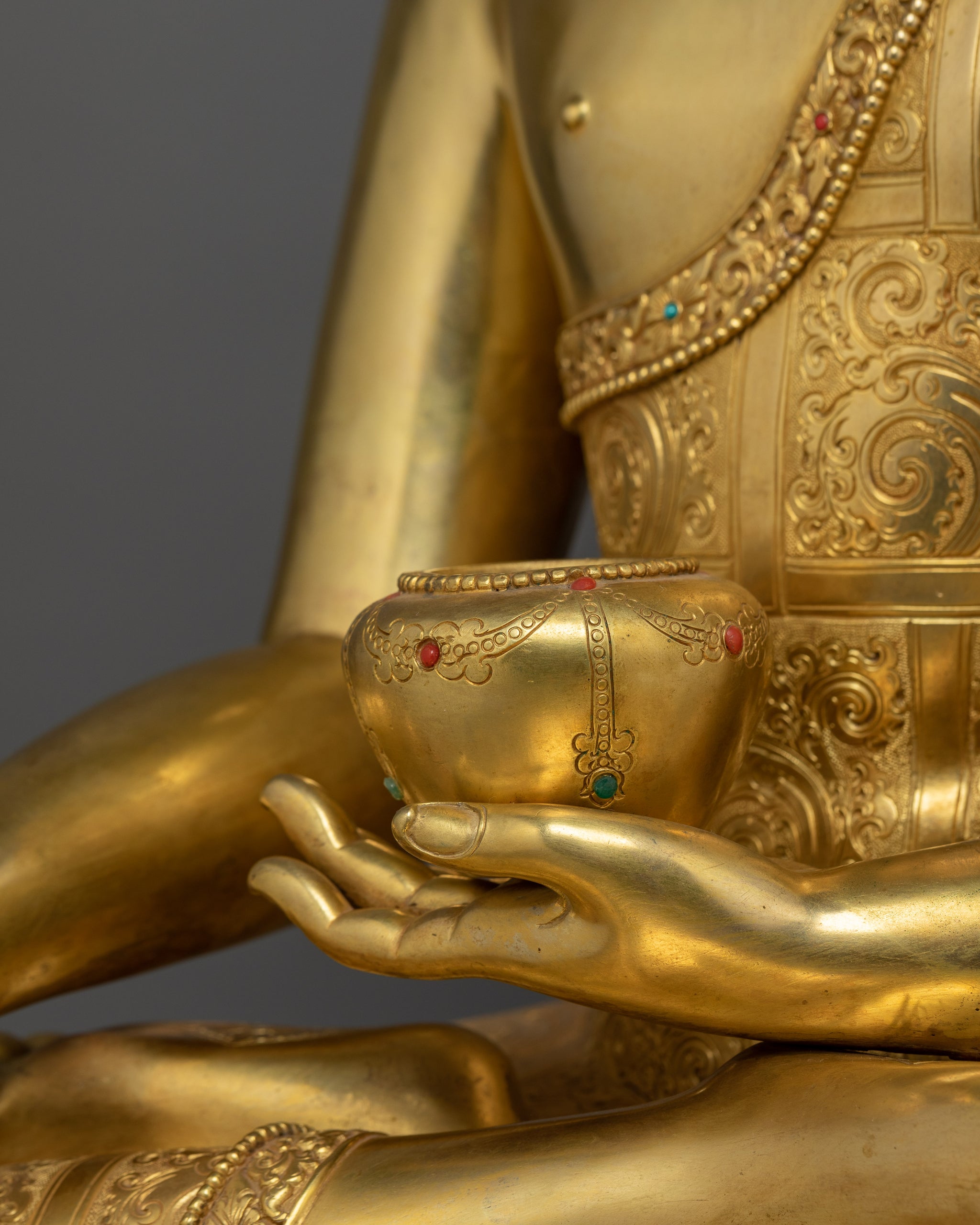 With this Buddhist statue, you may bring Shakyamuni Buddha's eternal knowledge and tranquility into your holy area. This statue, which weighs 25.01 kg and measures an amazing 25.2" (Height) by 18.5" (Base), is painstakingly made from a solid copper body, embellished with 24K gold gilding, and painted with acrylic and gold painting. This is an ideal for altars, shrines, or spiritual home decor with the exquisite workmanship of talented Nepalese artisans.