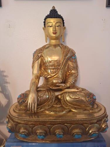 The statue, made of high-quality copper and gilded in 24K gold, exudes divine presence. The elaborate gold and acrylic paintings bring out every fine detail, from Shakyamuni Buddha's tranquil look to the complex patterns on his robe. Hand-carved gemstones, lending an air of elegance and luxury. This monument, weighing 4.37 kg, is both a visual marvel and a powerful spiritual anchor for any sacred location, Place this wonderful Shakyamuni Buddha statue in your home to promote deeper meditation and spiritual growth. Its presence will enrich your decor while also serving as a daily reminder of Shakyamuni Buddha's ageless enlightenment.