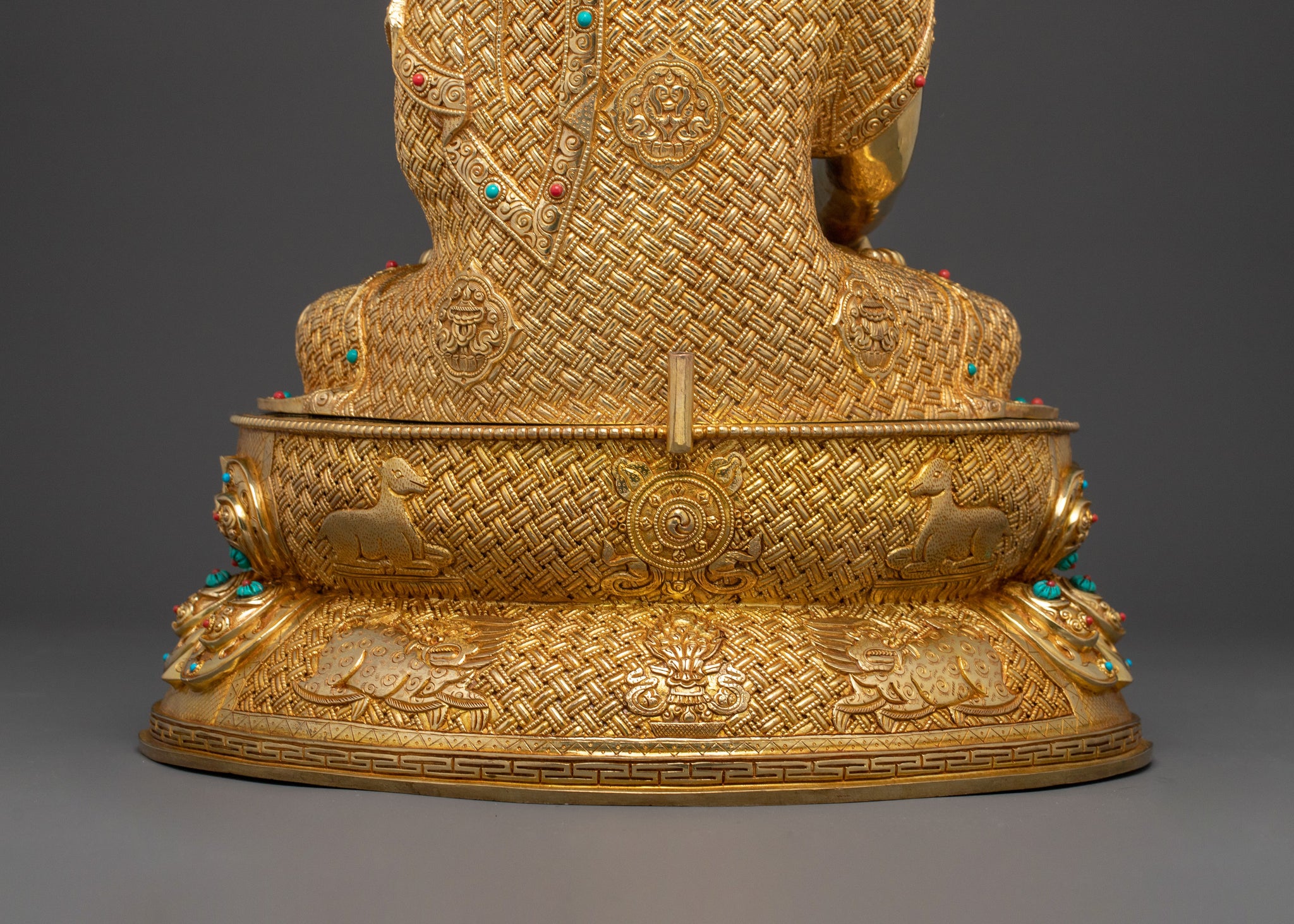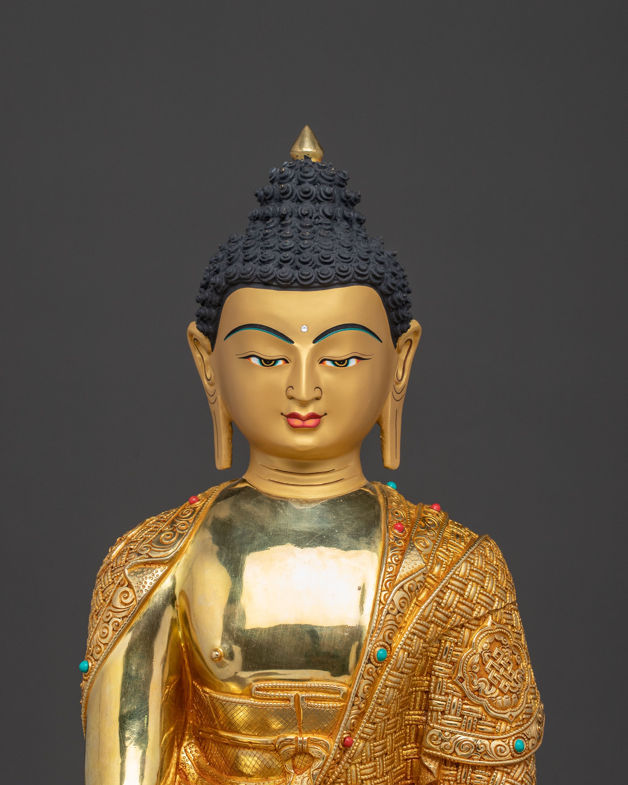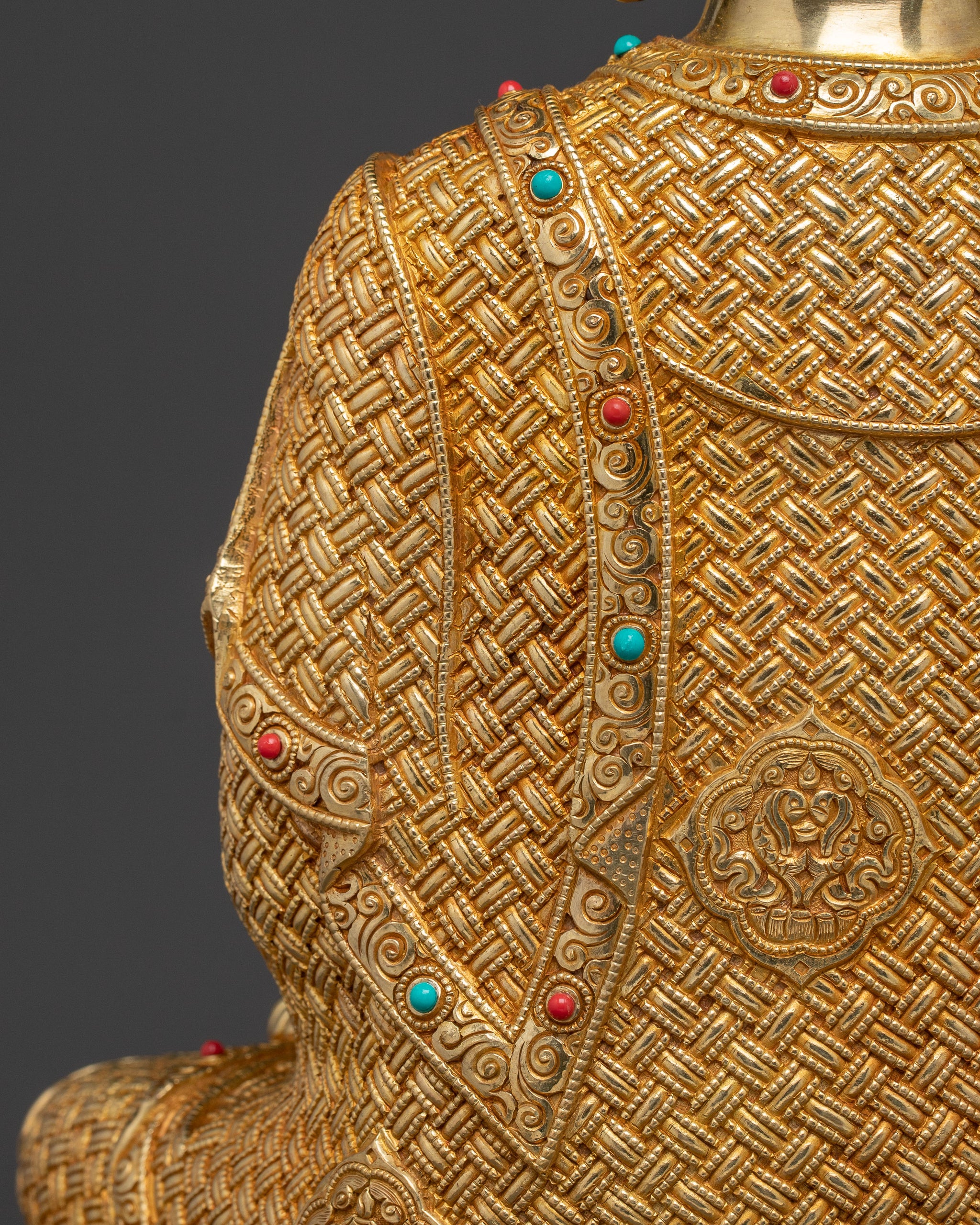 This Shakyamuni Buddha statue, known as the "Sage of the Shakya Clan," depicts the historical Buddha in serene enlightenment beneath the Bodhi tree. Seated in the Vajra posture (Padmasana) on a lotus base, his right hand is extended in the Bhumisparsha Mudra, while his left hand holds an alms bowl, symbolising renunciation. The ushnisha atop his head signifies wisdom, and the spiral curls represent the snails that shielded him from the sun during meditation. His serene face reflects inner peace. The surface features deeply engraved carvings that create a magnificent 3D-like effect, enhancing the statue’s divine presence.