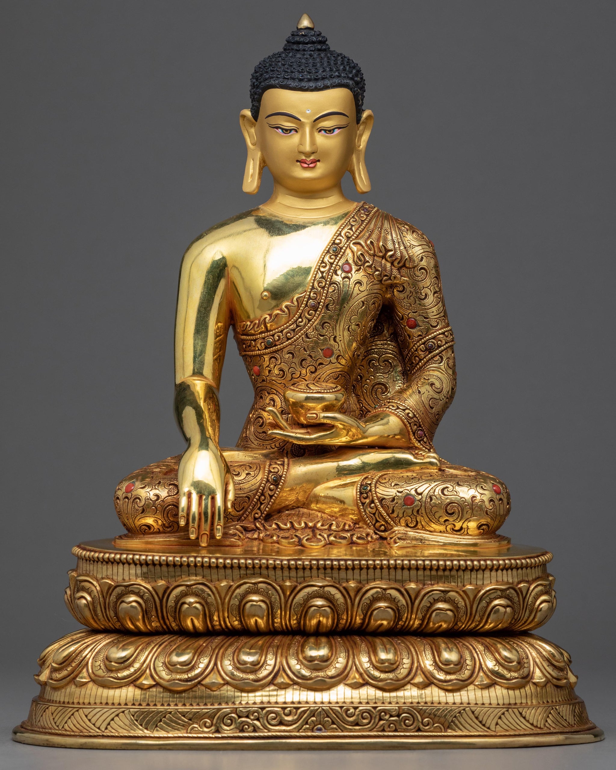 This Shakyamuni Buddha Gold Statue was crafted in our studio in Nepal with intricate design patterns exclusively done by the artists of Nepal. Hand carved from a copper body and flawlessly gilded with 24k genuine gold over the body of the statue. The deity seated peacefully above a moon disc lotus holds an alms bowl with his left hand while his right hand slightly touches the ground with his middle finger symbolizing his attained enlightenment. You can use this figurine for different Buddhist Rituals and meditational practices, and it will be a perfect gift for a practitioner like you.