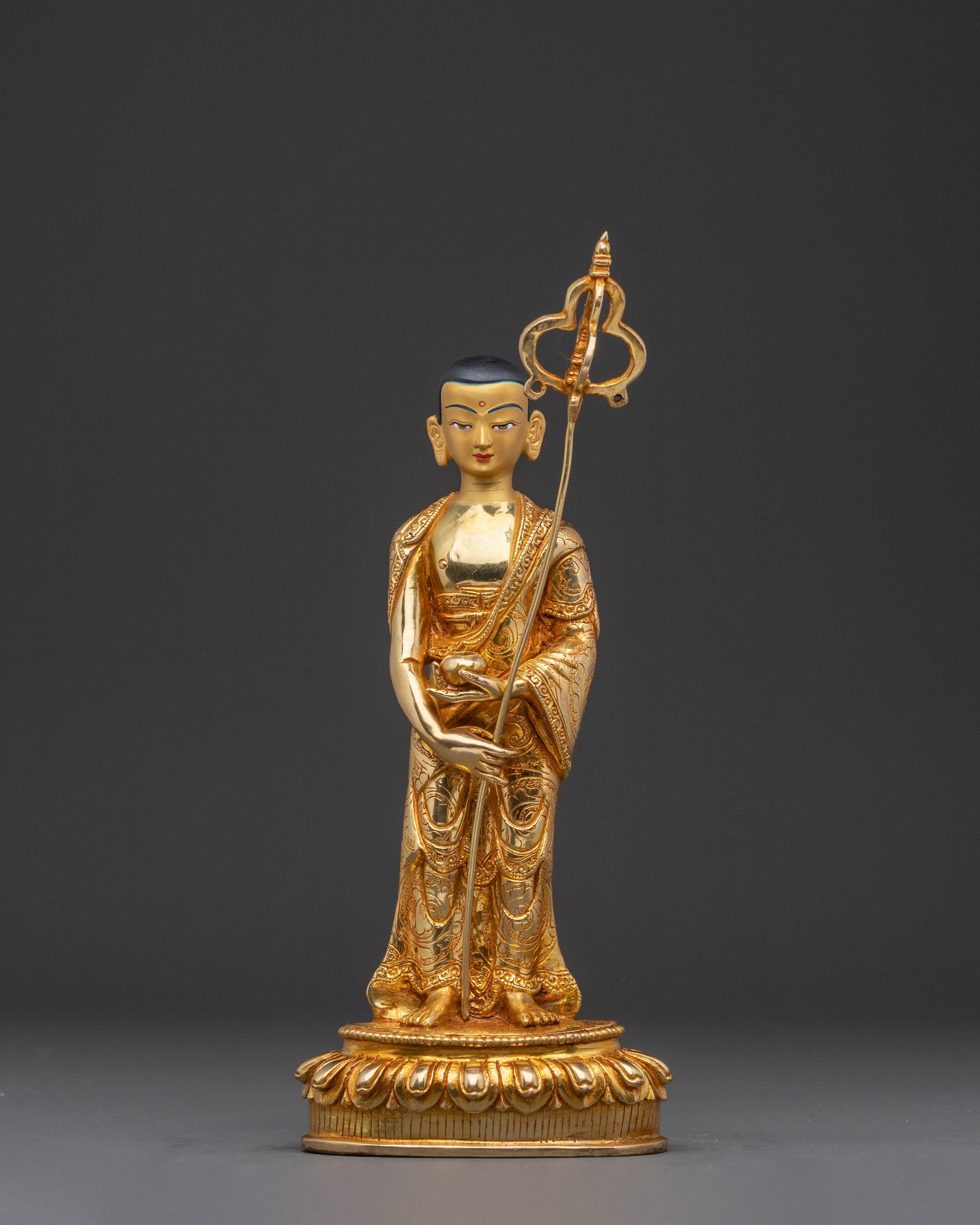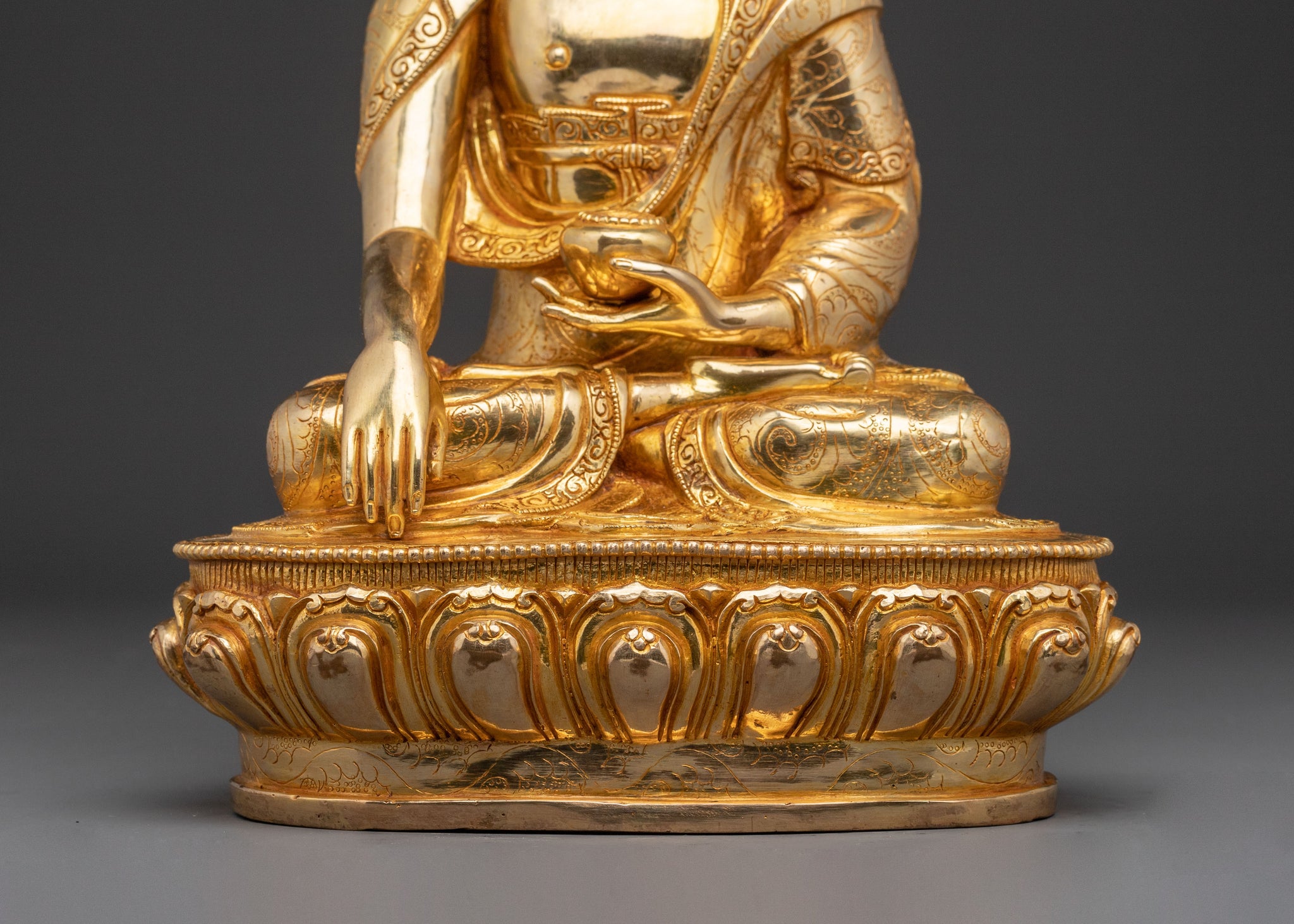 An exquisite Shakyamuni Buddha golden statue with disciples beautifully captures the enlightened one surrounded by his devoted followers. Crafted from a sturdy copper body, meticulously gilded with a triple layer of 24K gold and accented with vibrant acrylic paintings, it stands 34.5 cm tall with a 25 cm base and weighs 6.76 kg. Deeply engraved carvings create a striking 3D effect, emanating peace and a sense of spiritual presence in any sacred space. Made in Nepal.