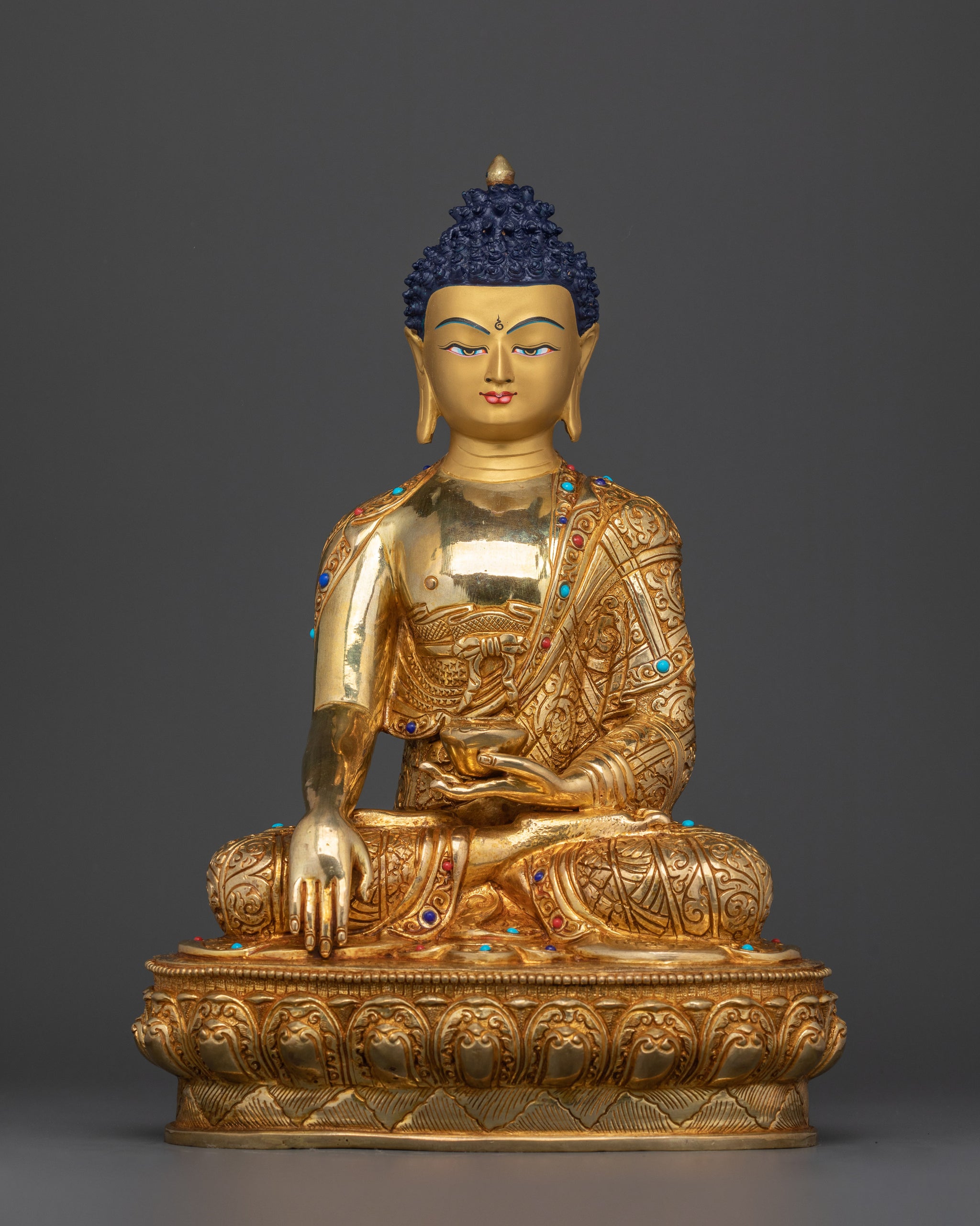 The Shakyamuni Buddha Handmade 23cm Statue, skillfully carved from finest copper, and plated in 24K gold. The statue's dazzling finish draws attention to it and amplifies its mystical presence. The Buddha statue is a welcome presence in any area because of his calm demeanor and traditional contemplative stance, which mirror the serenity and calm he represents.