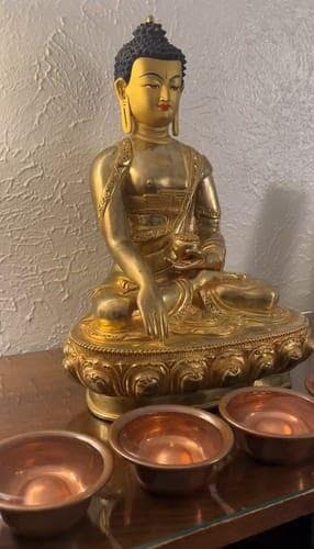 The high-quality copper statue embellished with delicate 24k gold gilding and acrylic paintings embodies a harmonious marriage of heritage and artistry. The expertly carved phrase adds a layer of spiritual depth, serving as a focus point for contemplation and meditation. This statue, a beacon of peace, asks you to pause, breathe, and absorb the serenity it represents.