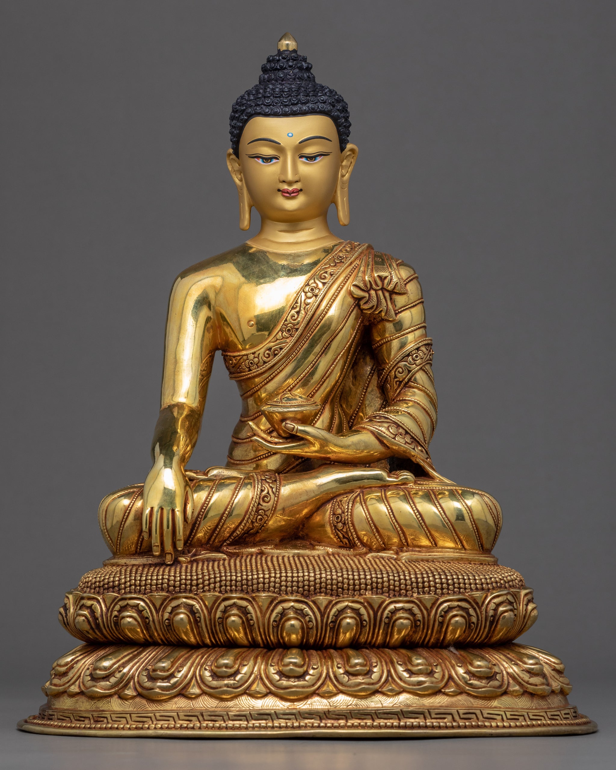 This delightful Shakyamuni Buddha Sculpture was created in our studio. We have a hand-carved Gautama Buddha with a serene expression sitting on a Lotus seat. He is holding a vase with his palm up, resting it on his lap, implying Dhyana Mudra on his left hand, and his right hand is extended to the ground, implying Bhumispara Mudra, a witness gesture. Shakyamuni Buddha statue was sculpted on the copper body and gilded with genuine 24k gold.
