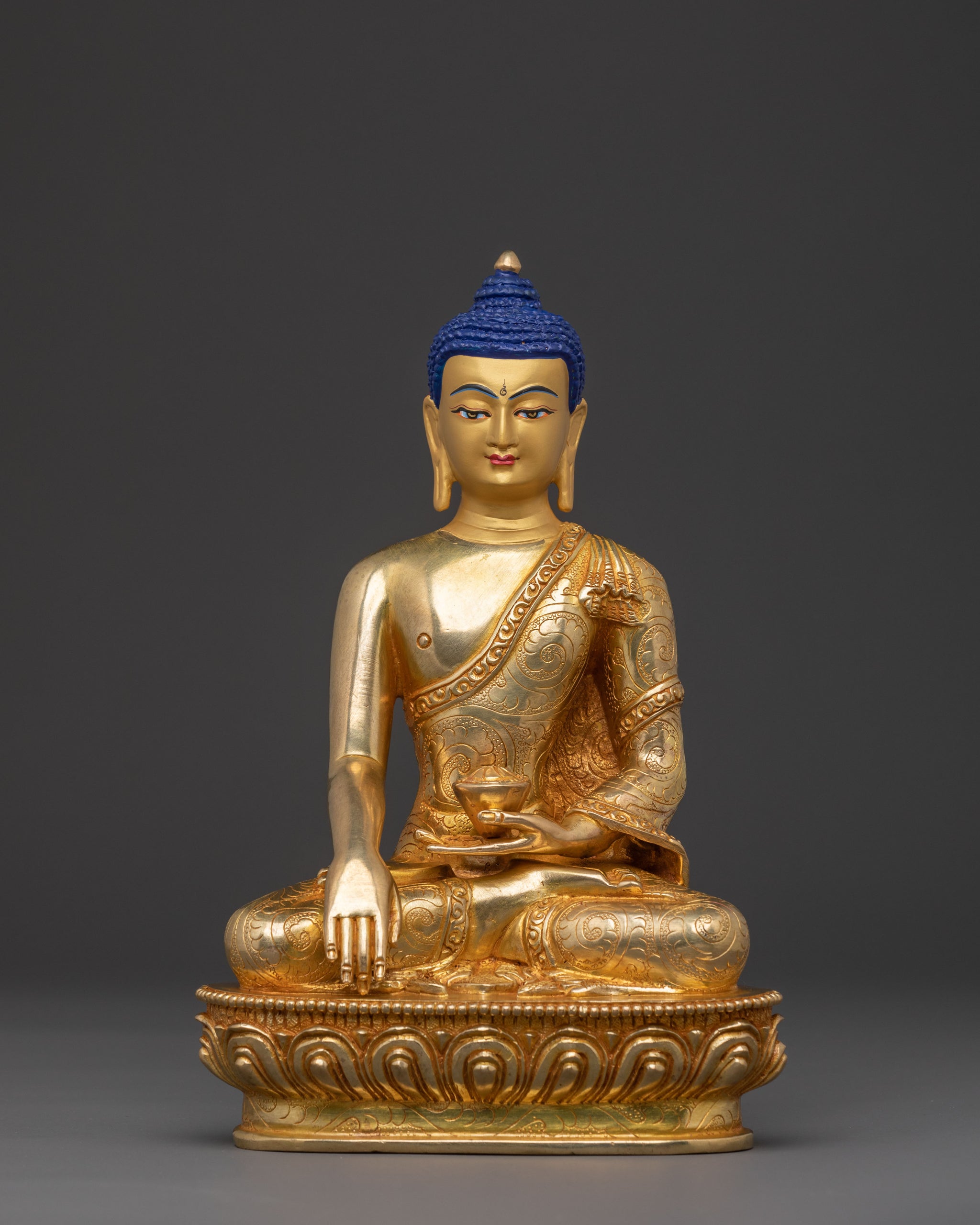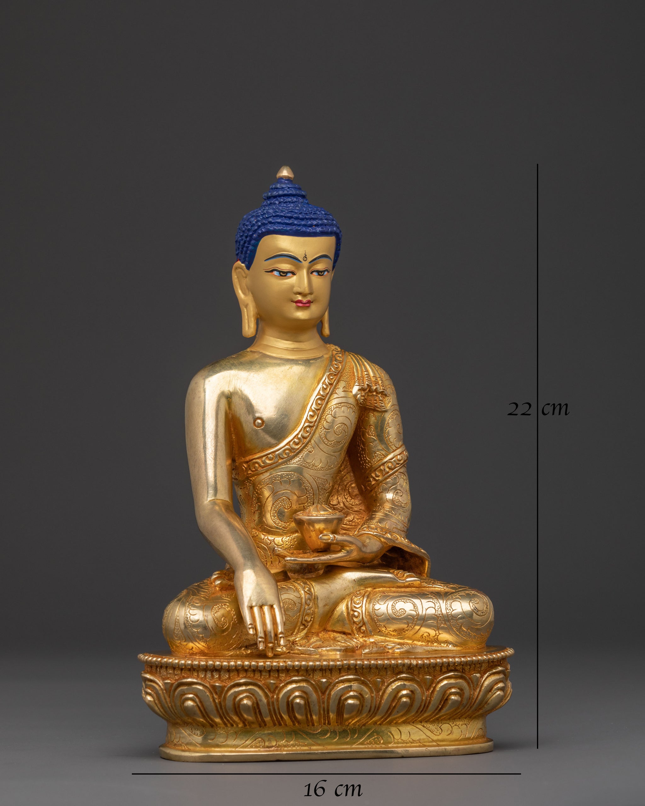 From the heart of Nepalese artistry, a Shakyamuni Buddha statue, boundless compassion arises, radiating profound serenity. This exquisitely handcrafted piece, standing 8.66 inches (22cm) tall with a 6.3-inch (16cm) base, brings a peaceful presence to any sacred space. Fashioned from a durable copper body, its form is adorned with lustrous 24K gold gilding, highlighting the meditative posture of the enlightened one. Weighing 1.53 kg, it feels substantial and imbued with spiritual grace.