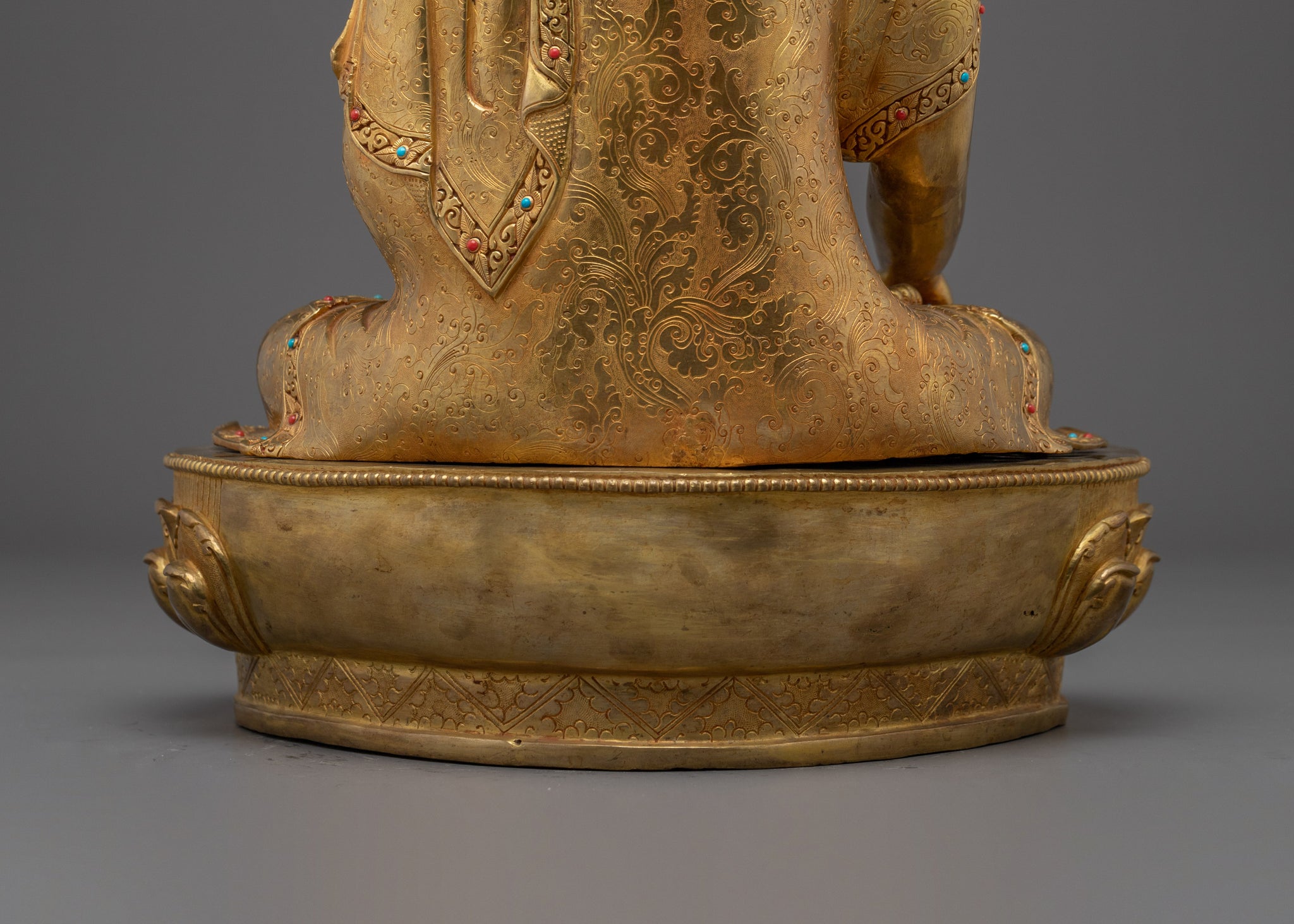 This Handmade Golden Shakyamuni Buddha Statue represents the historical Buddha, Siddhartha Gautama, who attained enlightenment under the Bodhi tree. Crafted from a copper body and adorned with 24K gold gilding along with intricate gold and acrylic paintings, this piece reflects the refined craftsmanship of skilled Nepali artisans. Ideal for altars, meditation spaces, or personal spiritual collections, it inspires mindfulness, serenity, and inner wisdom.