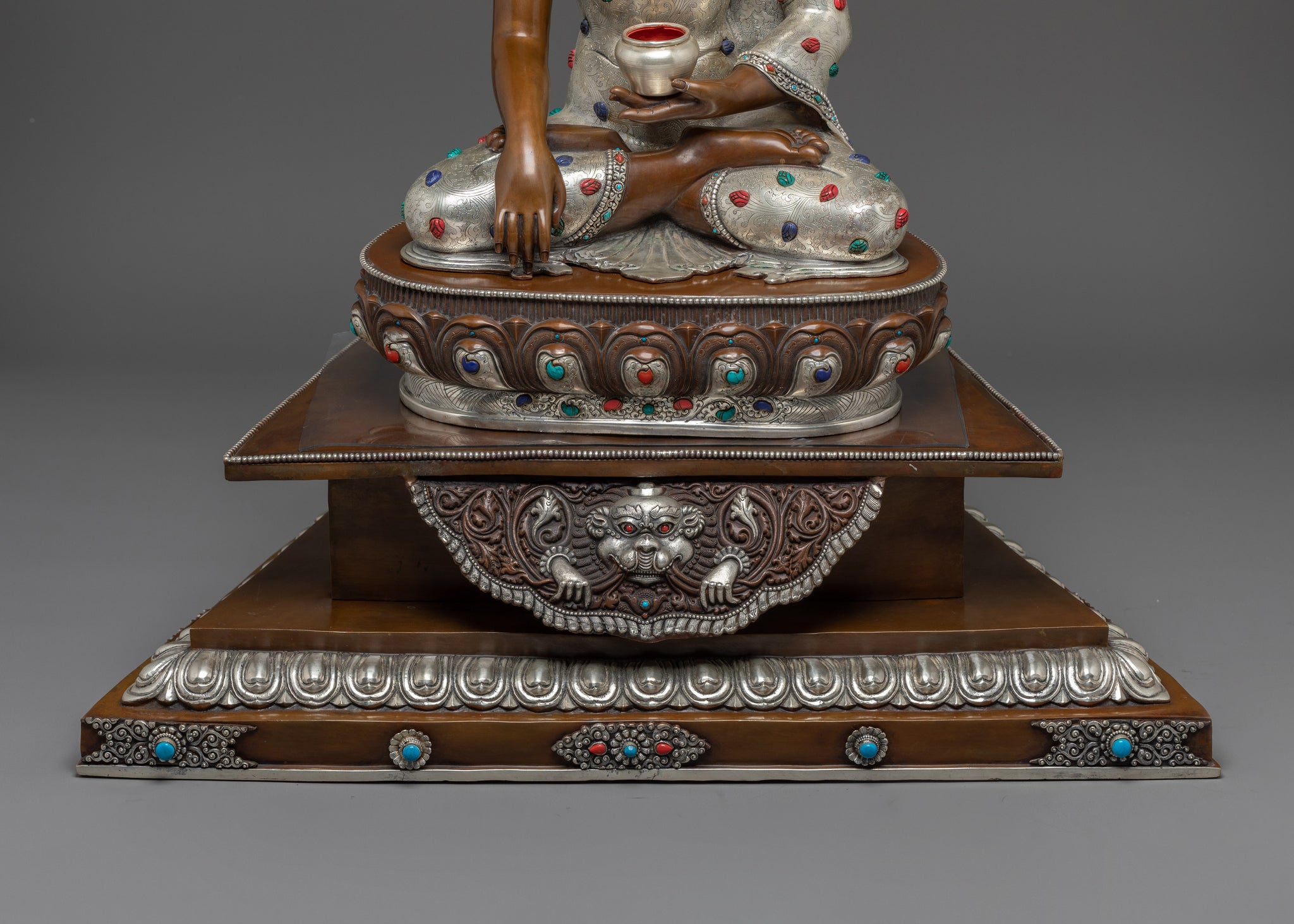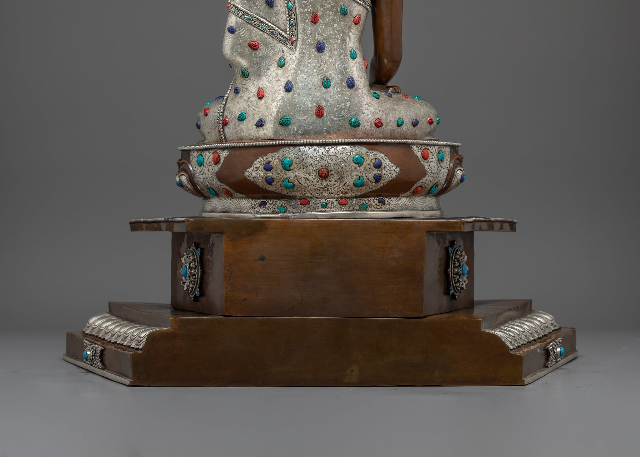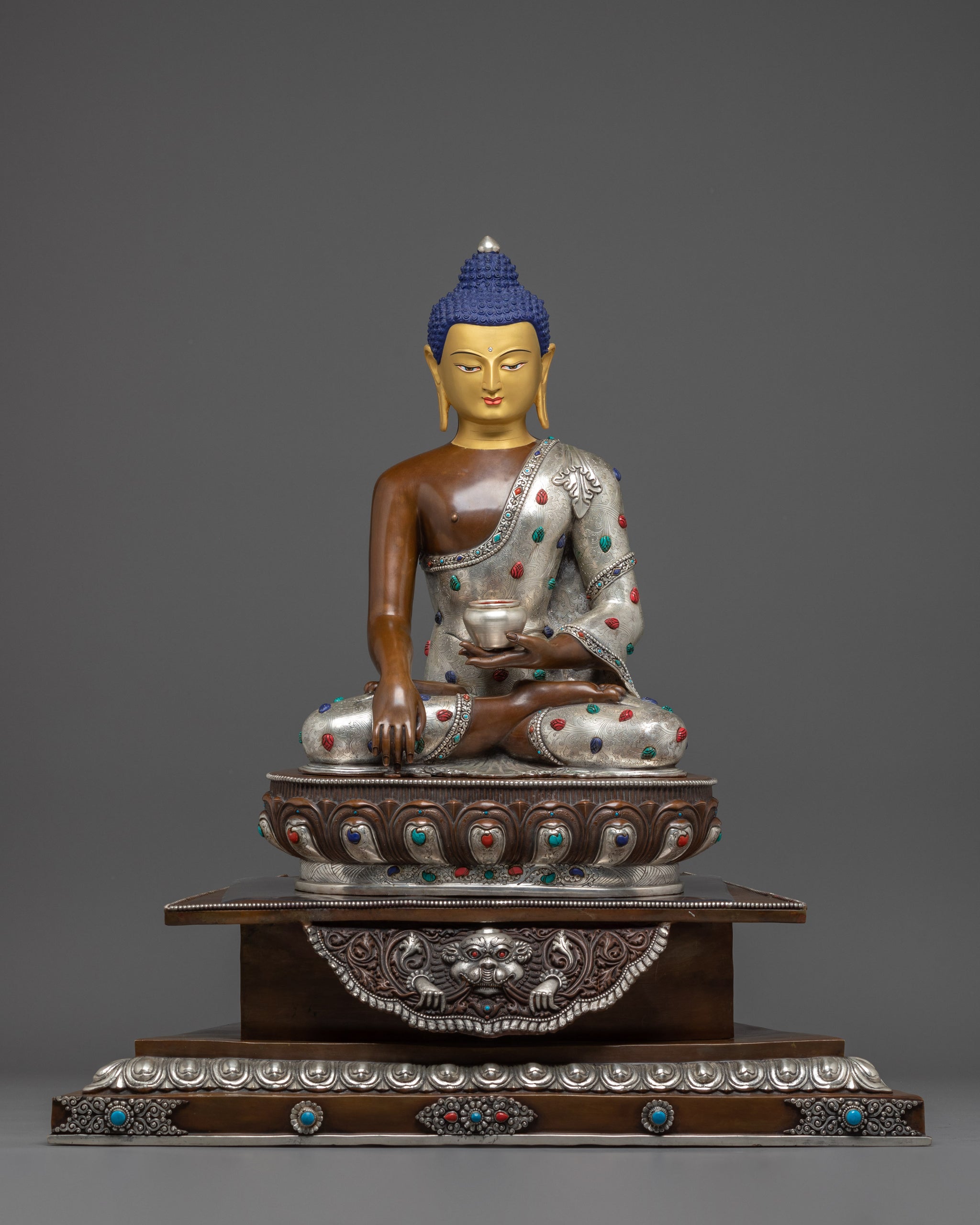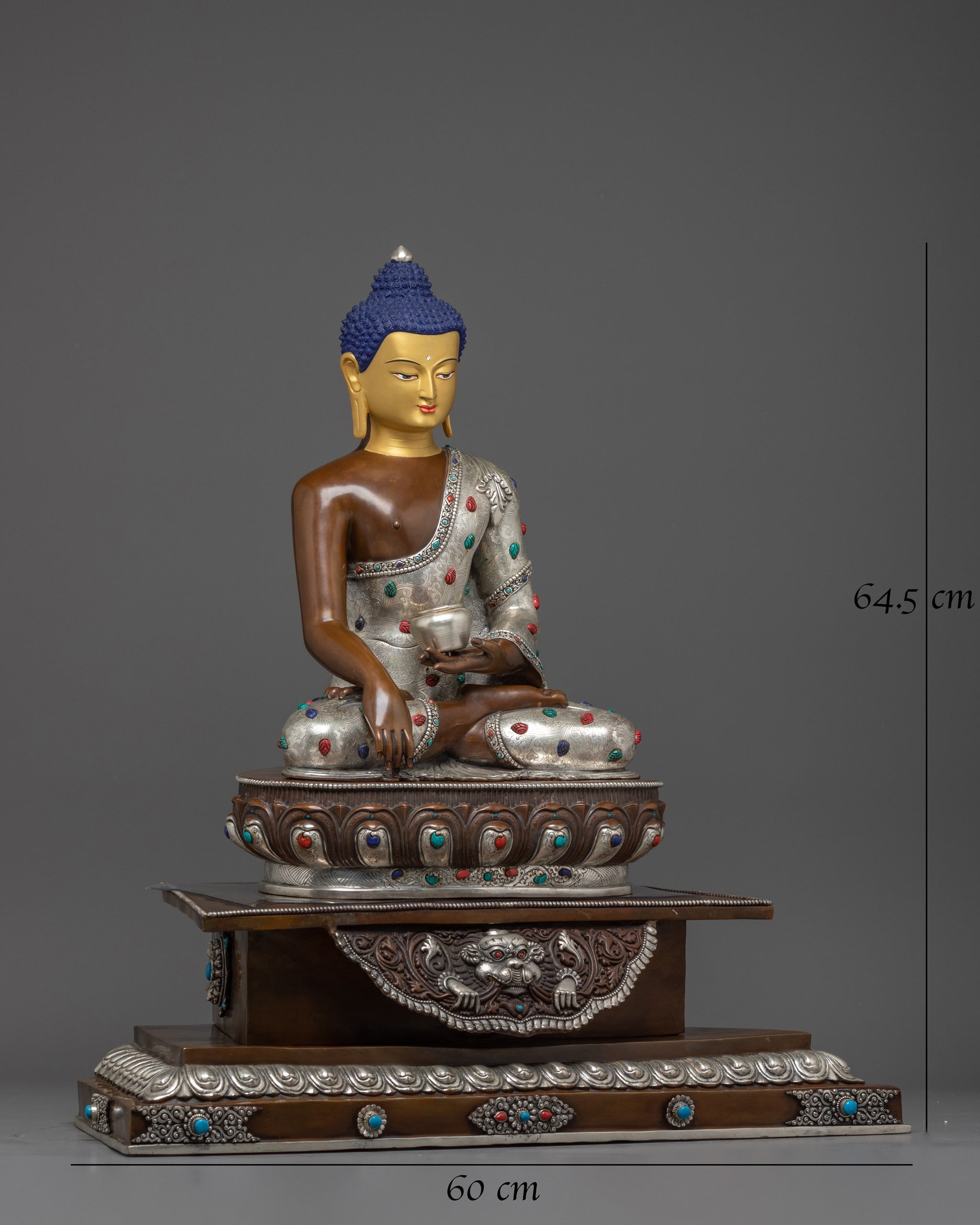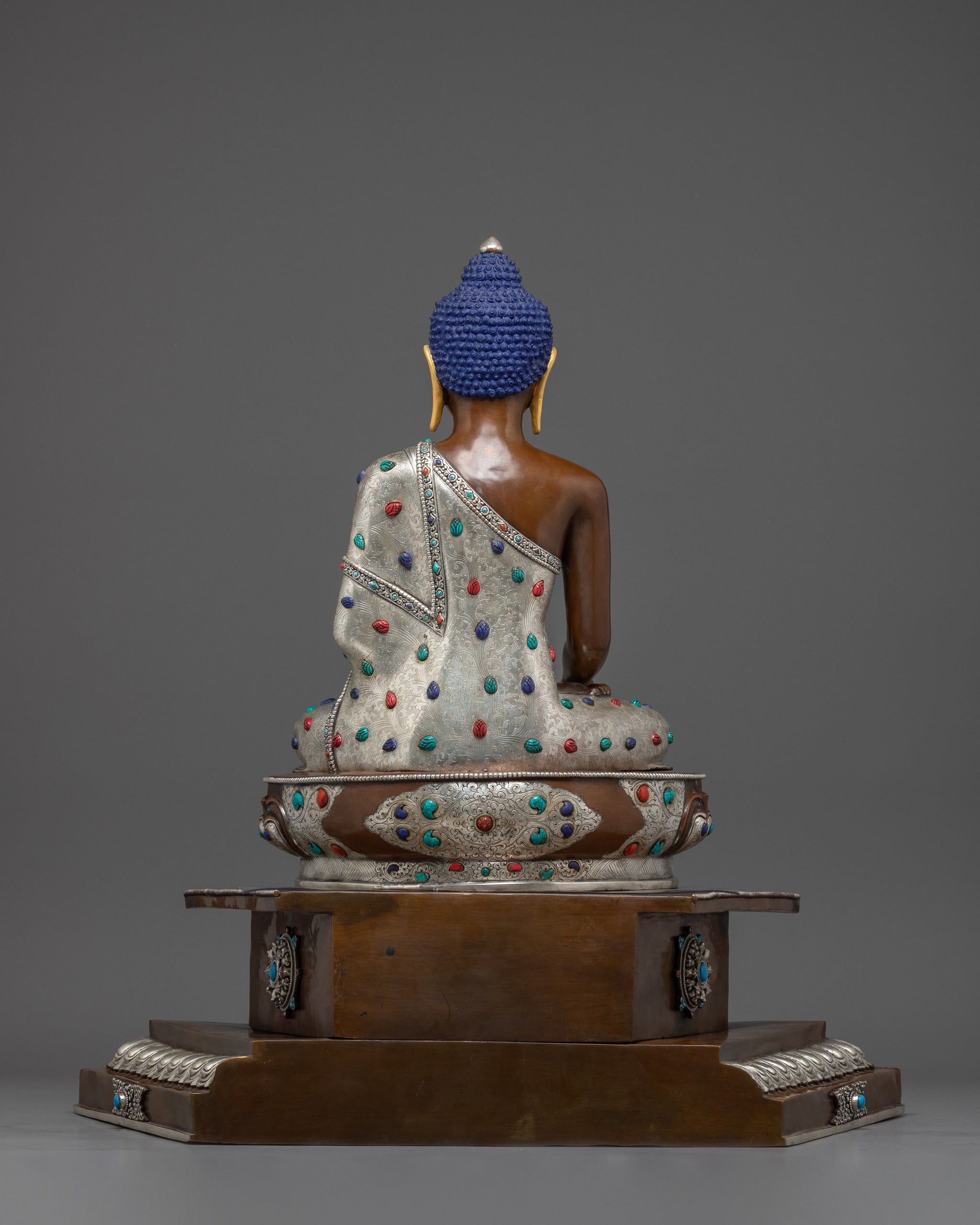 Shakyamuni Buddha Statue Seated on a Throne | Silver Plated, & Gemstone Detailing