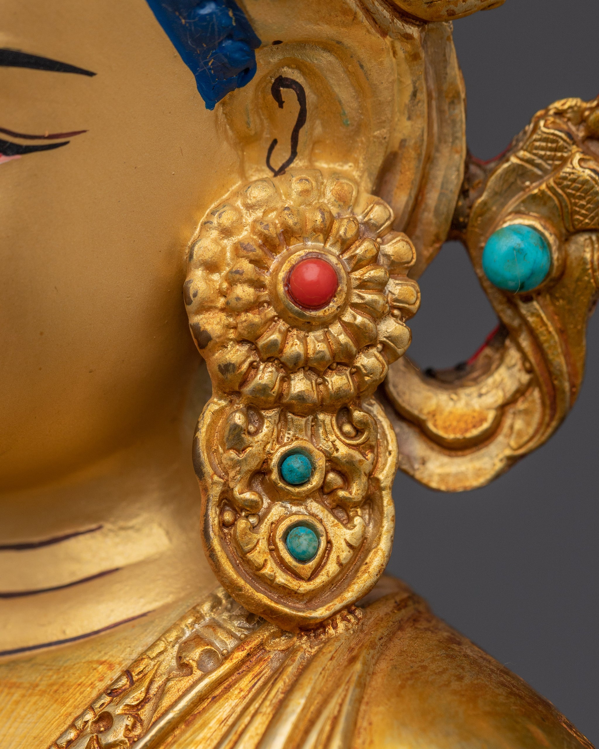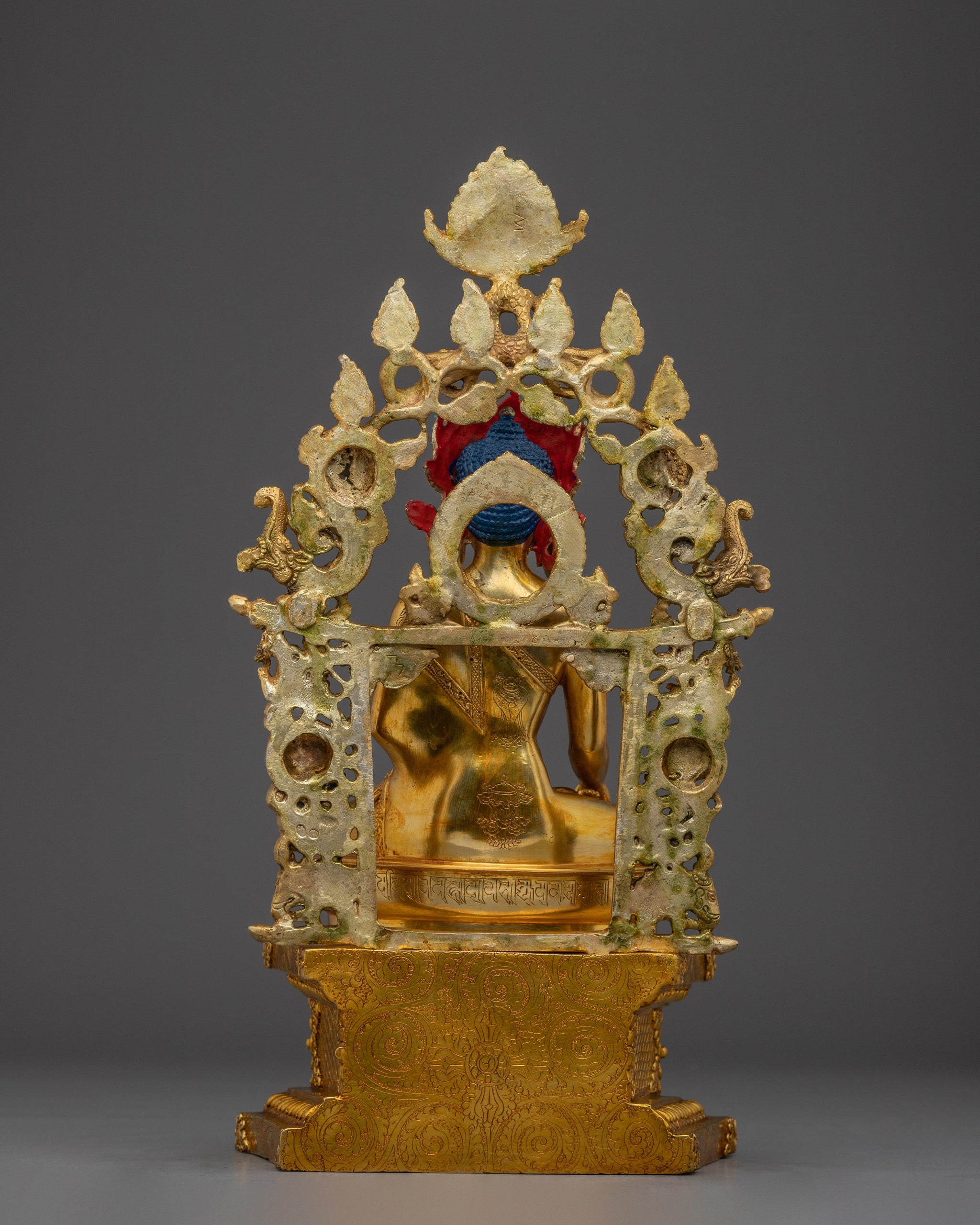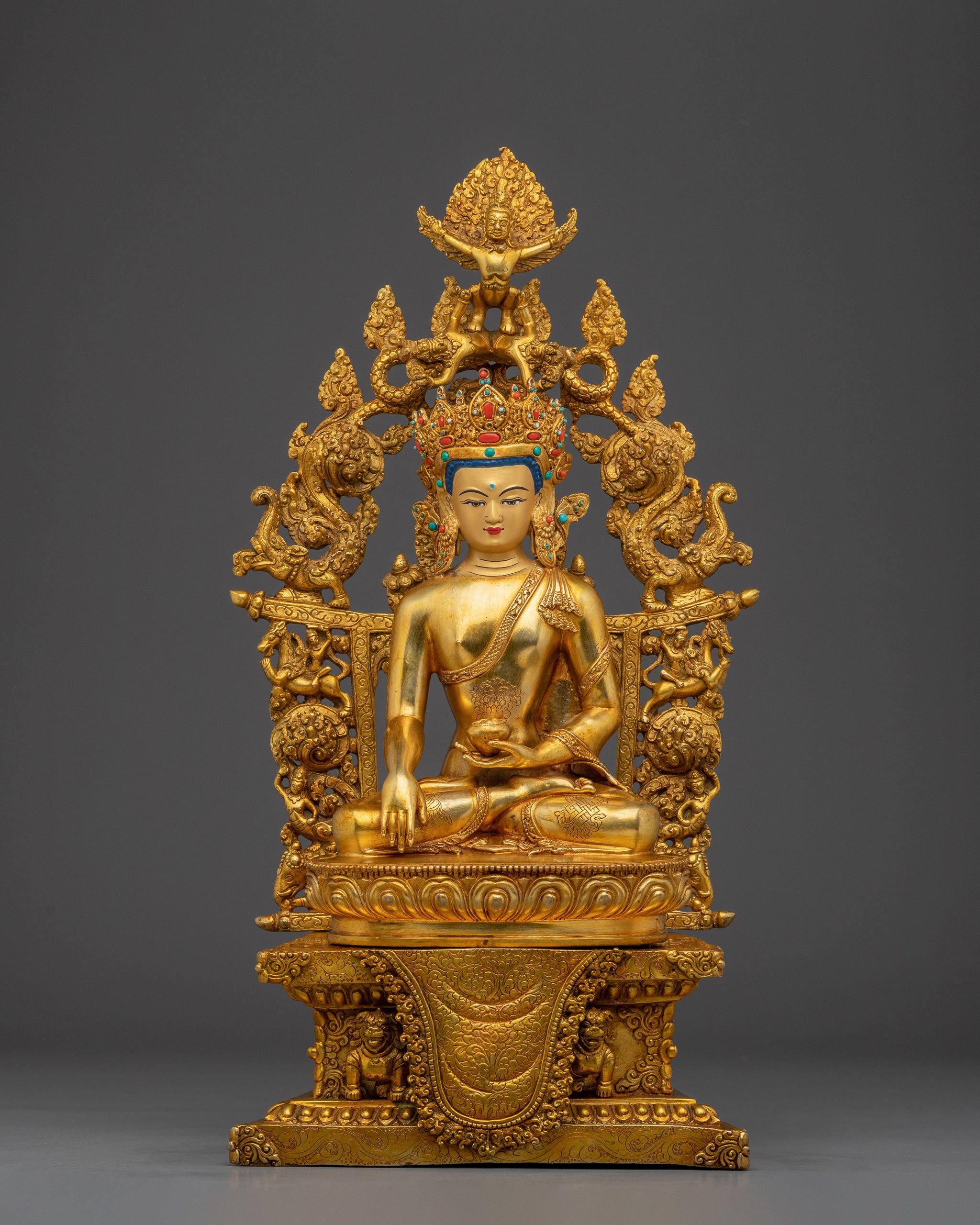 In his iconography, Shakyamuni Buddha is portrayed seated in padmāsana atop a beautifully adorned throne, symbolizing spiritual awakening and stability. His right hand is in the bhūmisparśa mudrā, touching the earth to witness his moment of enlightenment beneath the Bodhi tree. The left hand holds an alms bowl resting in his lap, signifying renunciation and the simplicity of a monastic life. He wears a five-pointed crown, representing the Five Dhyani Buddhas and the embodiment of awakened wisdom. The elaborate throne features intricate makara carvings and lions at the base, symbolizing protection, power, and fearlessness on the path to liberation.